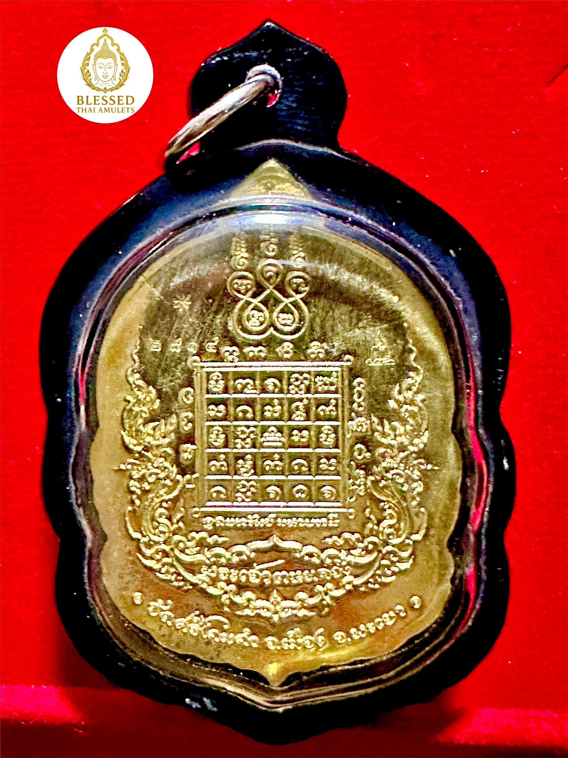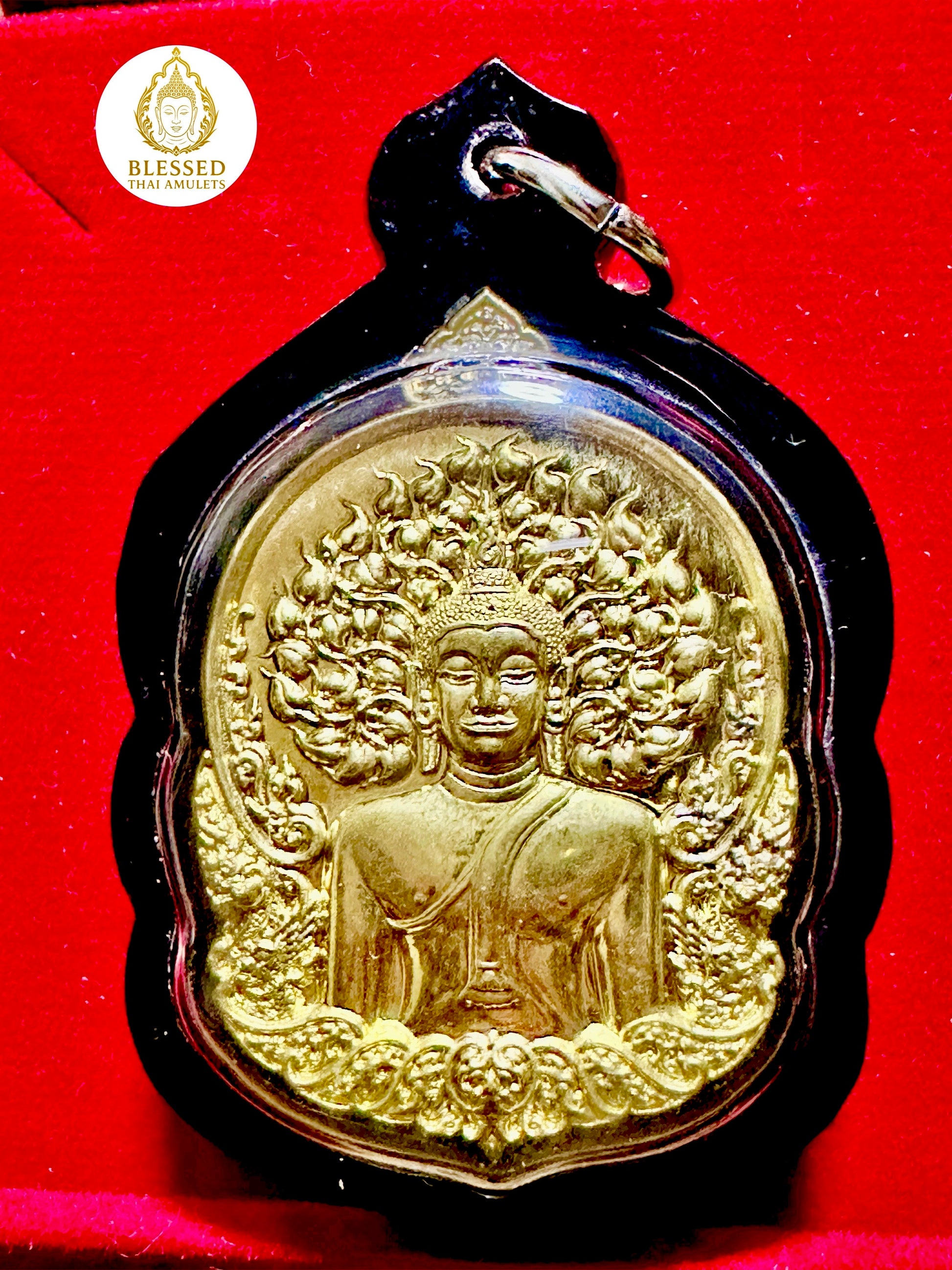 This majestic amulet features the Buddha seated in serene meditation beneath the sacred Bodhi tree, symbolizing the moment of supreme enlightenment. The detailed aureole of Bodhi leaves behind him radiates spiritual clarity and awakening. The reverse side displays a beautifully inscribed 81-square yantra, framed by protective flame motifs and sacred script — a powerful charm for wisdom, spiritual growth, and protection on one’s path.