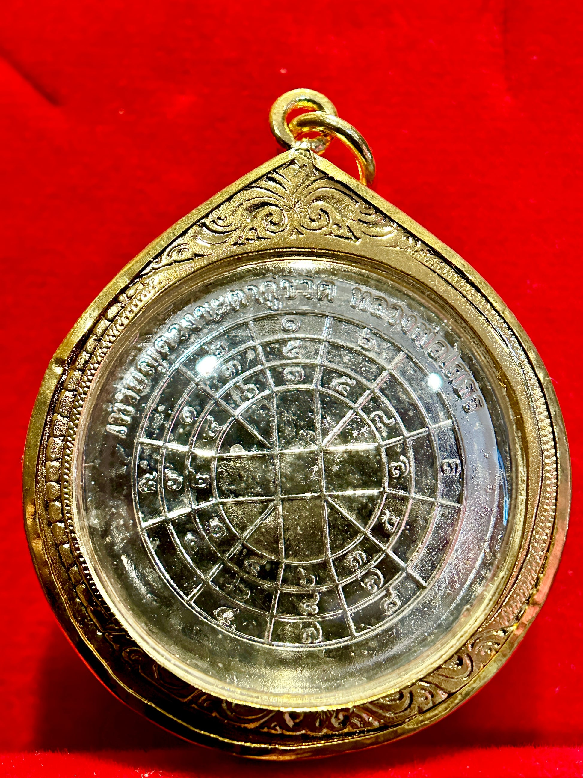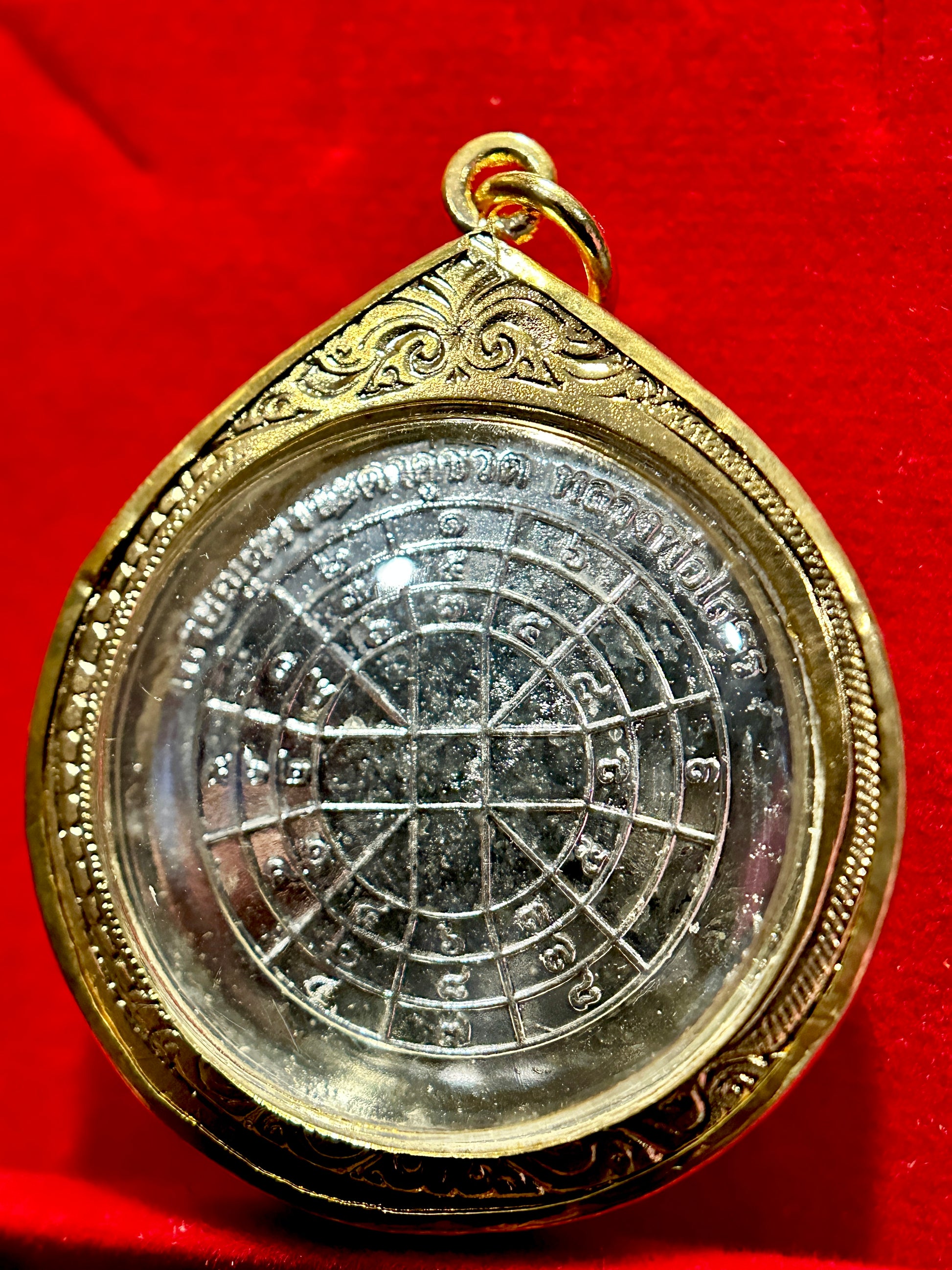 The reverse side bears a powerful yantra grid, meticulously inscribed with sacred numerology and mantras believed to protect the wearer from harm, deflect negativity, and attract good fortune.