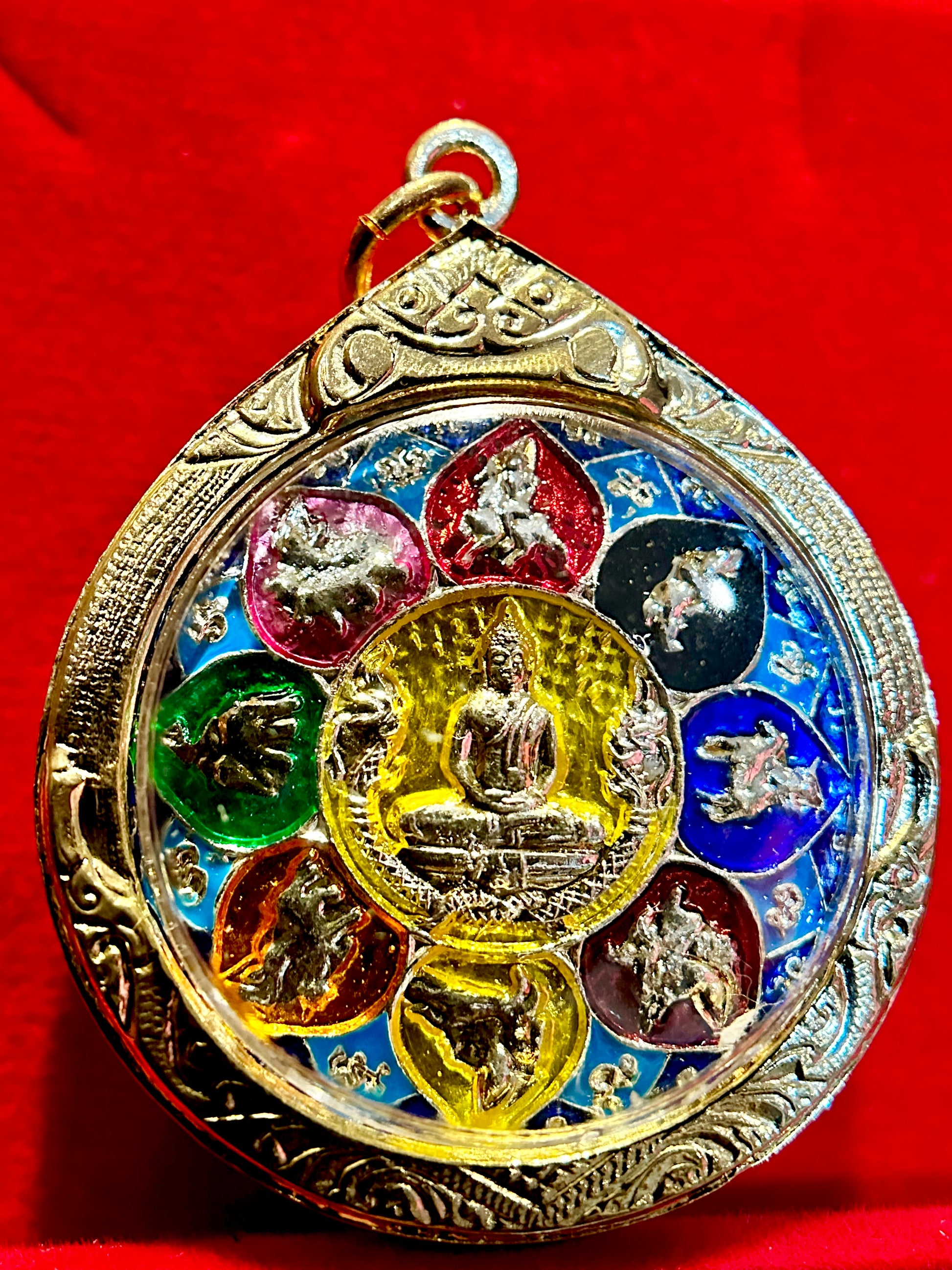 This radiant amulet features a seated Buddha in the center, symbolizing enlightenment, inner peace, and guidance. Surrounding the Buddha are eight sacred animals, each representing one of the directions in Thai-Buddhist cosmology. These animals embody protection, prosperity, health, wisdom, and balance in all aspects of life. The animals are carefully rendered in silver relief and set against a vibrant circle of multi-colored enamel—green, red, purple, blue, black, yellow, and orange—each color carrying its own spiritual significance of strength, balance, and renewal.