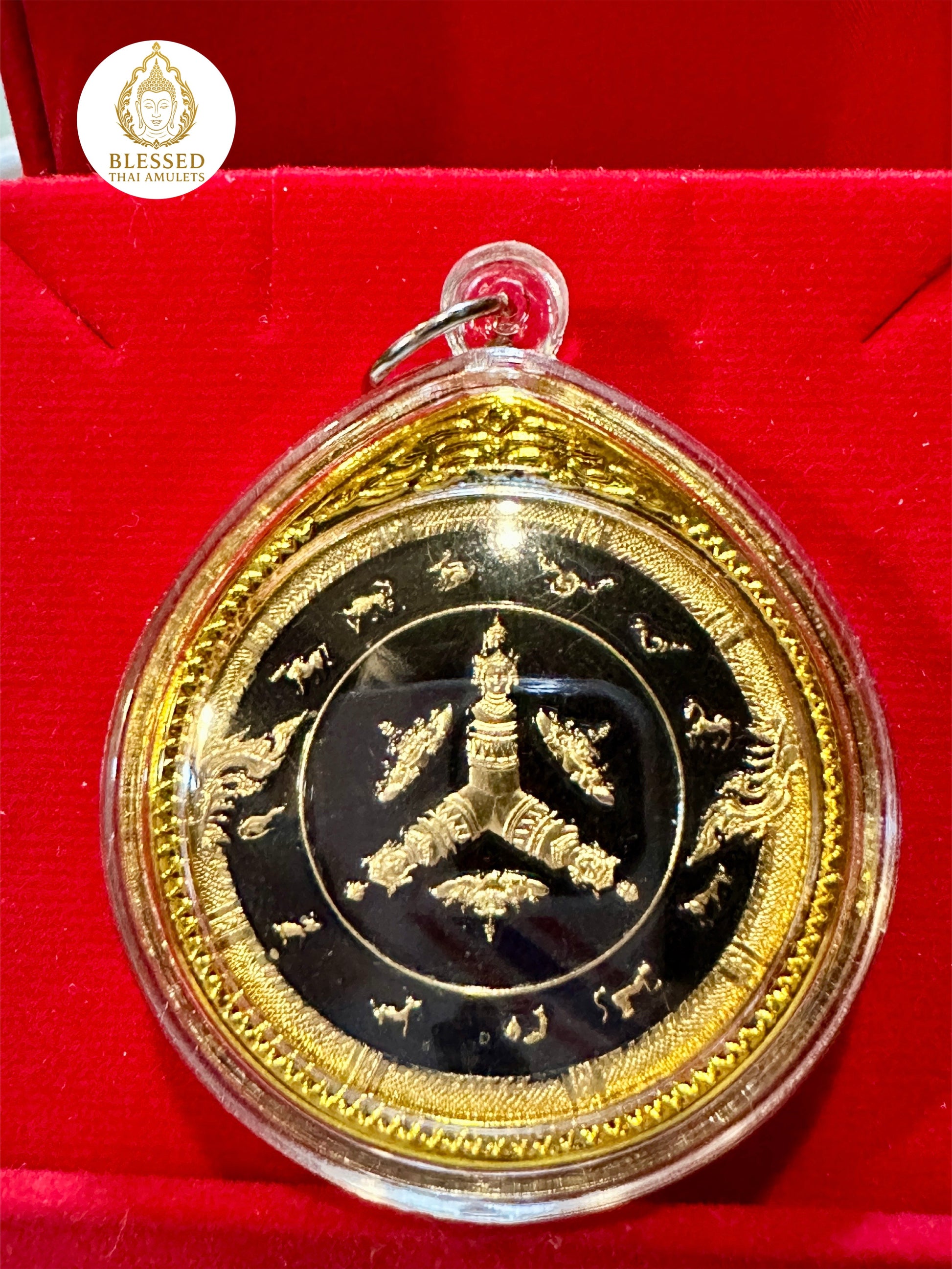 On the reverse, three majestic golden spires rise in a triangular formation—each representing sacred mountains or temples—encircled by floating umbrellas and mythical symbols, evoking cosmic balance and higher guidance. The use of deep black enamel and shining gold creates a powerful contrast, making this amulet both visually commanding and spiritually potent.