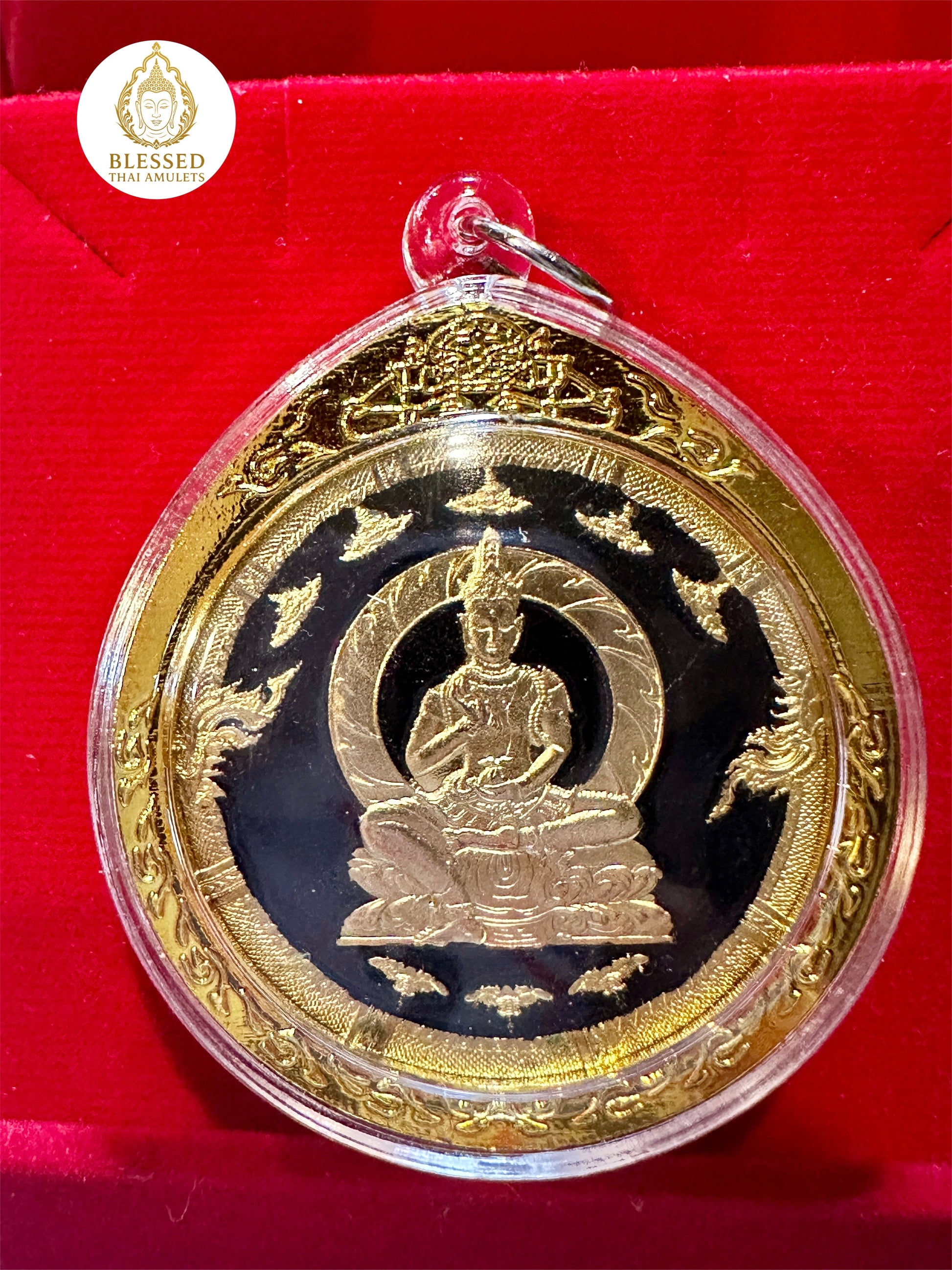 A striking amulet featuring a golden Buddha seated in deep meditation, surrounded by a radiant aura of celestial figures, each symbolizing divine protection and wisdom. Set against a sleek black background with gold trim, the front radiates clarity and spiritual elevation.