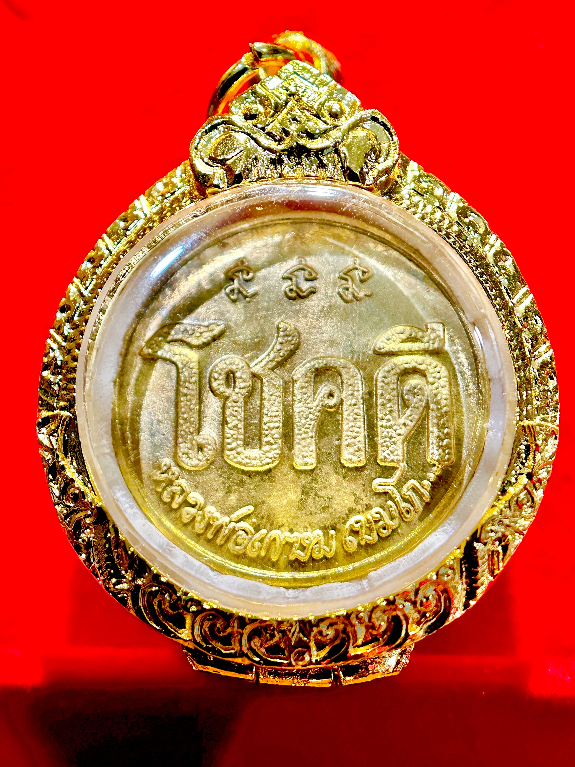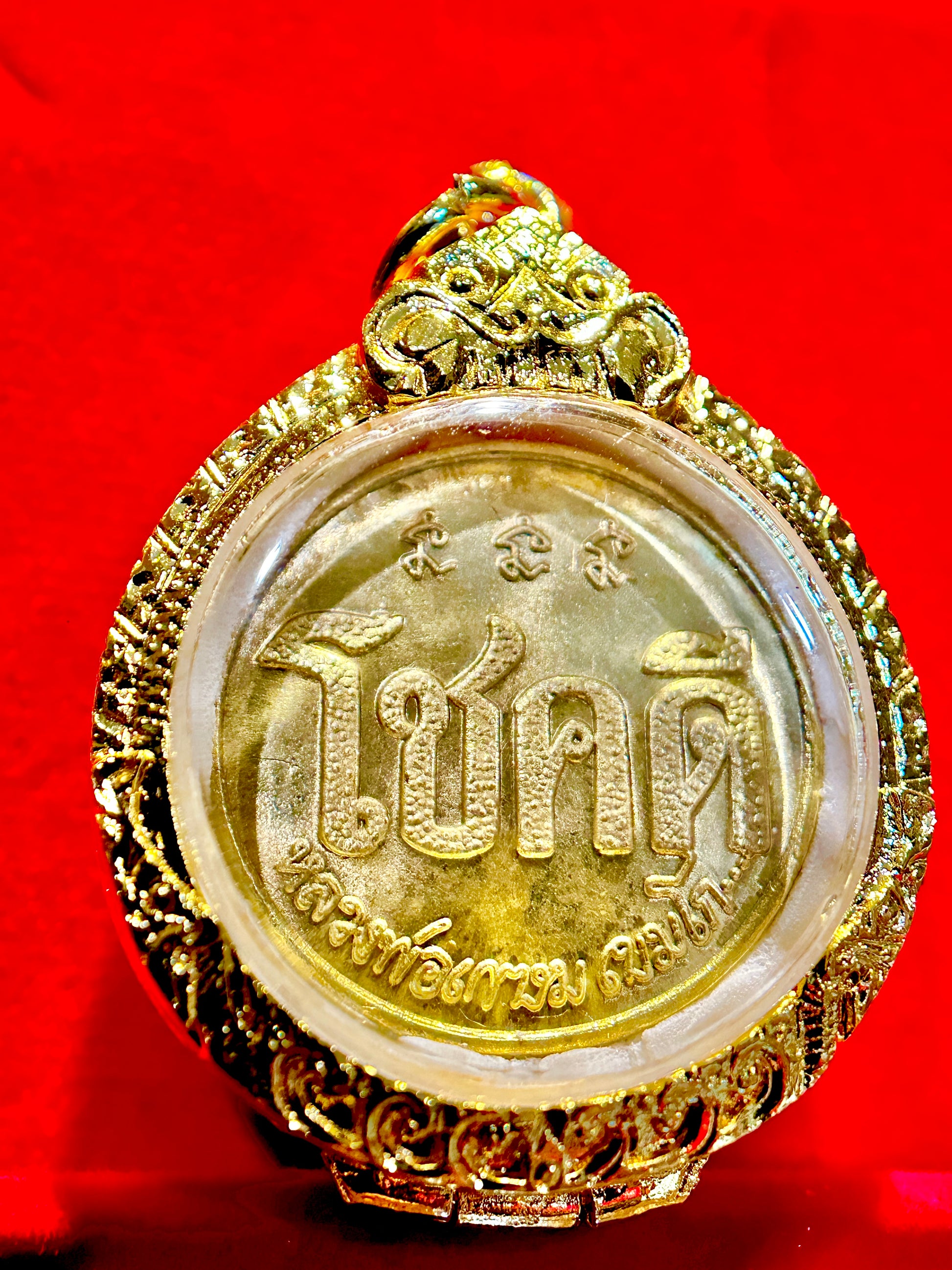 - Front: The face of the amulet is engraved with the large golden Thai inscription “โชคดี” (Chok Dee), meaning Good Luck. Set in a fully gold-toned finish with sacred inscriptions, it radiates energy for wealth, prosperity, and auspicious opportunities. The inscription below honors Luang Phor Kaew, a respected monk known for his consecrated amulets.