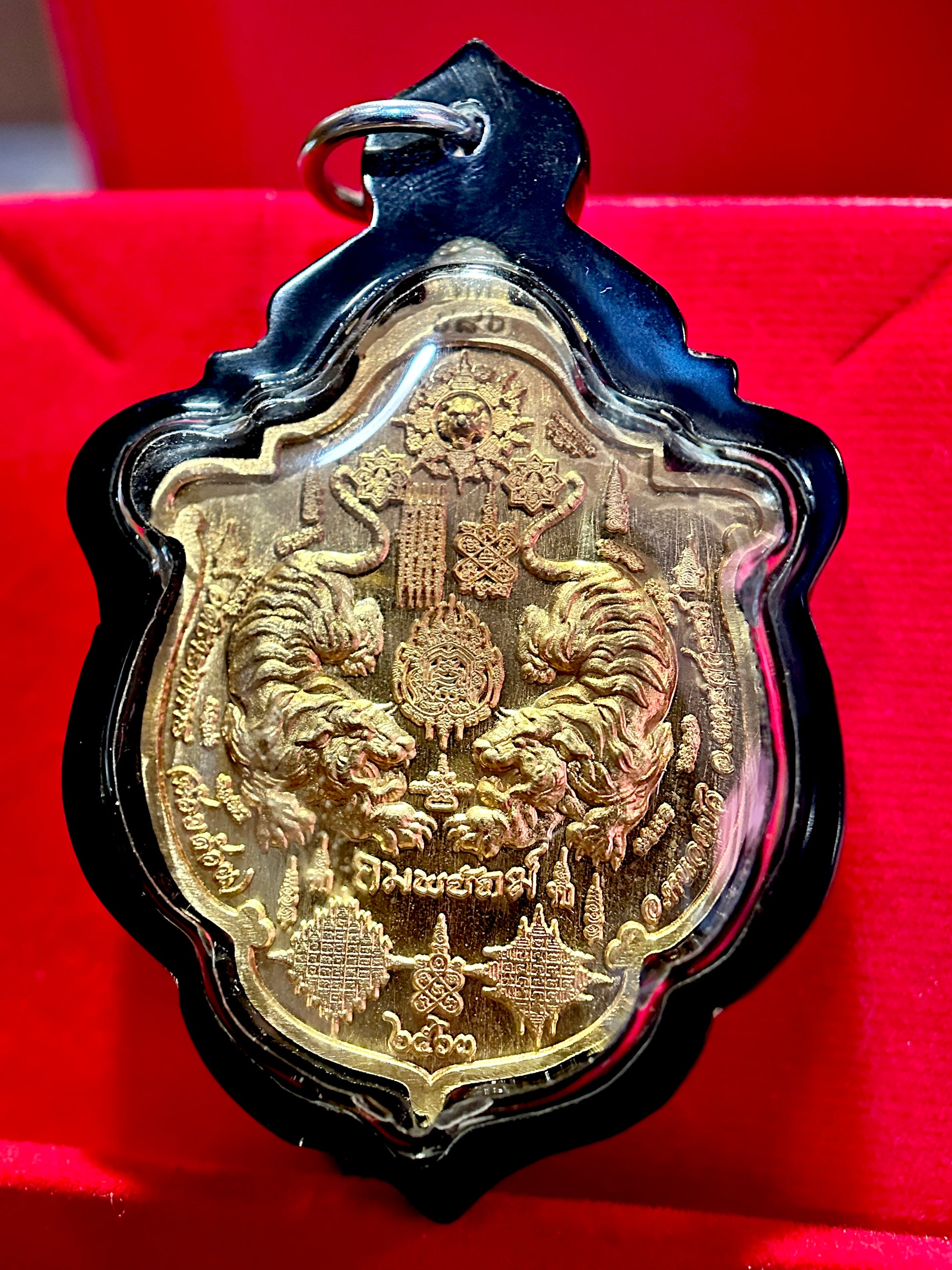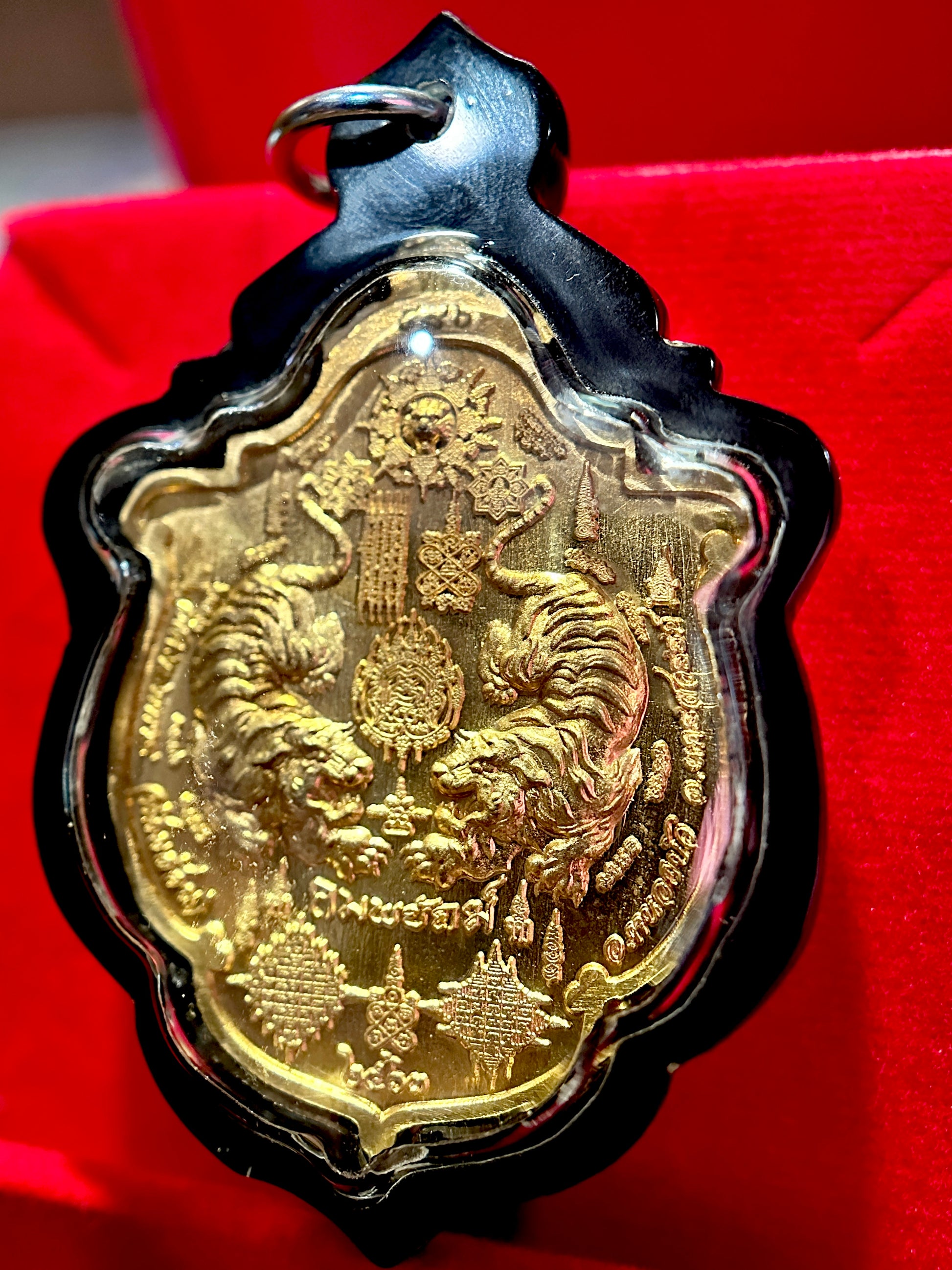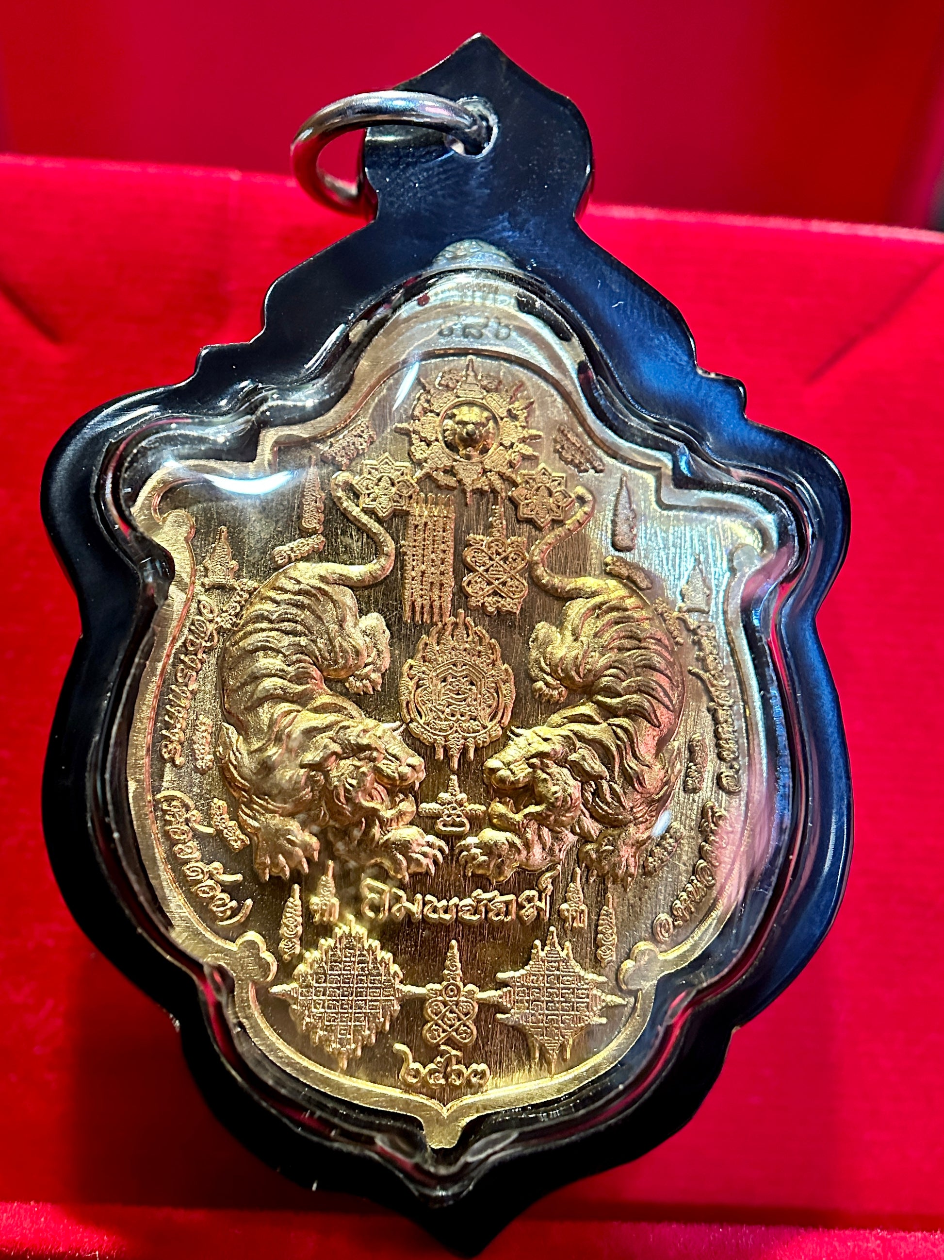 The reverse side is equally striking, showcasing two powerful tigers facing each other amidst yantra symbols and sacred inscriptions. The word “Sinlapachai” is inscribed in Thai, signifying victory and auspicious success. This amulet embodies dominance, invincibility, and sacred charm—ideal for those seeking protection, good luck, and personal power.