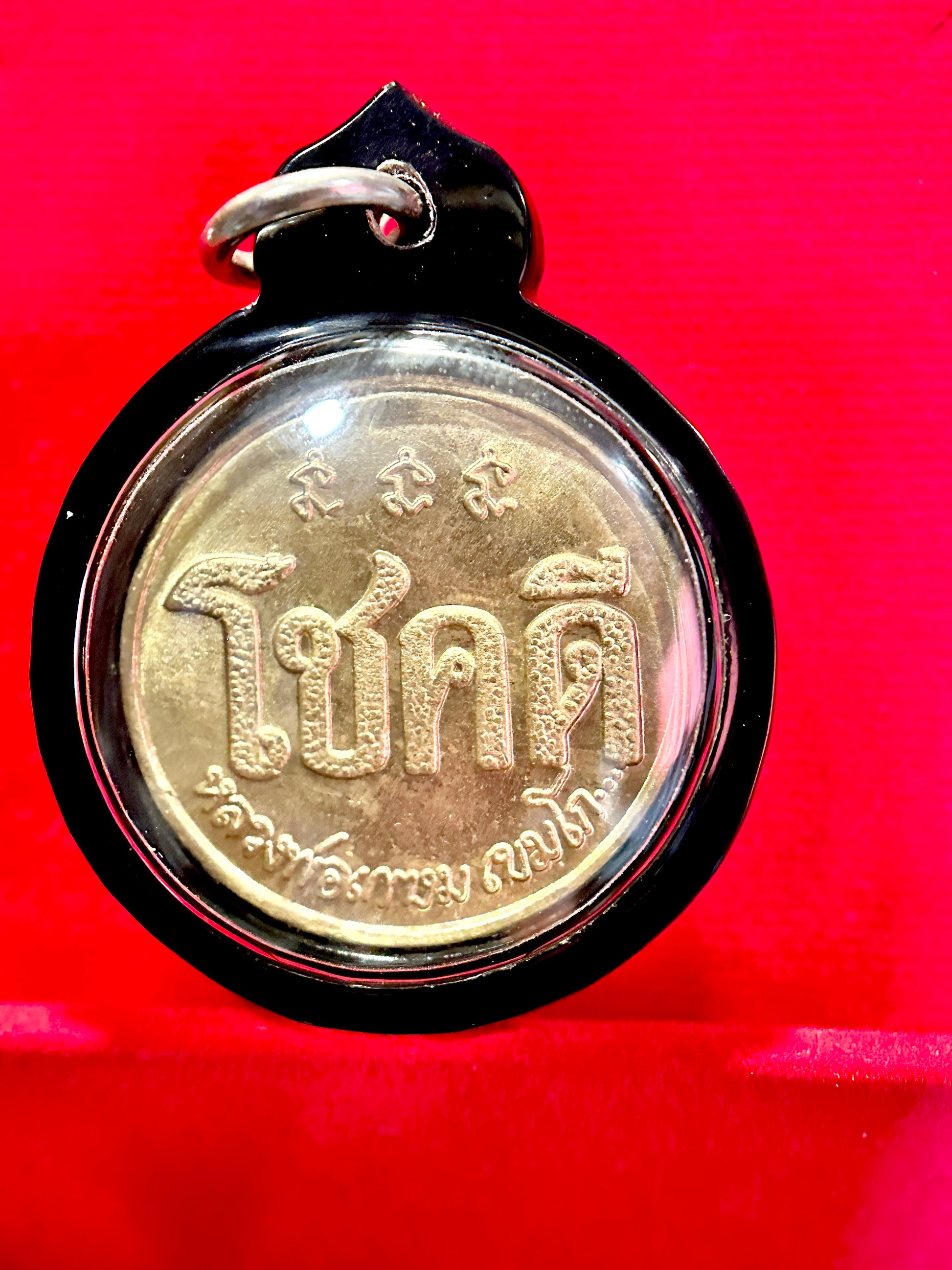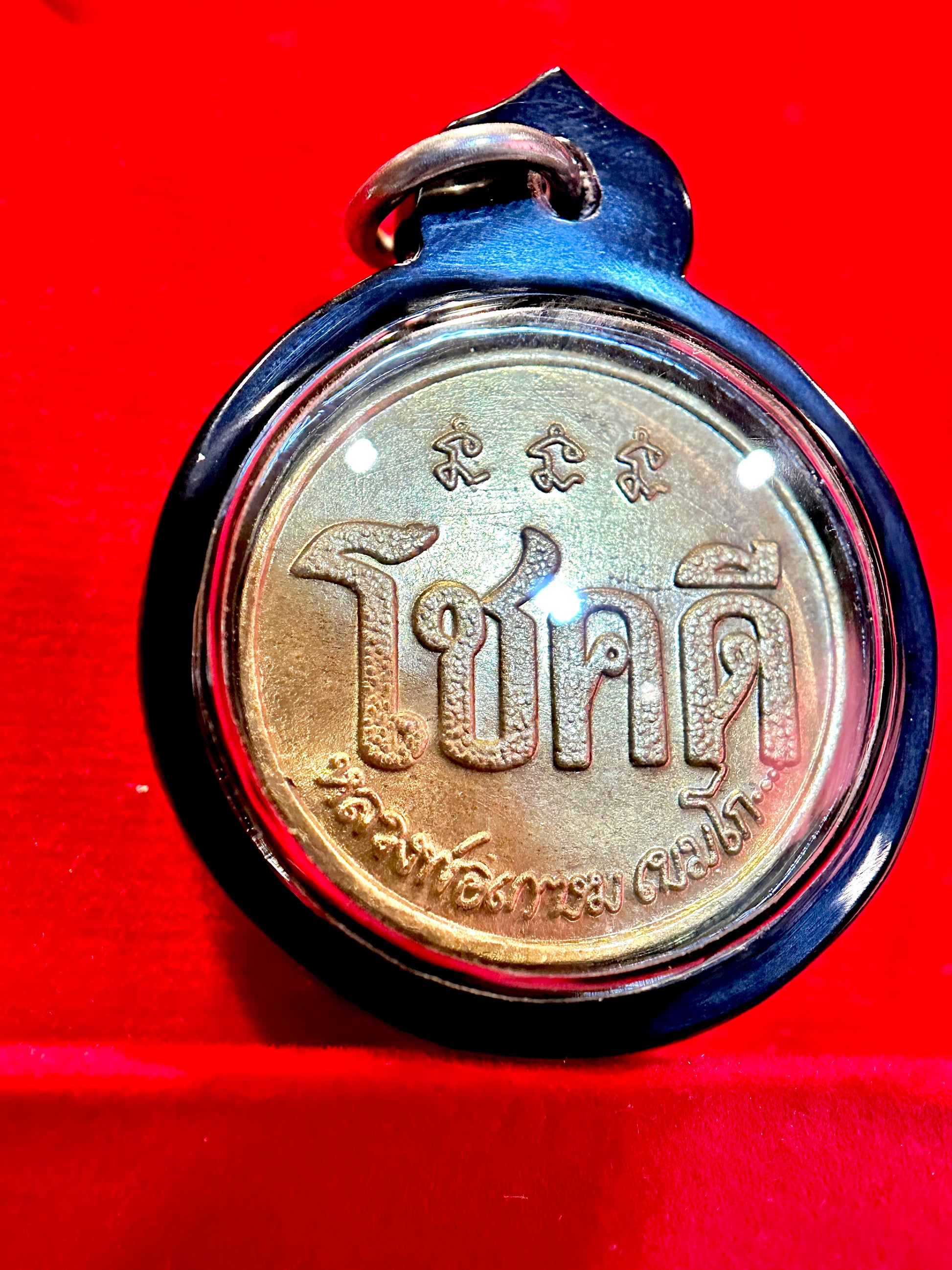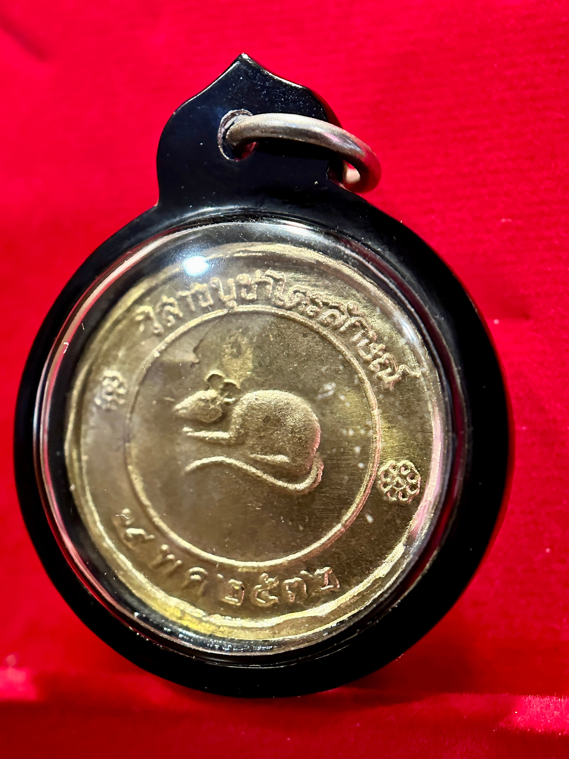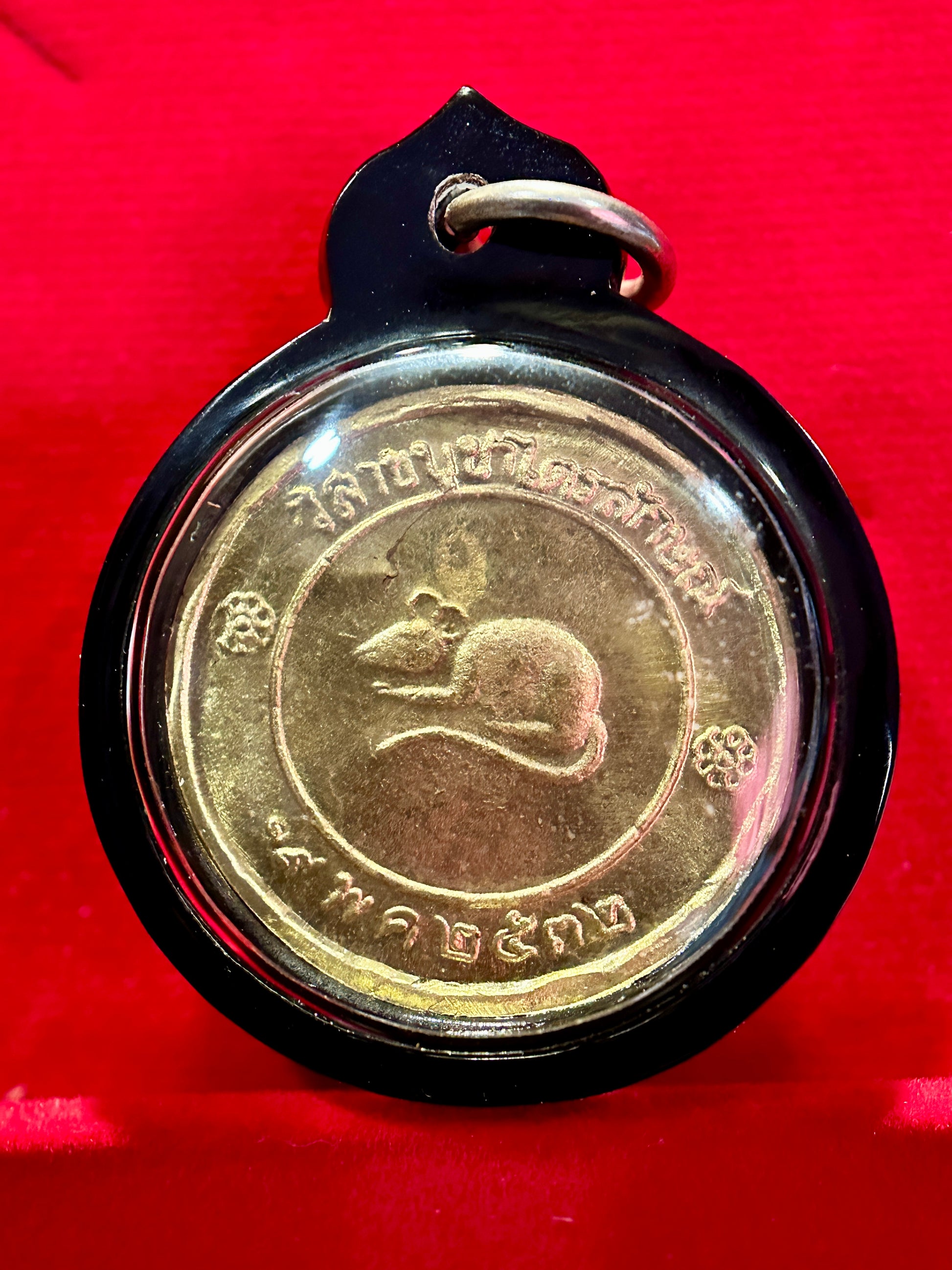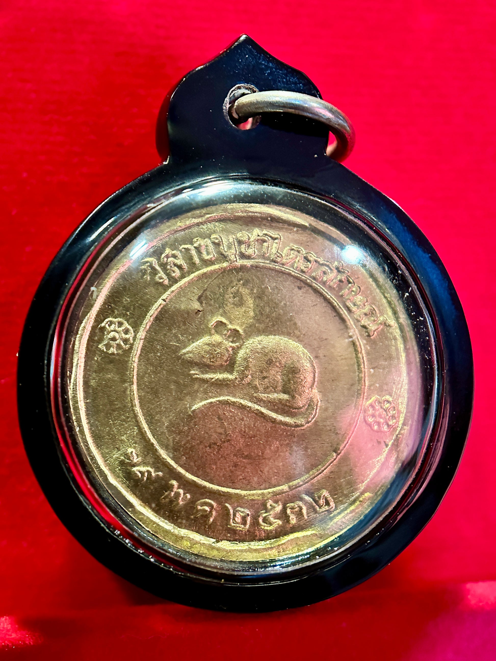 A unique round amulet featuring the bold Thai word “โชคดี” (Chok Dee), meaning “Good Luck,” beautifully embossed across the front. Created by Luang Phor Khen of Wat Sri Rat Sattharam, this charm is designed to attract prosperity and positive fortune. The reverse displays a rat—the first animal in the Thai zodiac—symbolizing intelligence, resourcefulness, and financial success. A great choice for those born in the Year of the Rat or anyone seeking a boost in luck and opportunity.