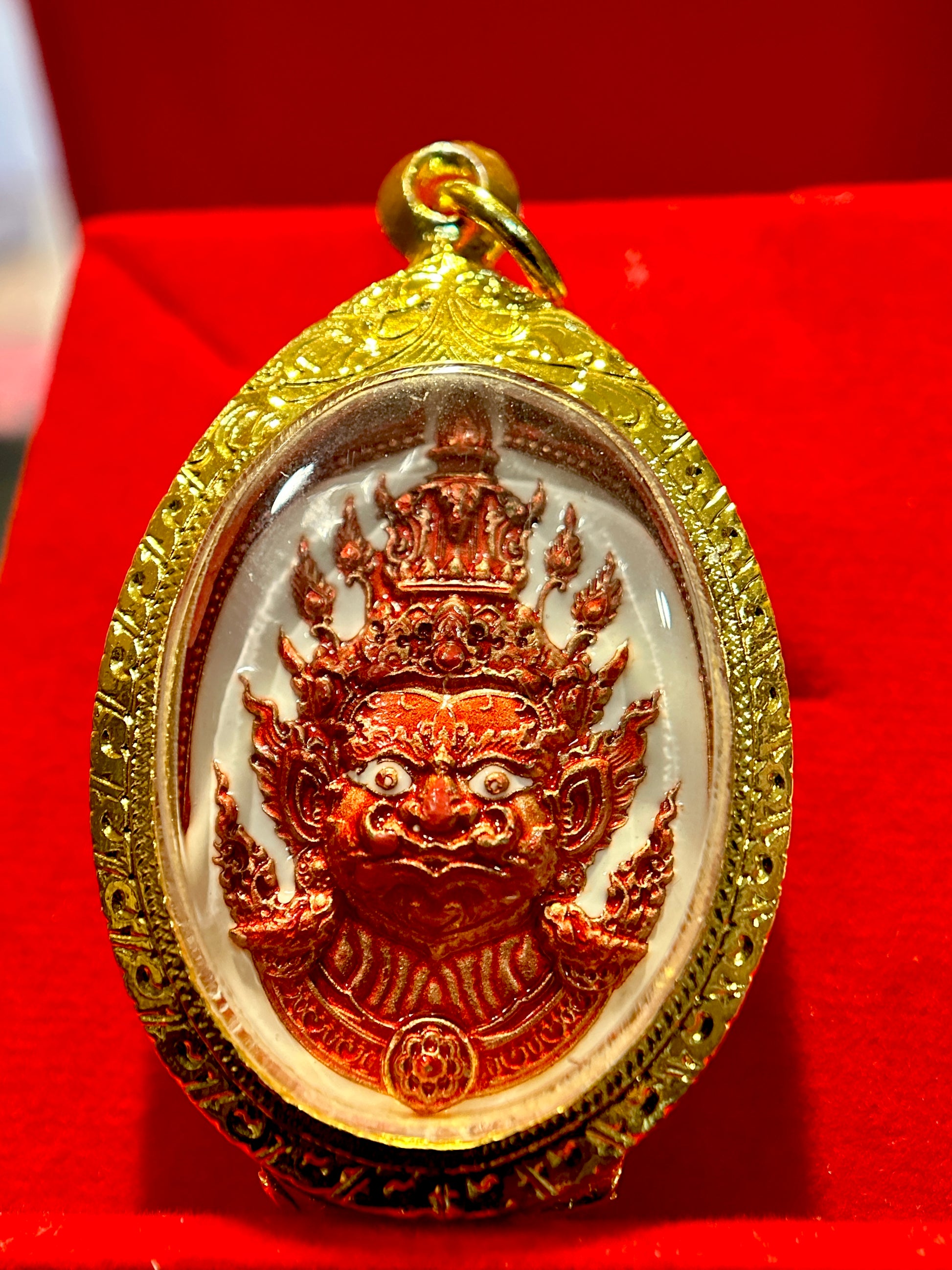 This rare dual-sided design features two distinct forms of Thao Wessuwan, the revered Guardian King known for powerful protection, authority, and the ability to repel negative forces. Created in the style and tradition of Luang Phor Phat, this piece showcases finely detailed craftsmanship with rich, hand-applied enamel.