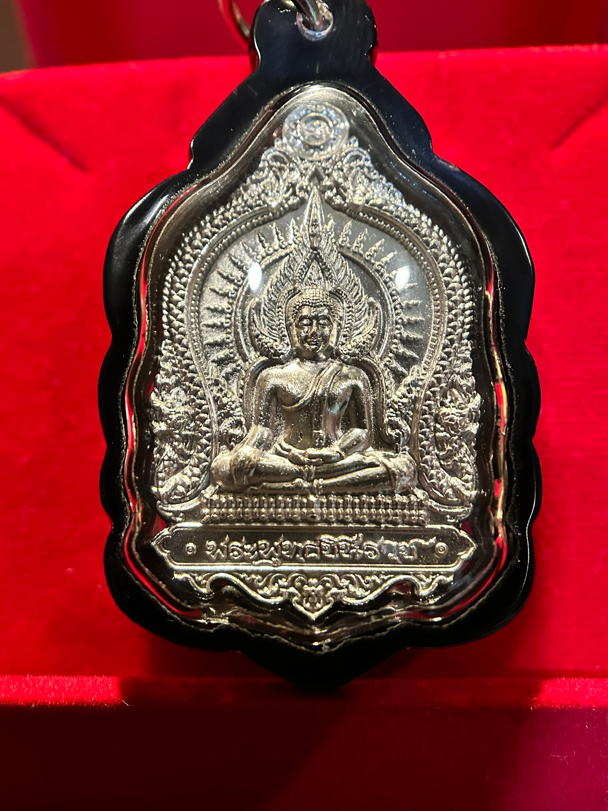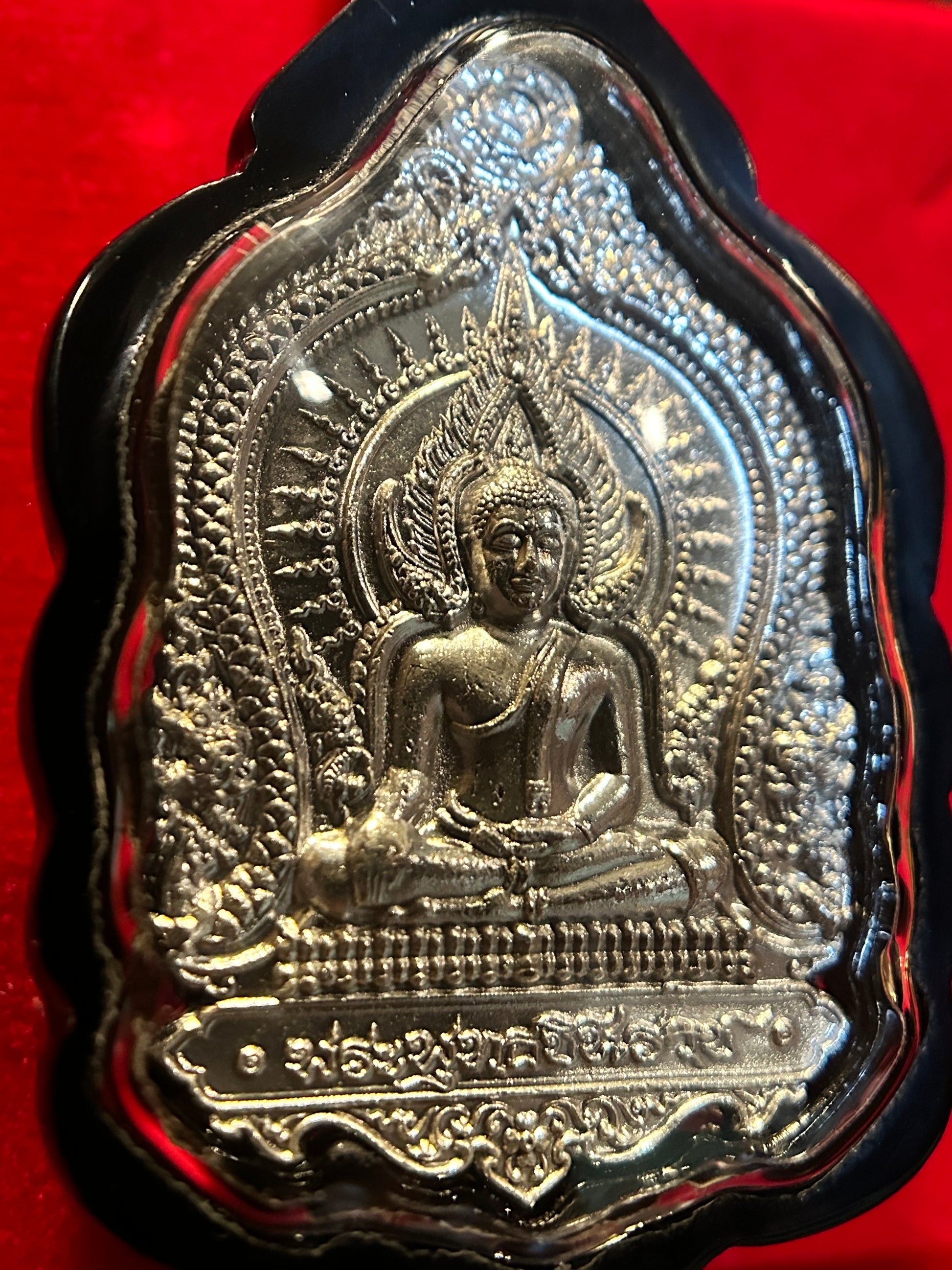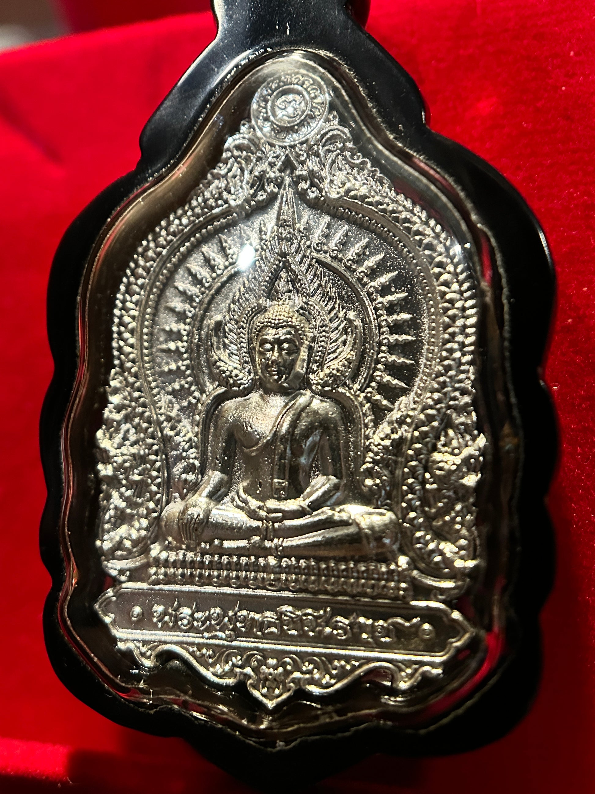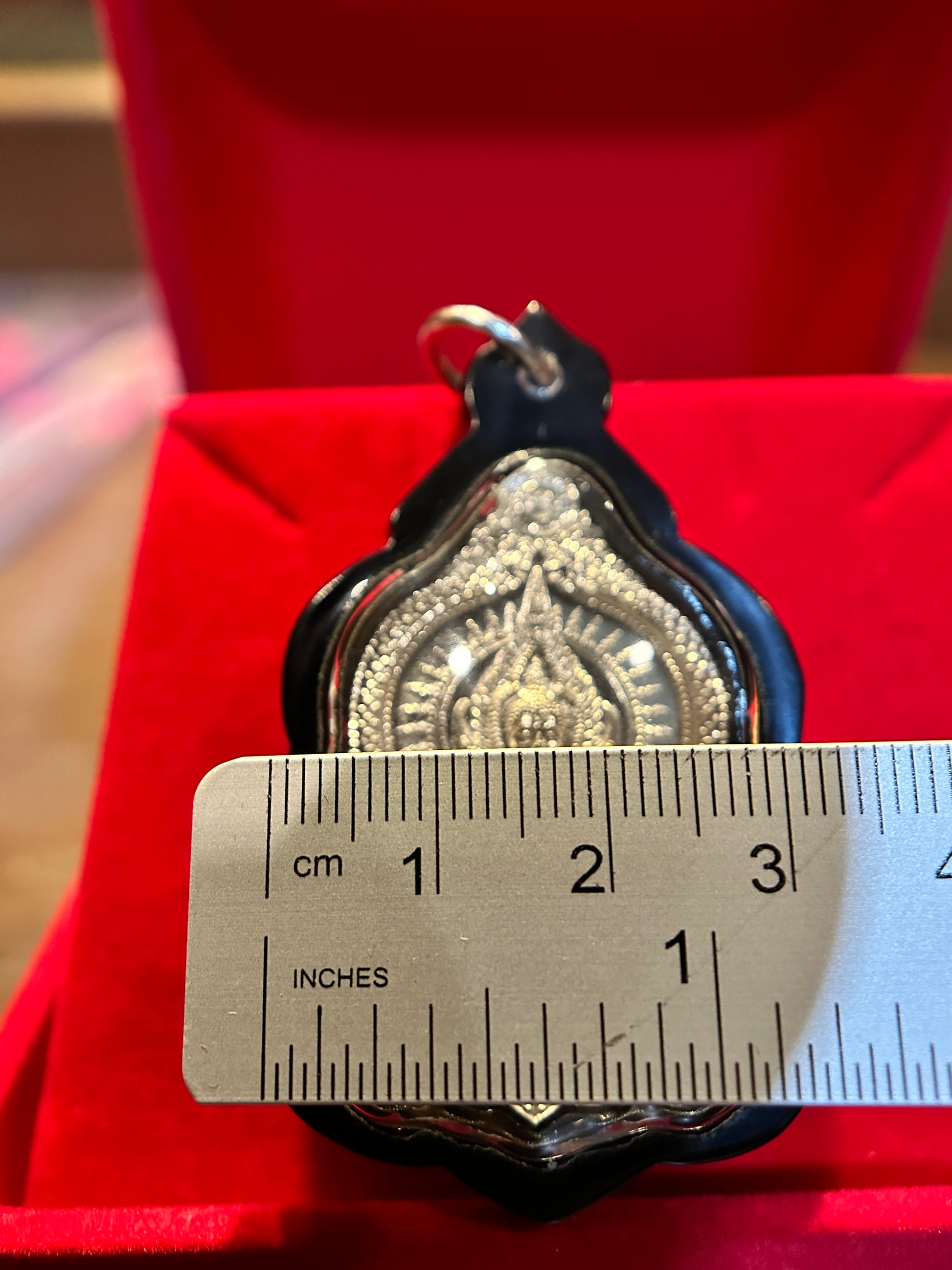 This striking Thai amulet features Phra Buddha seated in serene meditation beneath a radiant aureole, symbolizing enlightenment, inner peace, and spiritual clarity. The finely detailed silver finish captures every ornate flourish, reflecting purity and focus.