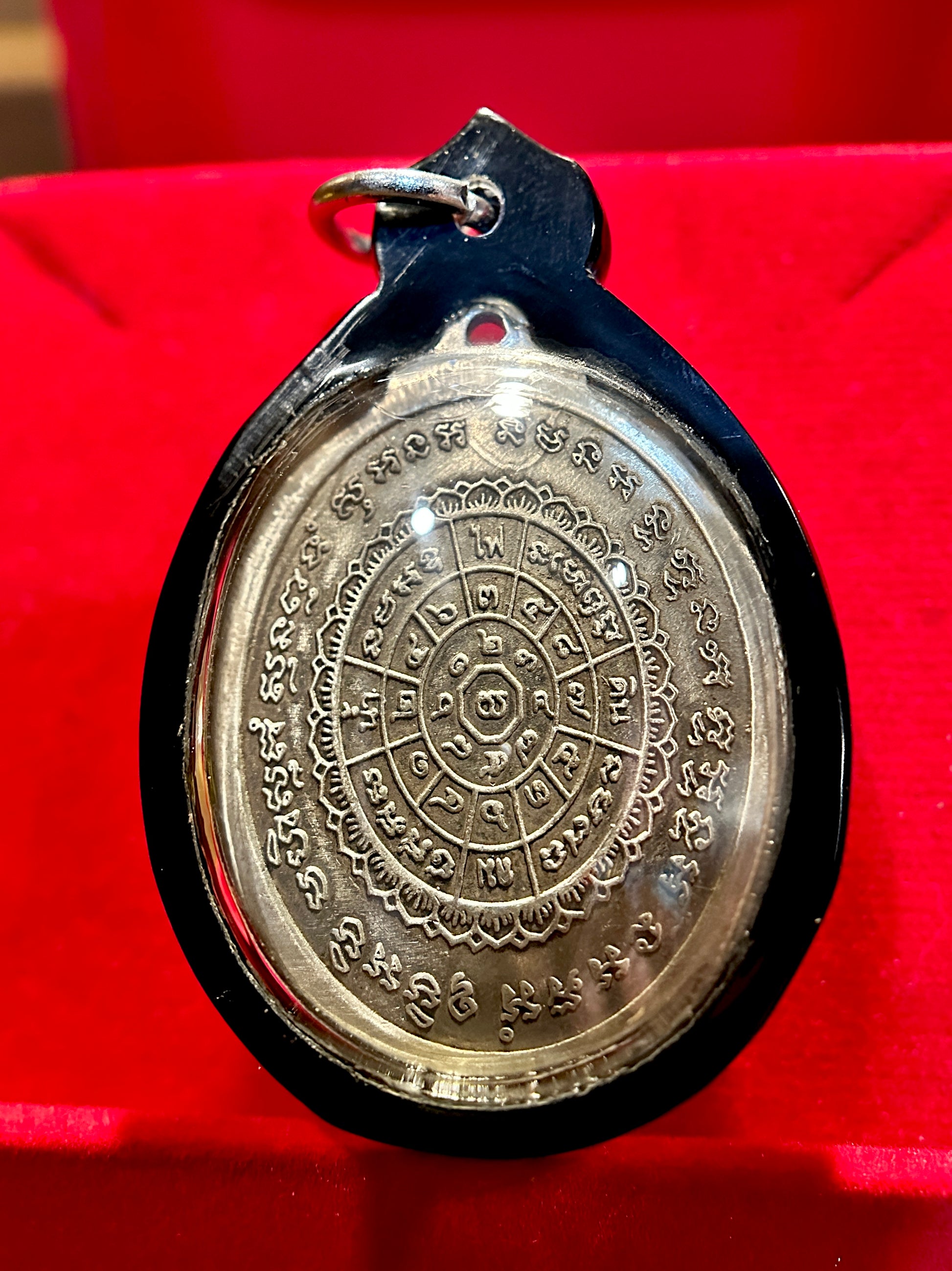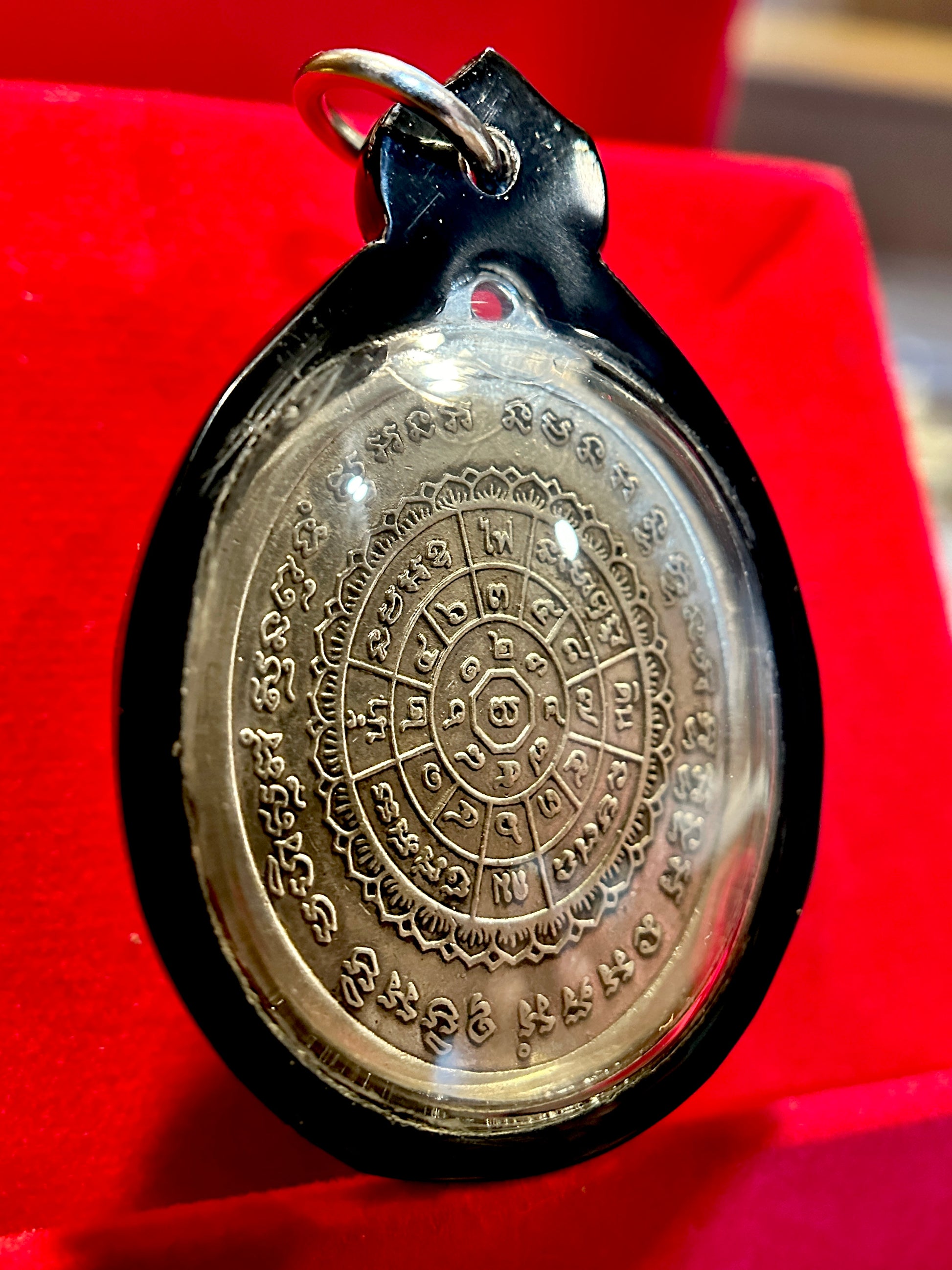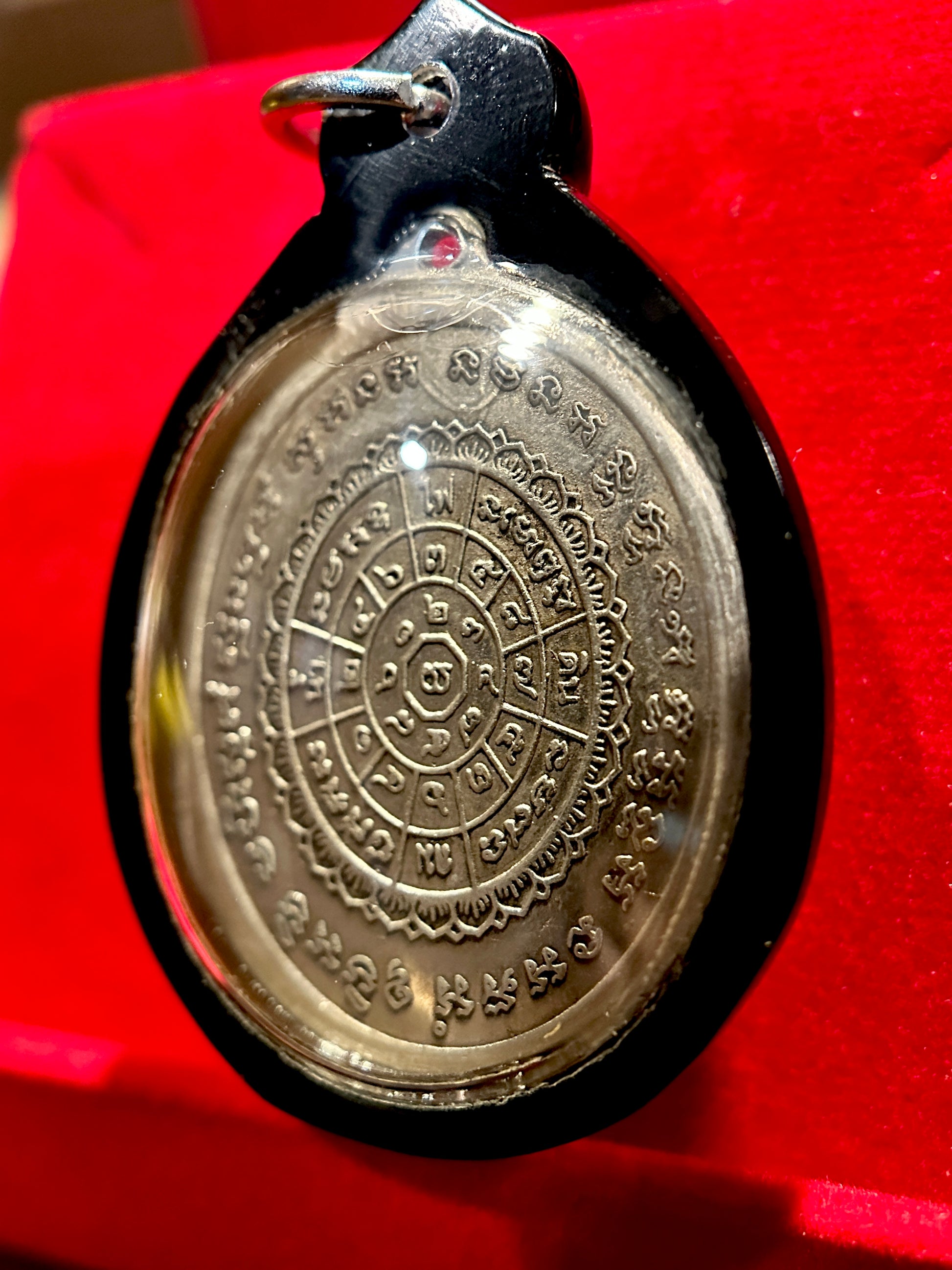This brushed silver amulet represents the cosmic power of eclipses. This finely detailed amulet portrays Rahu devouring the moon—a powerful symbol of karmic realignment and hidden forces. The front is sculpted with intensity, while the back reveals a circular yantra filled with sacred numerals and script used in Thai astrology. This amulet is believed to counteract bad planetary alignments and shield the wearer from harm, making it a compelling choice for spiritual practitioners and astrology followers alike.