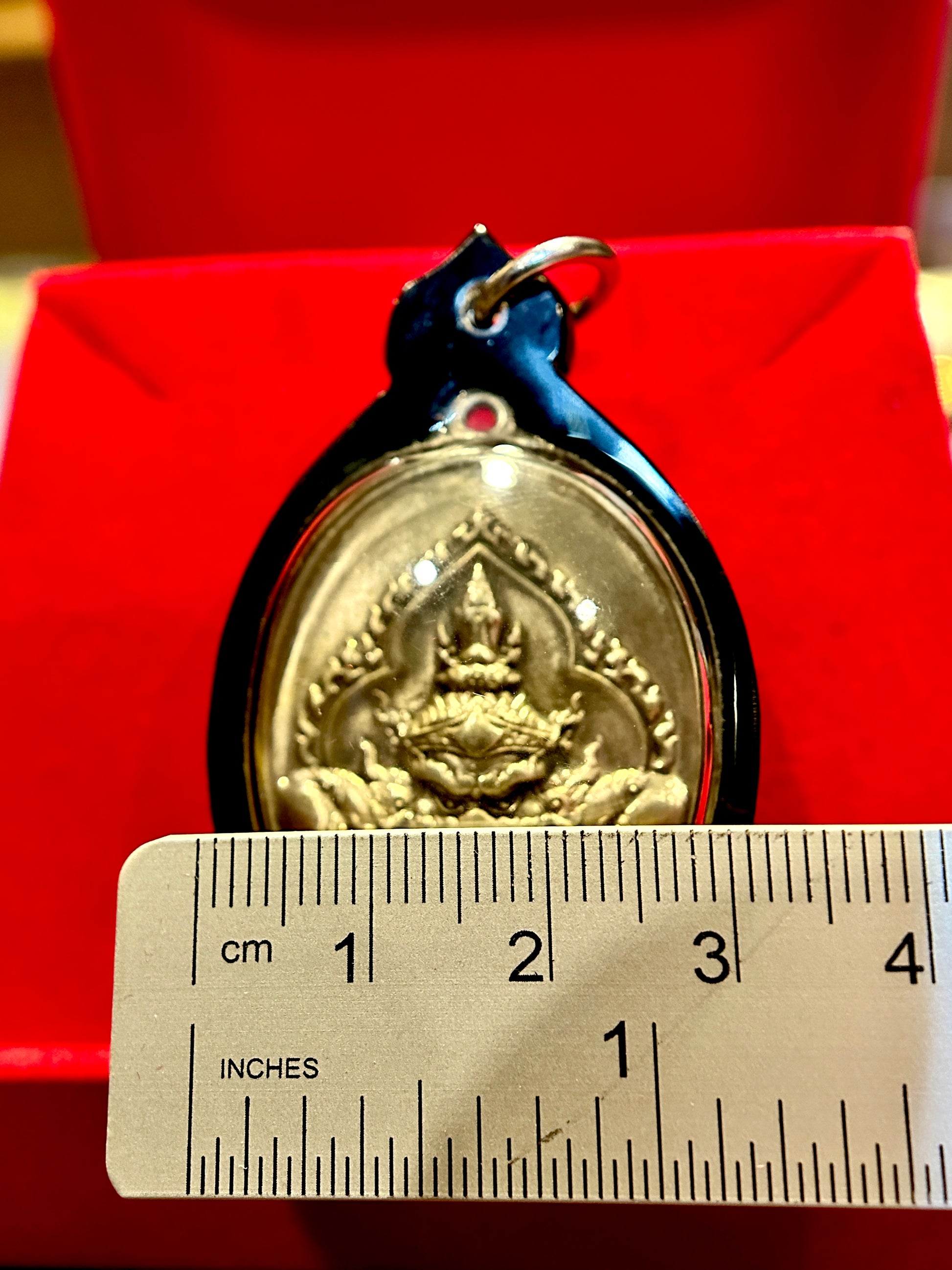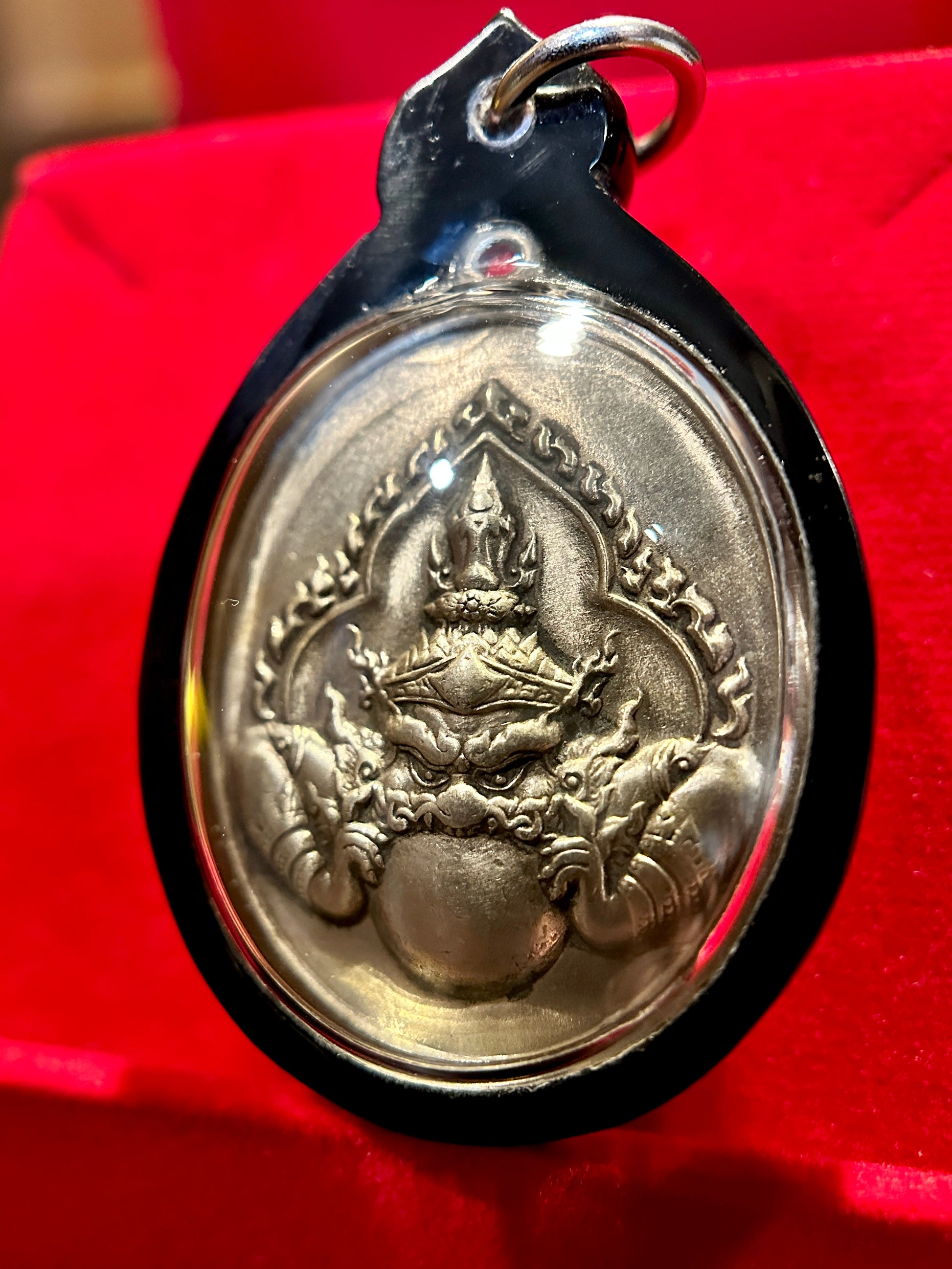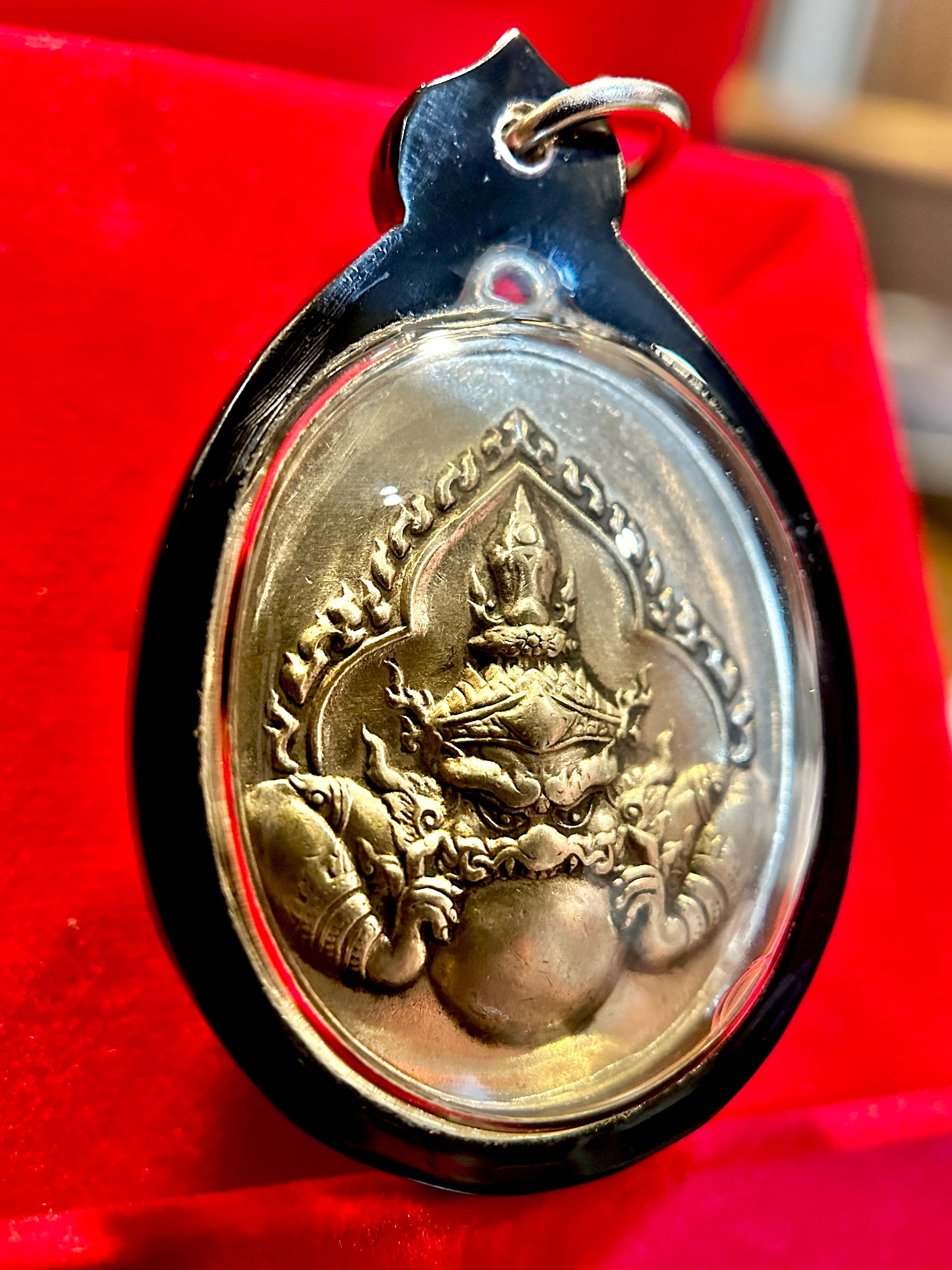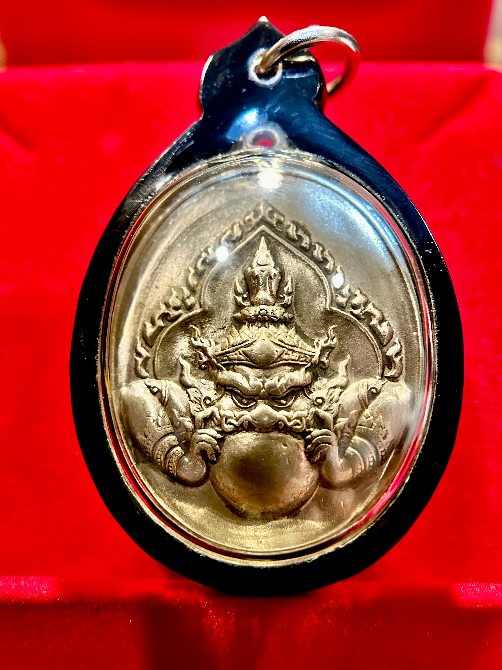 This brushed silver amulet represents the cosmic power of eclipses. This finely detailed amulet portrays Rahu devouring the moon—a powerful symbol of karmic realignment and hidden forces. The front is sculpted with intensity, while the back reveals a circular yantra filled with sacred numerals and script used in Thai astrology. This amulet is believed to counteract bad planetary alignments and shield the wearer from harm, making it a compelling choice for spiritual practitioners and astrology followers alike.