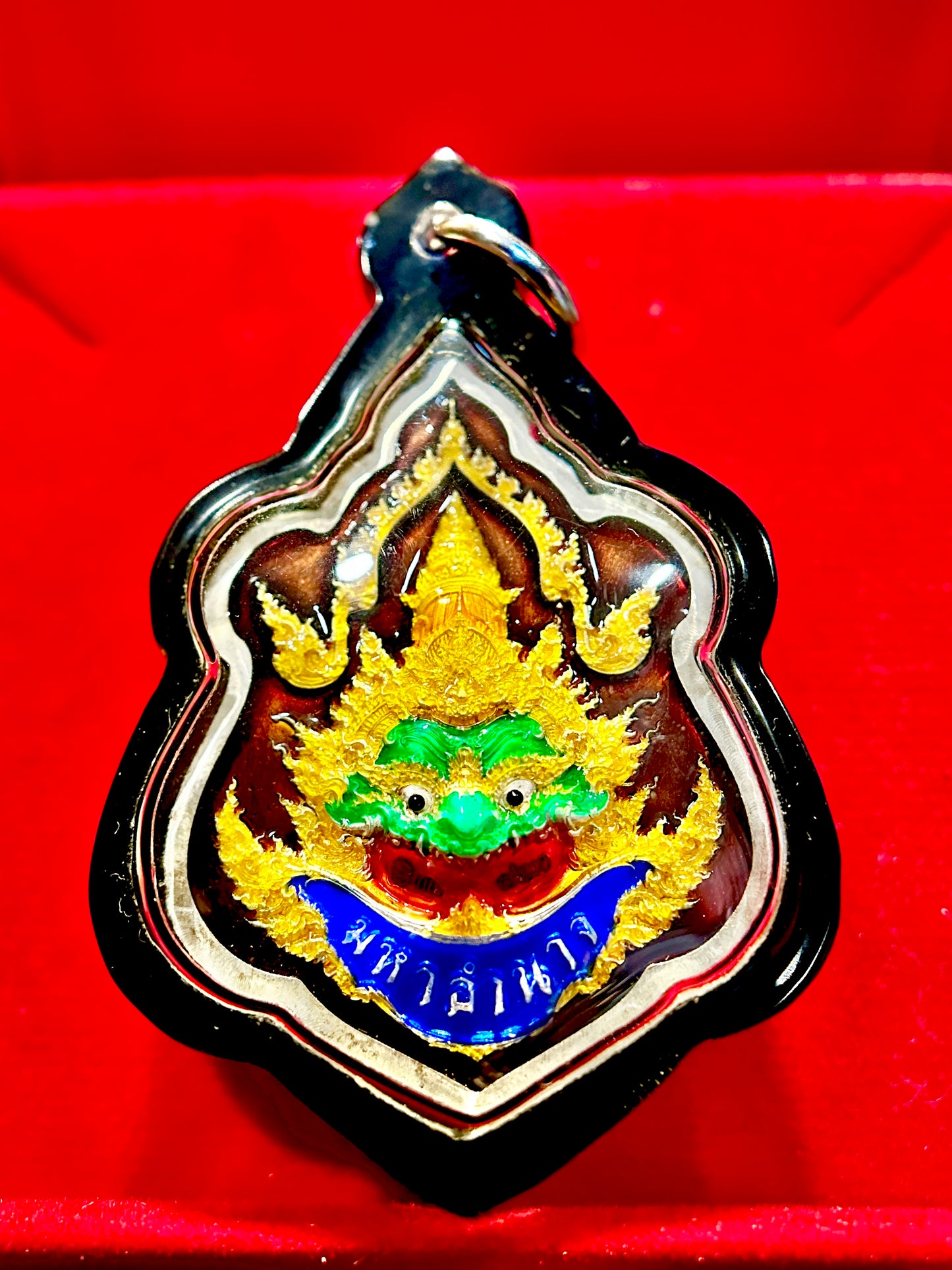 The reverse displays the face of a green Yaksha (giant guardian spirit) with the phrase “มหาอำนาจ” (Maha Amnaj) meaning “Great Power” beneath it—infusing the wearer with commanding presence, leadership, and protection against spiritual or physical threats.