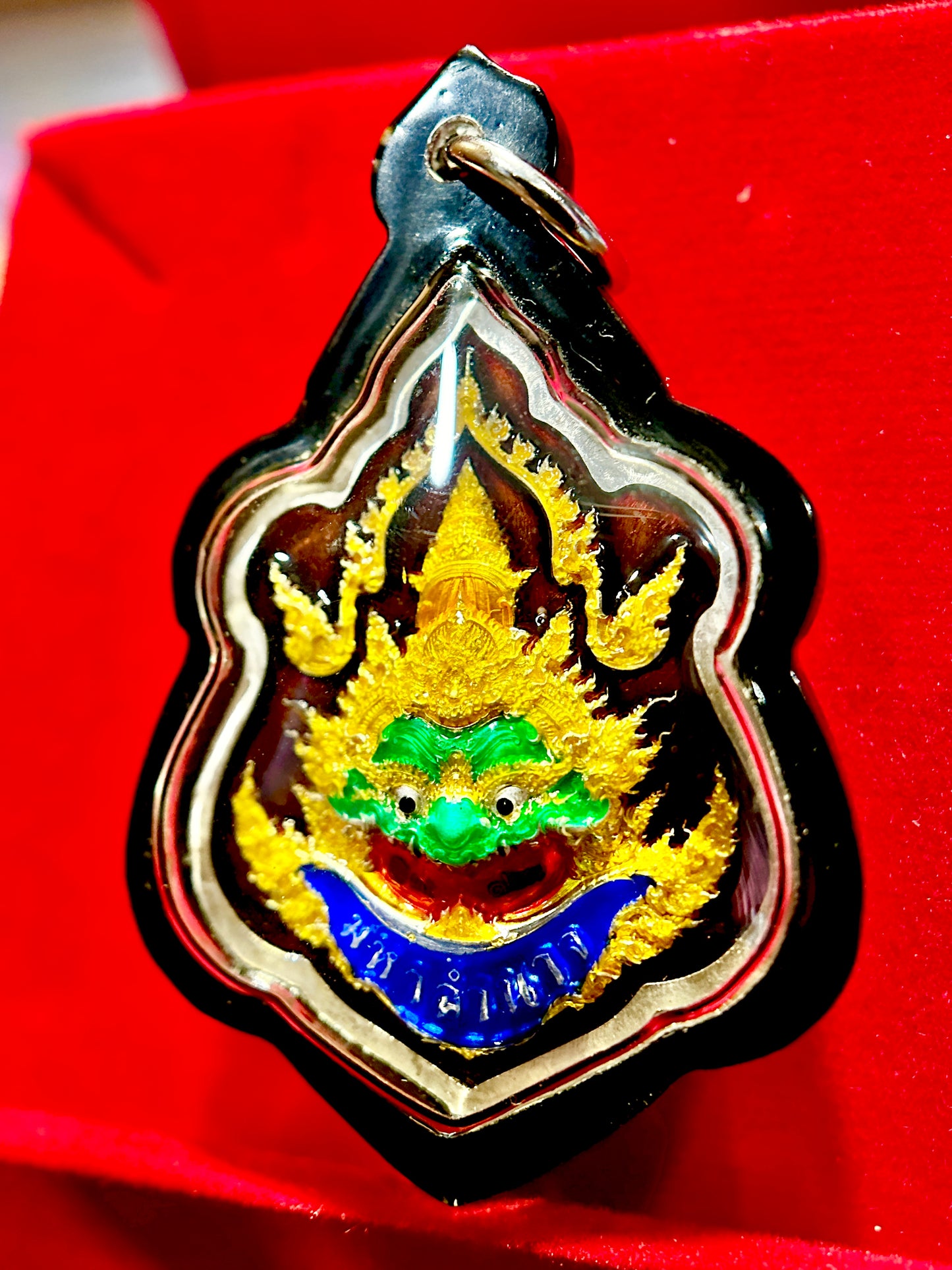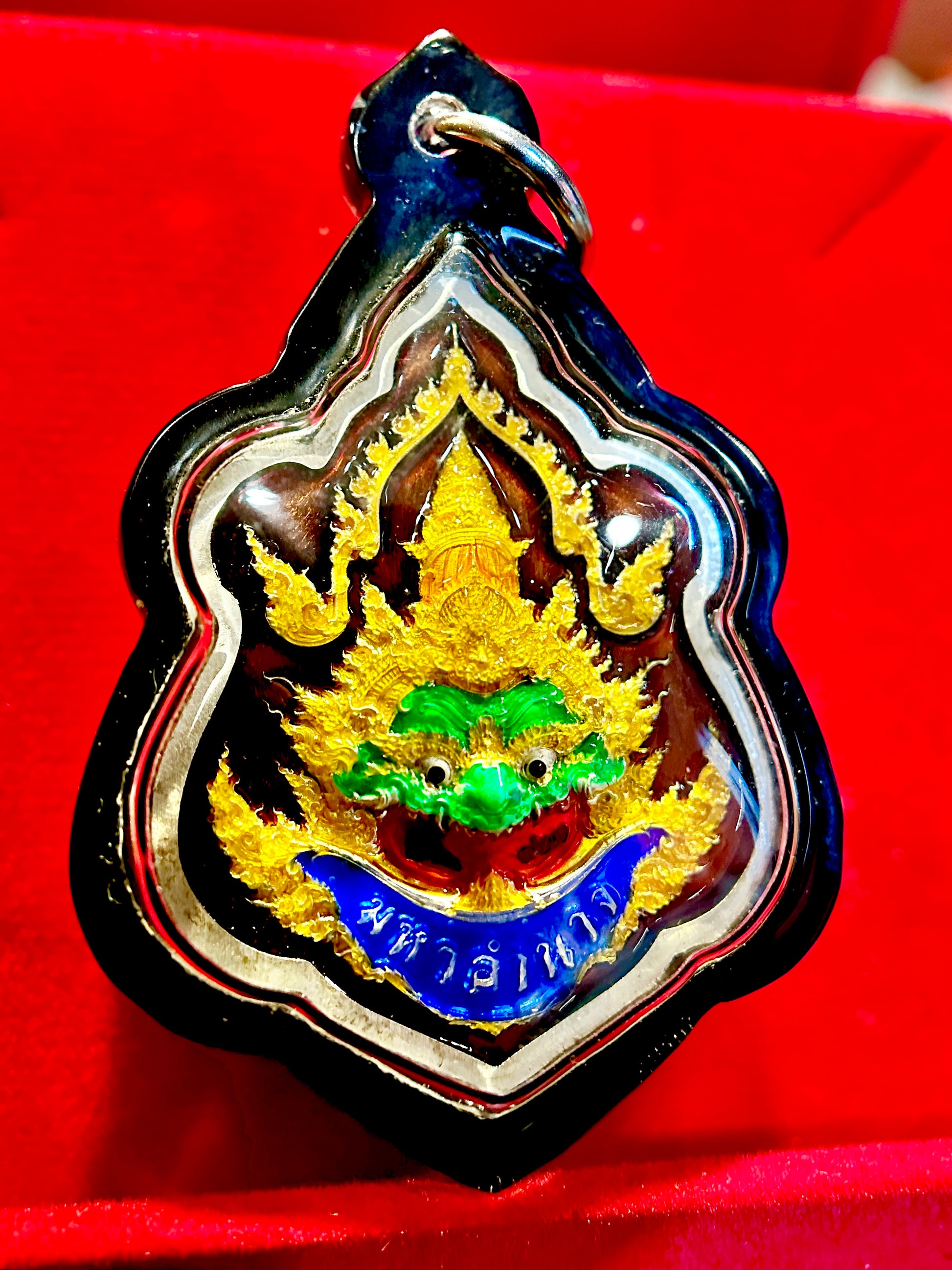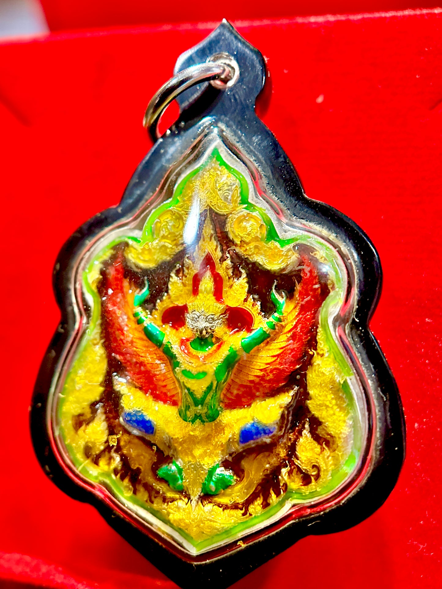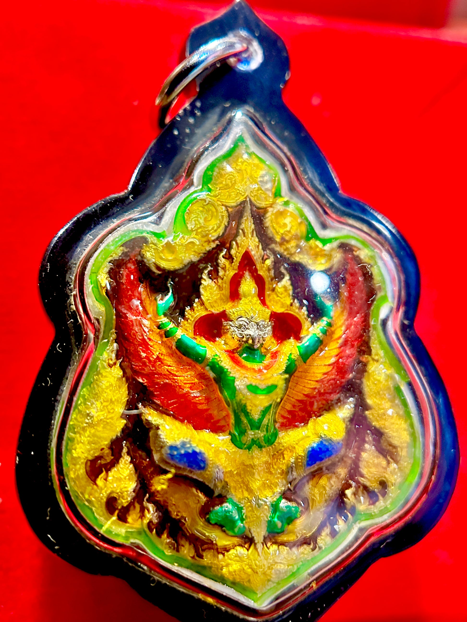 A striking Thai amulet featuring Phaya Krut (Garuda) in a bold multi-color enamel finish. Garuda, the mythical bird-man and mount of Lord Vishnu, is a symbol of royal power, victory, and spiritual ascendancy in Thai and Hindu tradition. With wings outstretched and flames surrounding, this Garuda radiates protective energy, commanding presence, and fearlessness.