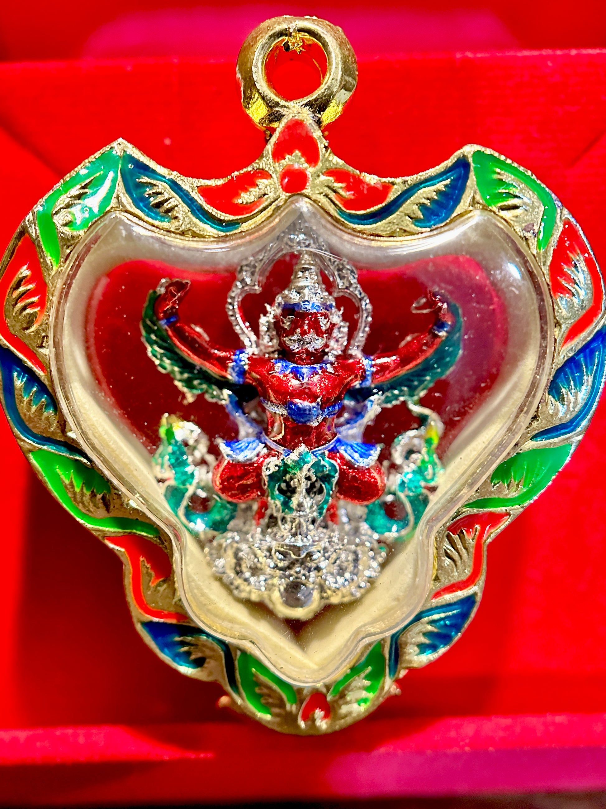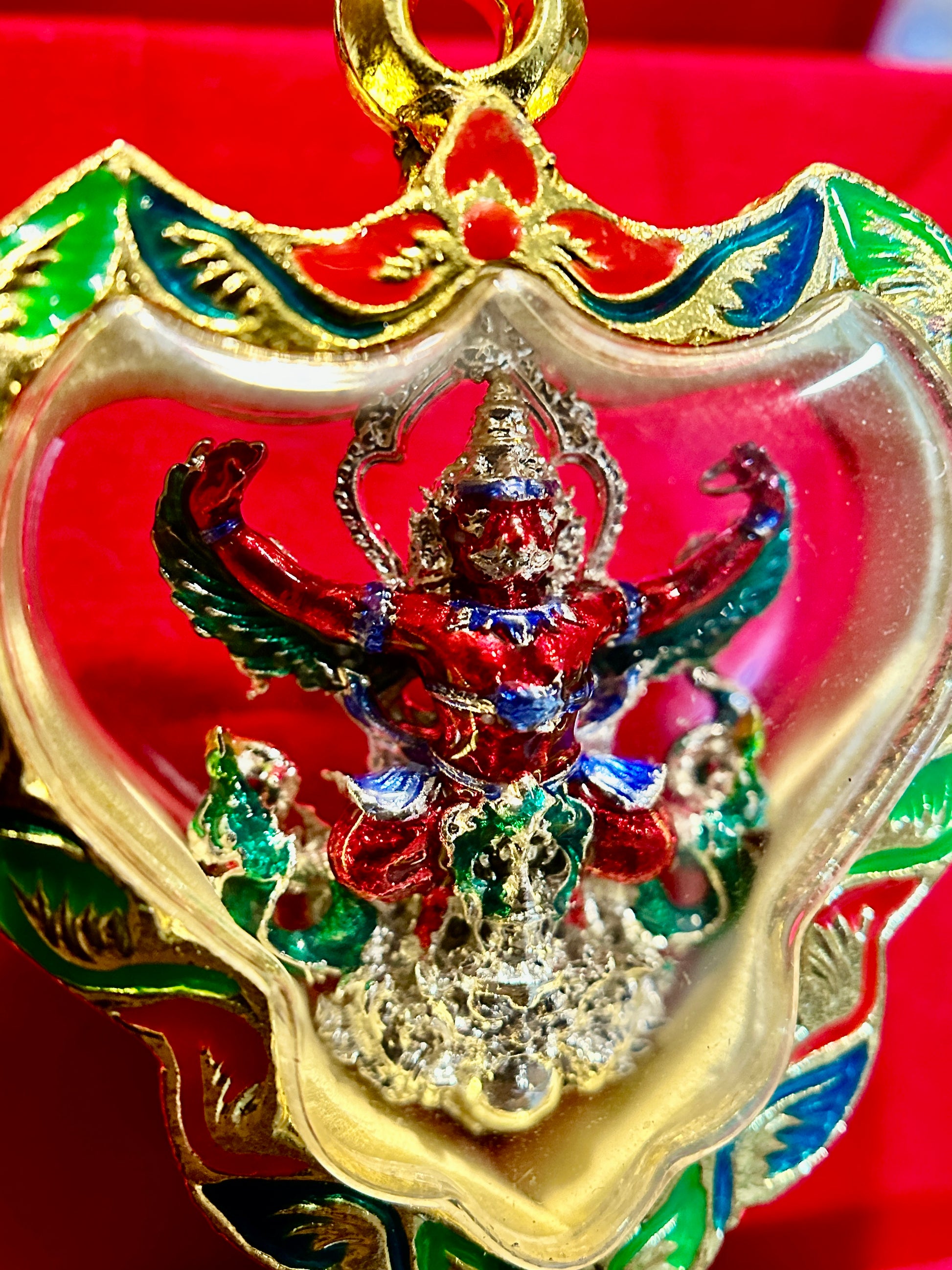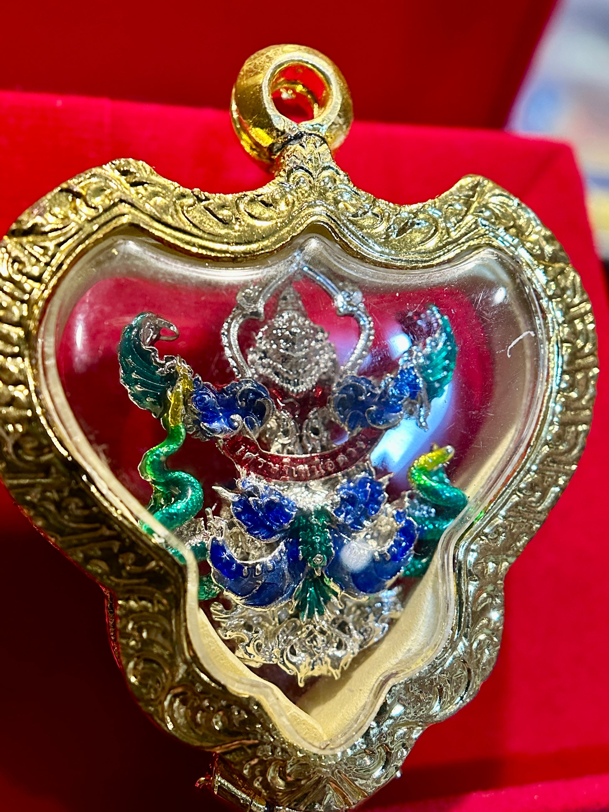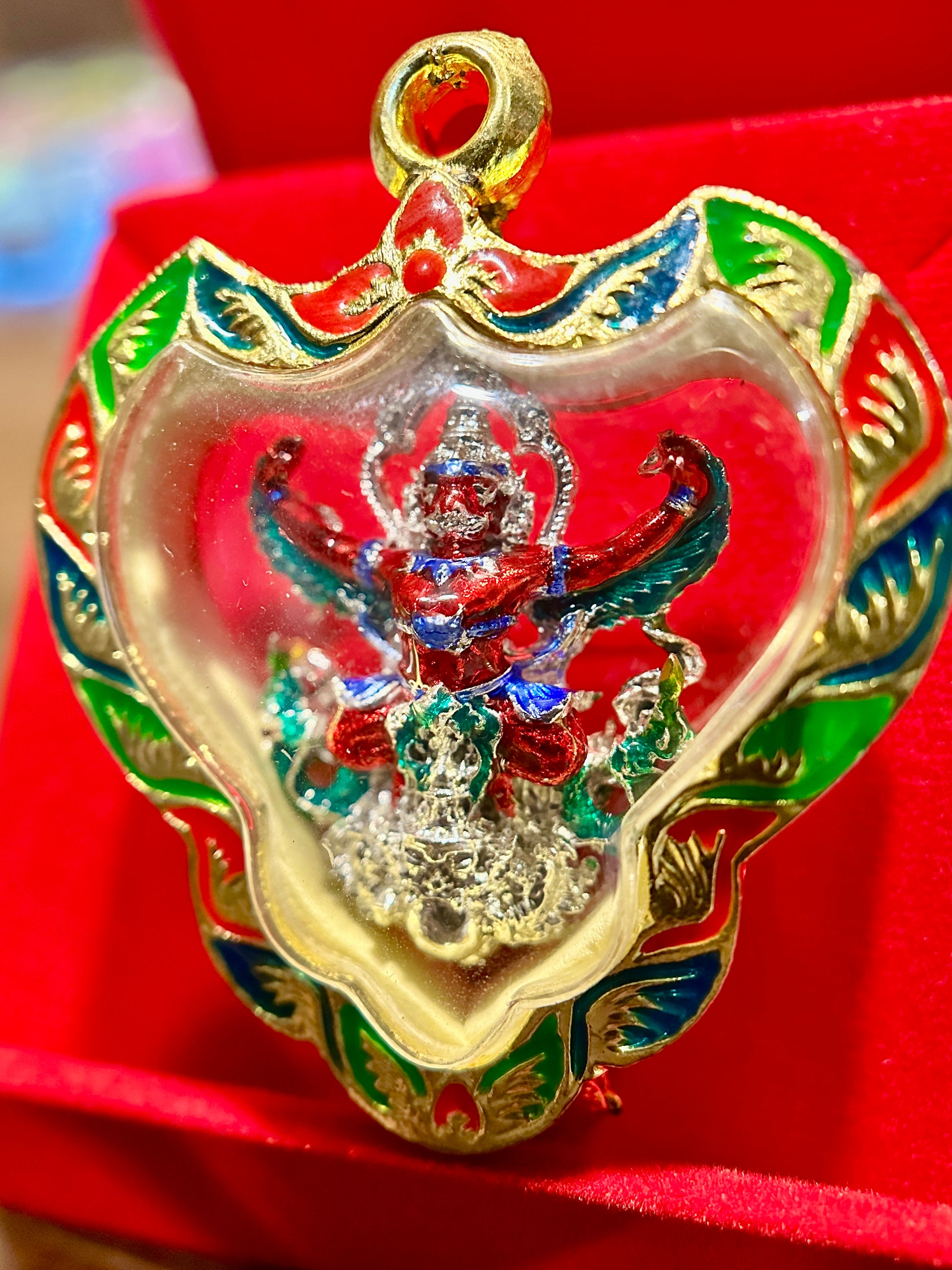 - Back: A second depiction of Garuda, finished in royal blue with green wings, emphasizes balance, resilience, and spiritual authority. This dual-sided design enhances the amulet’s protective qualities, ensuring strength in both the physical and spiritual realms.