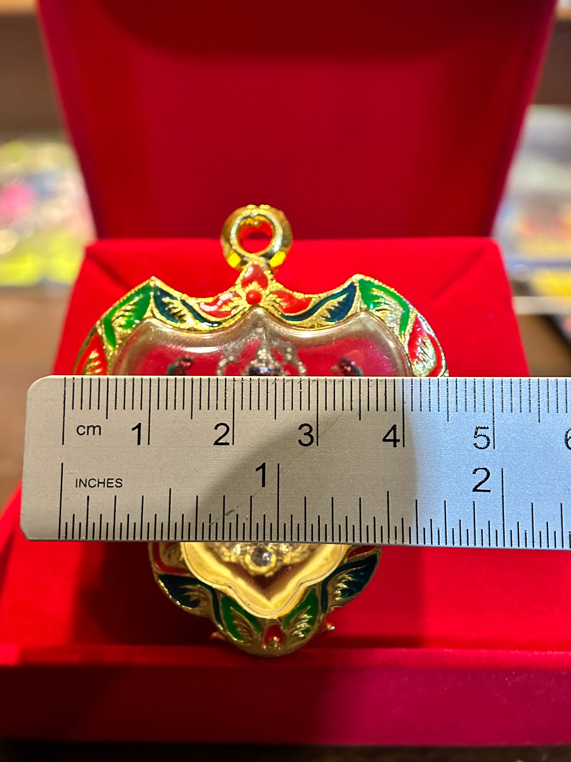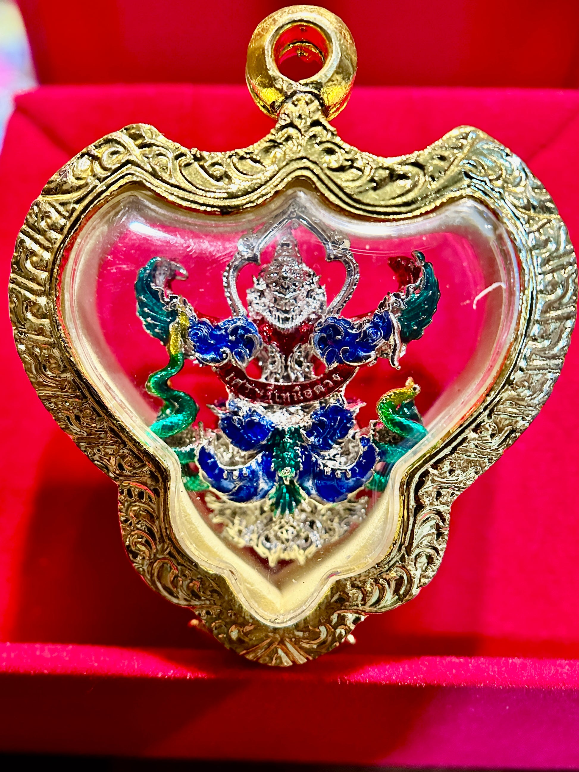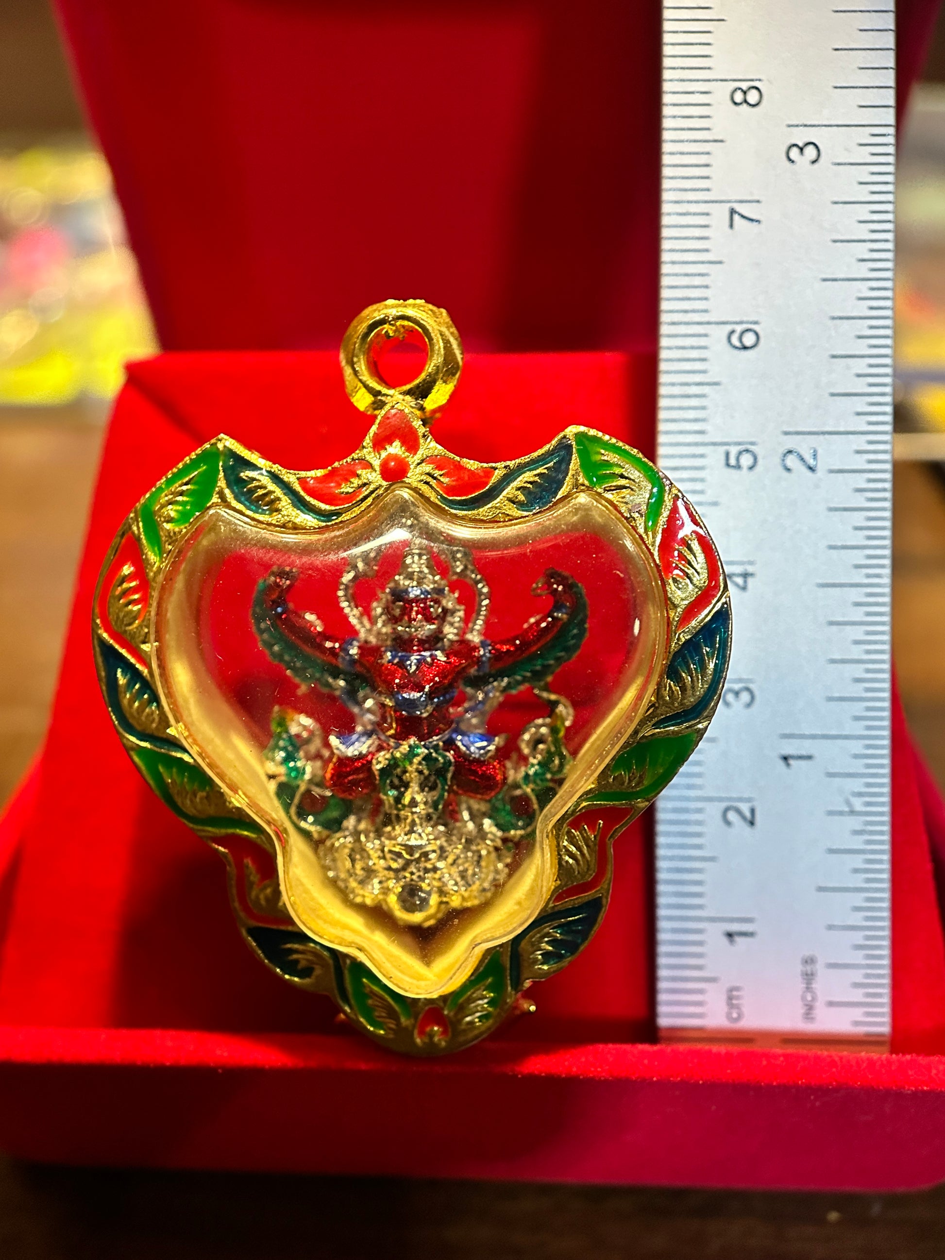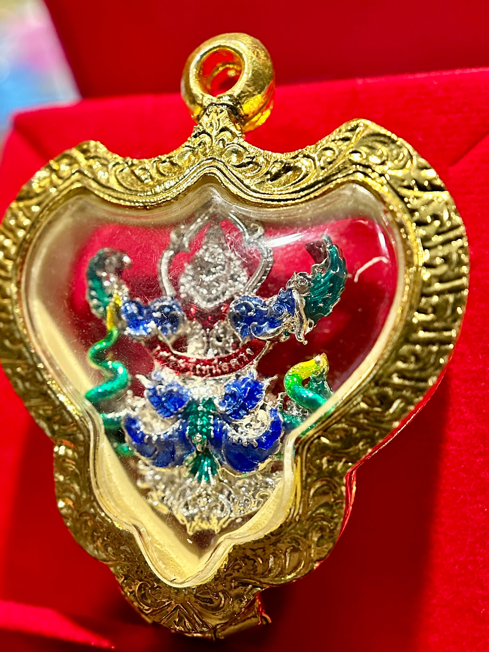 - Back: A second depiction of Garuda, finished in royal blue with green wings, emphasizes balance, resilience, and spiritual authority. This dual-sided design enhances the amulet’s protective qualities, ensuring strength in both the physical and spiritual realms.