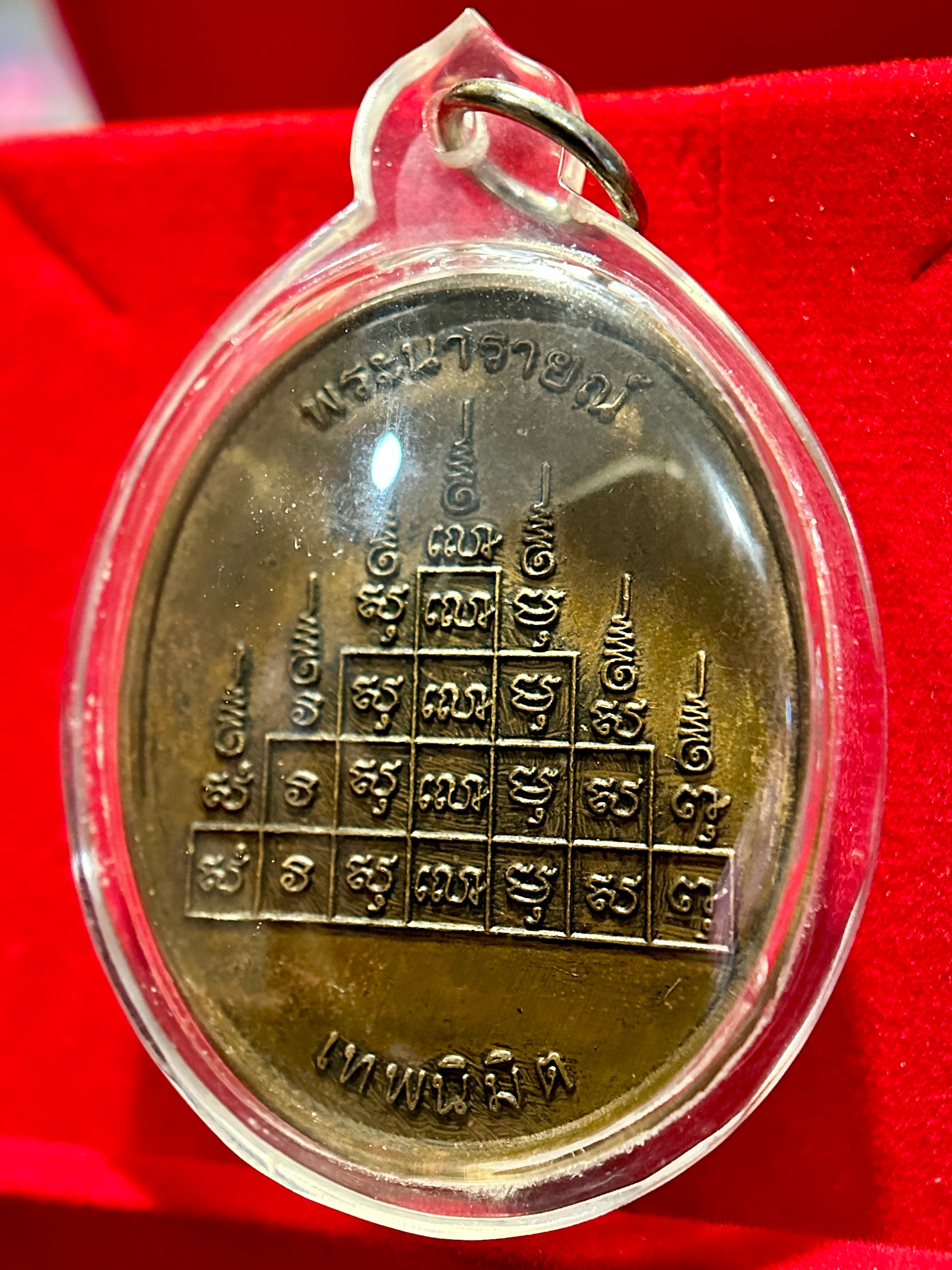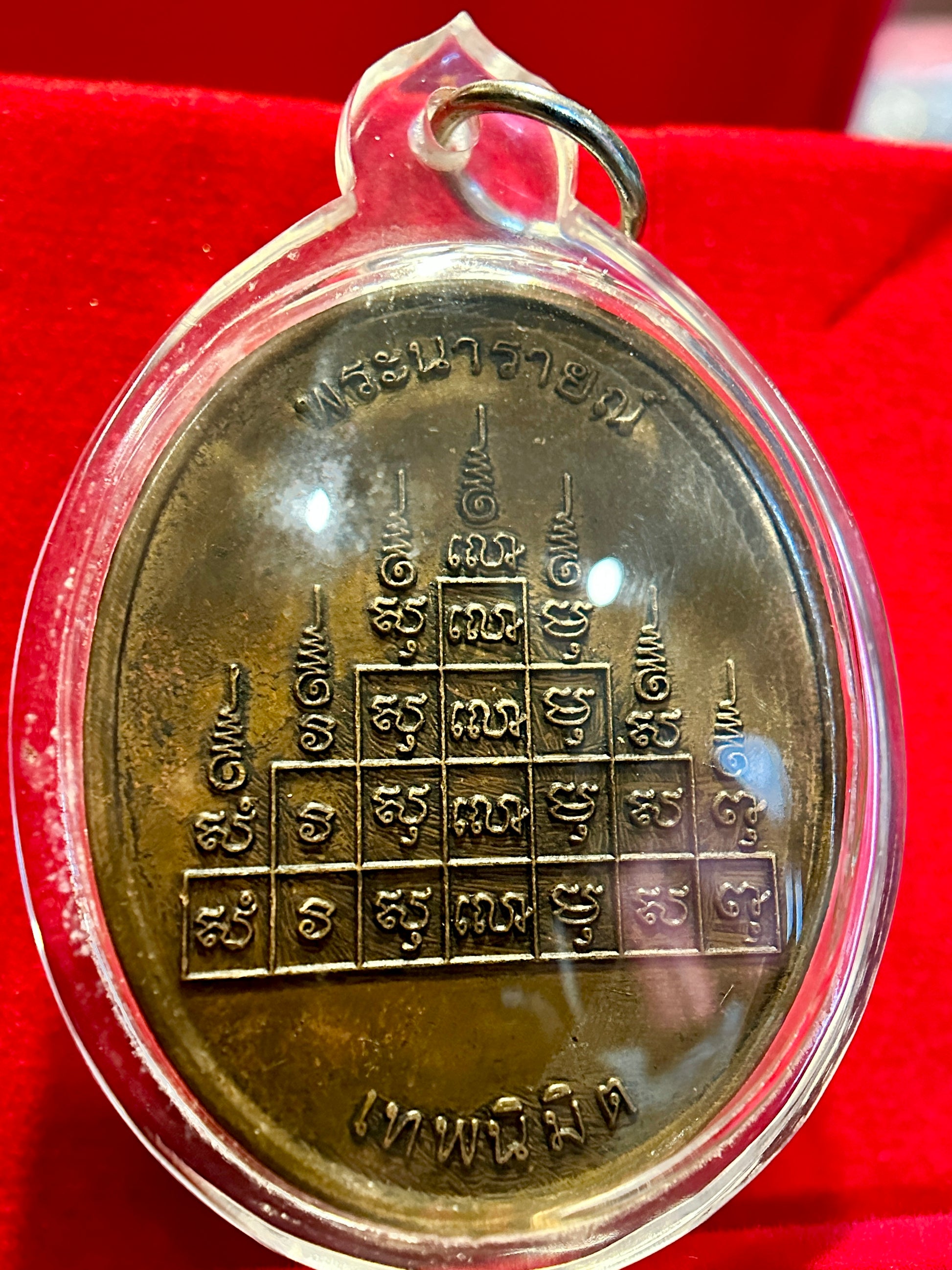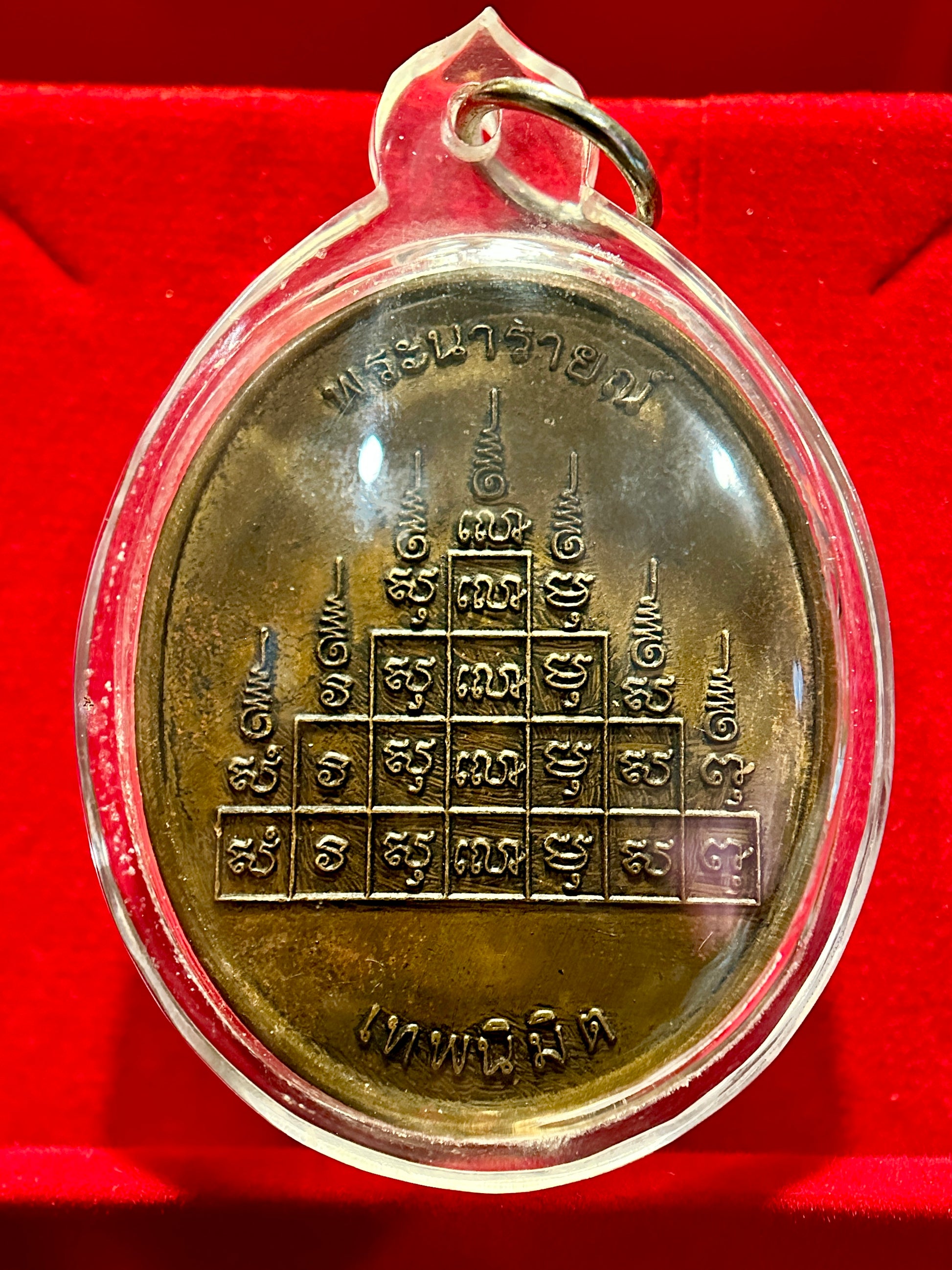 This striking Thai amulet features a dynamic depiction of Vishnu standing triumphantly atop Garuda, the celestial bird of protection and victory. Vishnu’s many arms hold divine implements, symbolizing the power to preserve, protect, and restore balance. Garuda, with wings spread wide, fiercely subdues two serpent nagas beneath, representing triumph over obstacles and harmful forces.