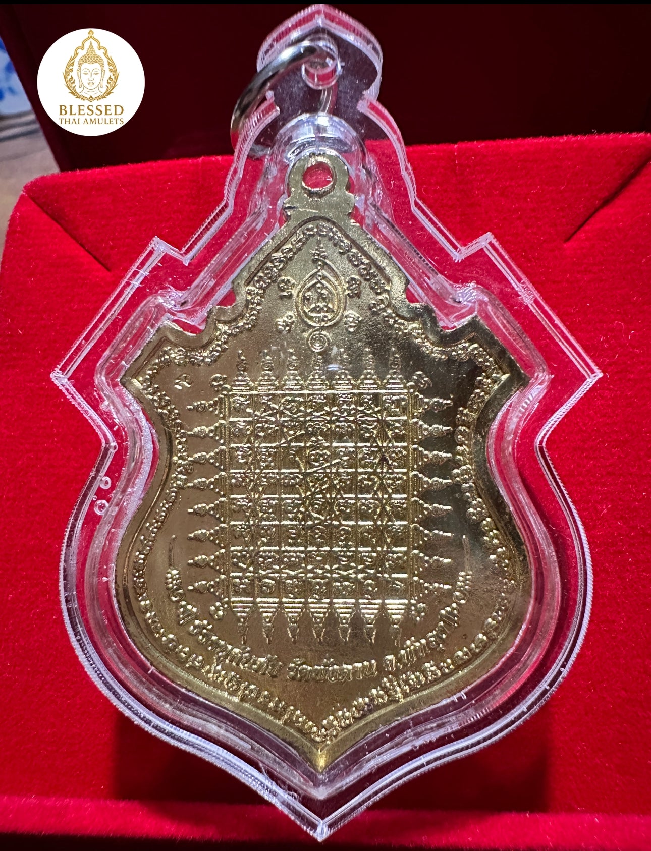 The reverse features a fully detailed sak yant 81-square grid, etched in gold. This sacred geometry is designed to: