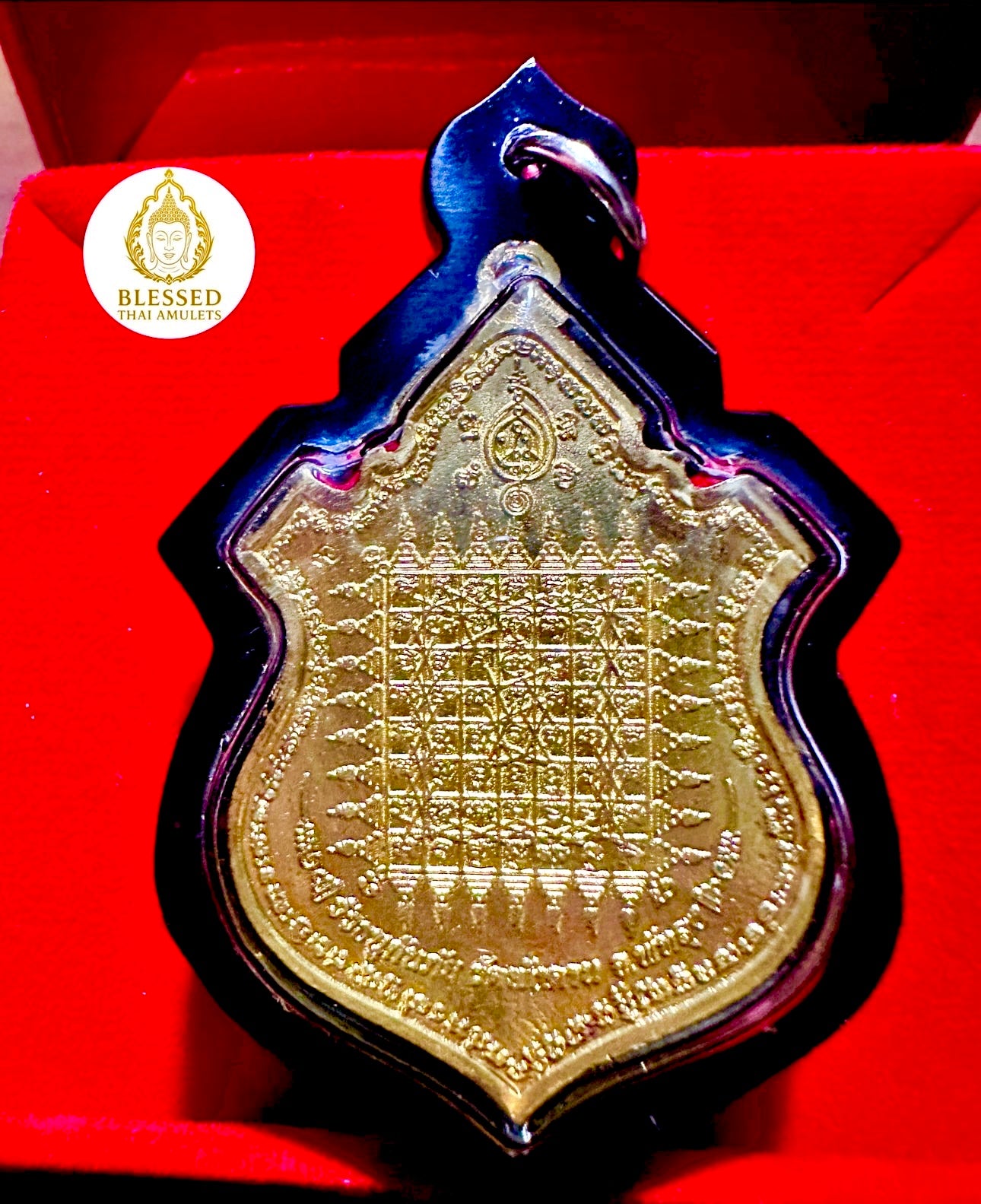 The reverse features a fully detailed sak yant 81-square grid, etched in gold. This sacred geometry is designed to: