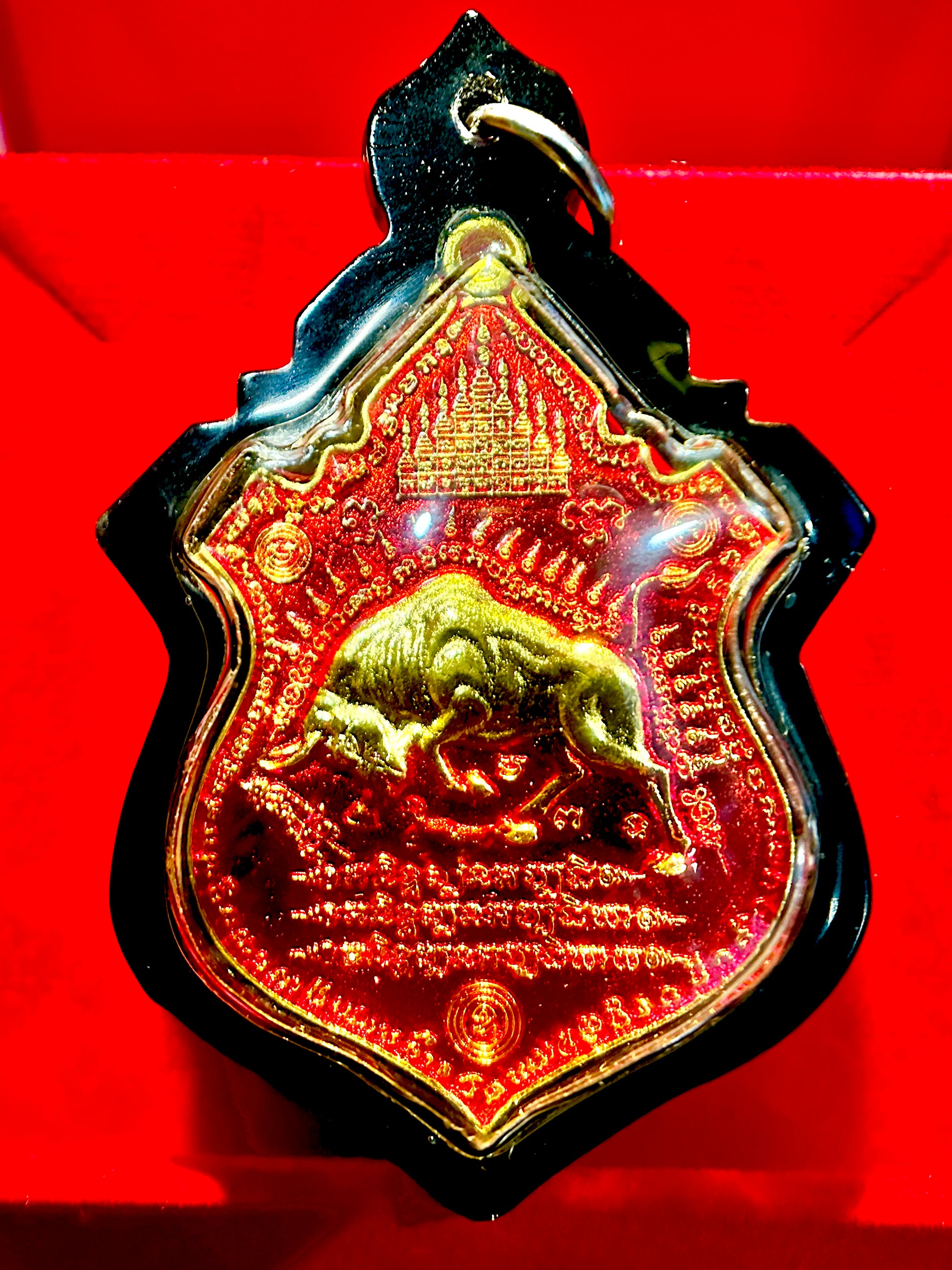 This powerful Thai amulet showcases a golden bull in mid-charge, set against a deep black enamel background, radiating strength, focus, and unstoppable energy. The bull is a timeless symbol of determination, prosperity, and fearless perseverance — perfect for those driven to overcome obstacles in life, business, or battle.