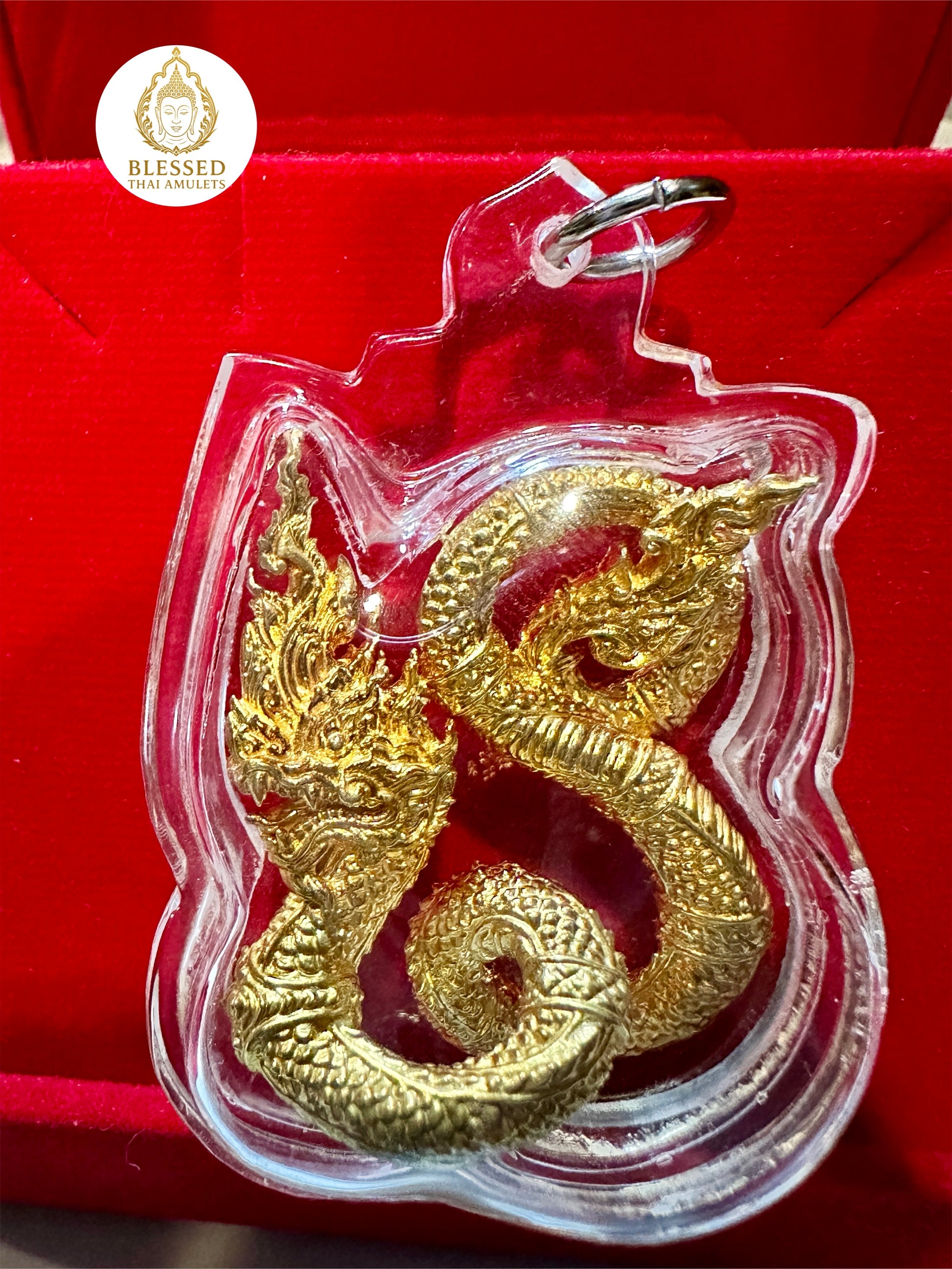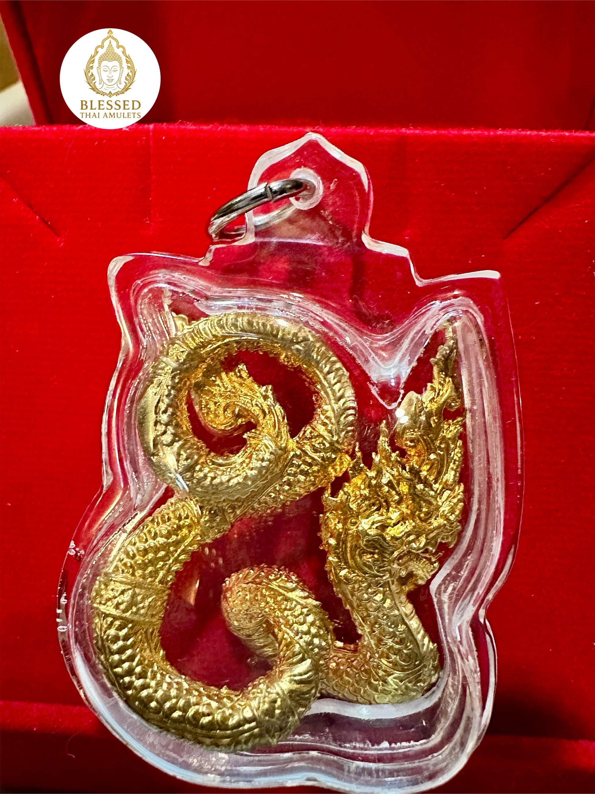 This amulet features a single majestic Naga, the sacred serpent of Thai and Buddhist mythology, cast in lustrous gold-tone metal and encased in a sleek clear case. Coiled in an elegant spiral with its hood flared and fangs bared, this Naga radiates strength, spiritual power, and protective energy.