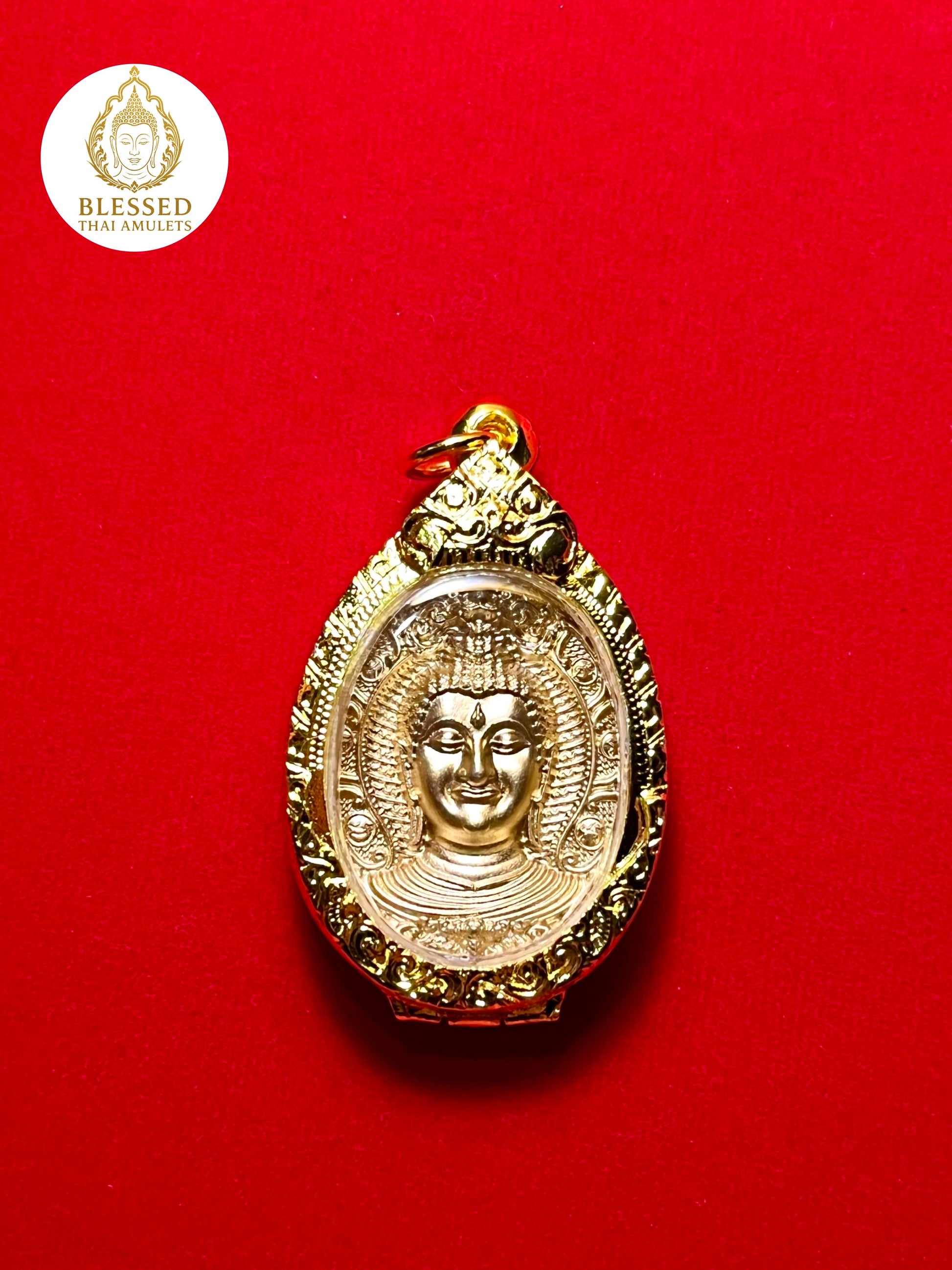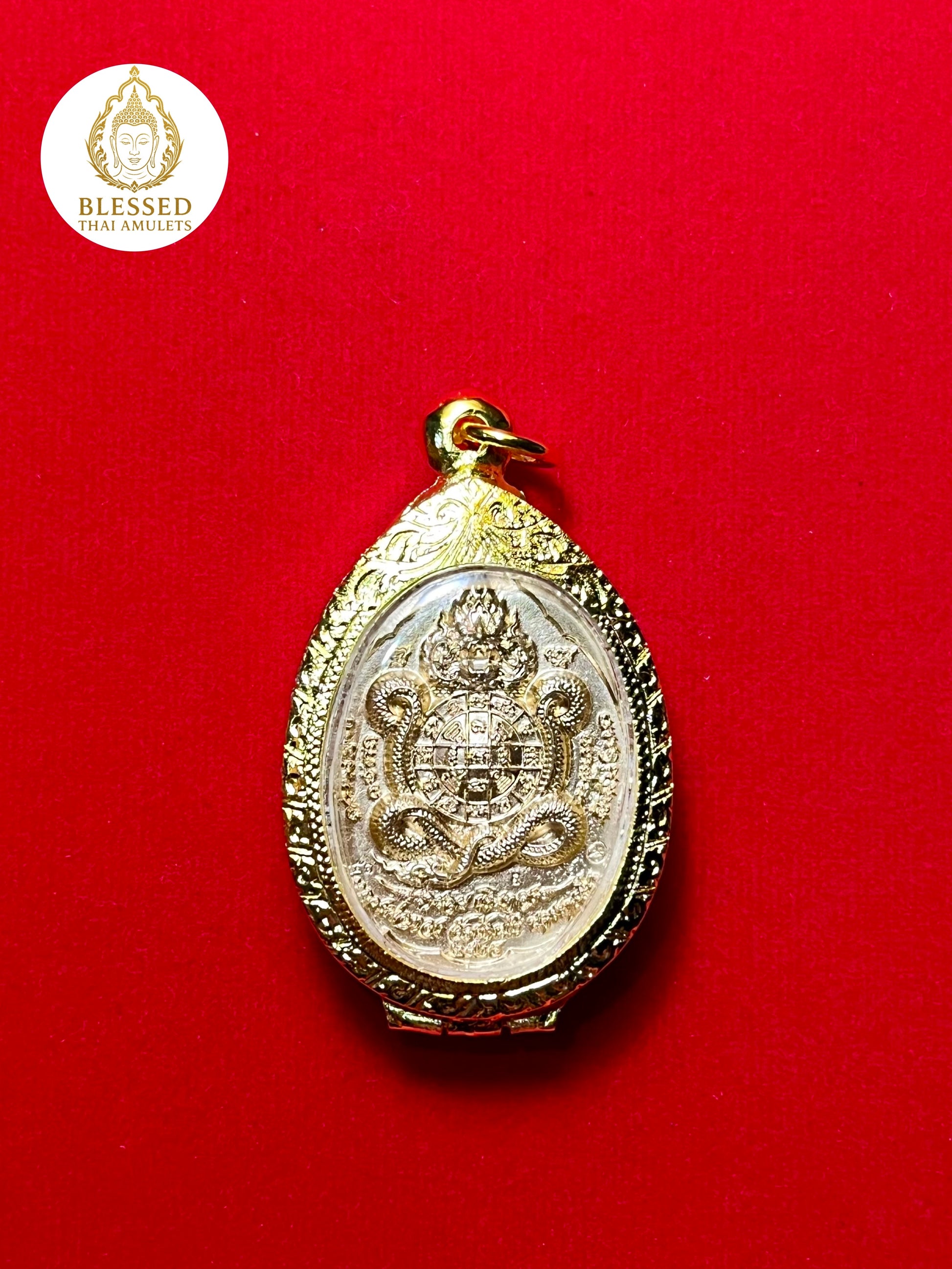 An exquisite dual-sided Thai amulet radiating divine energy and cosmic balance. Featuring a serene golden Buddha on one side and a yantra-charged serpent motif on the other, this piece offers complete spiritual armor—protection, clarity, and transcendence.
