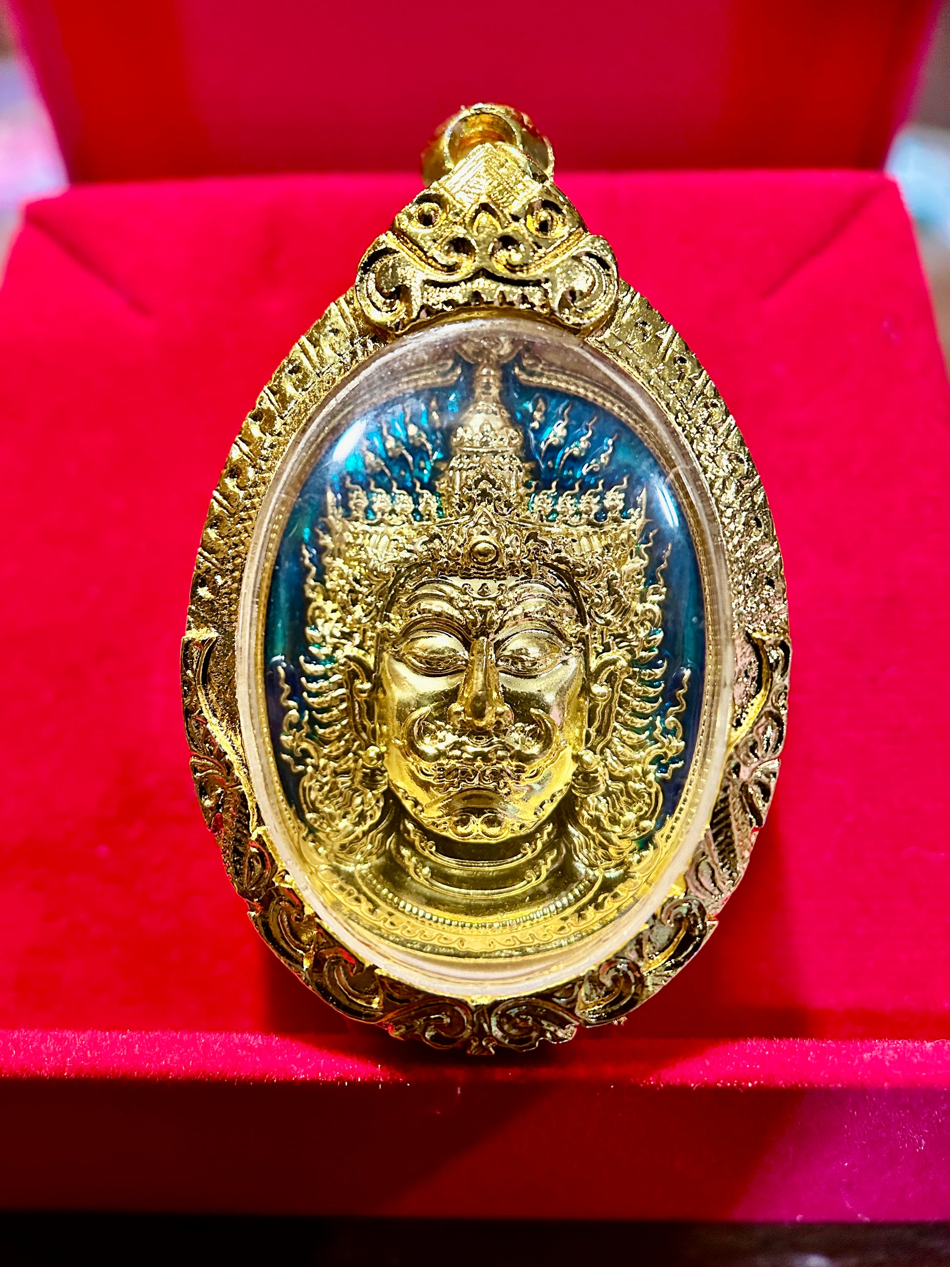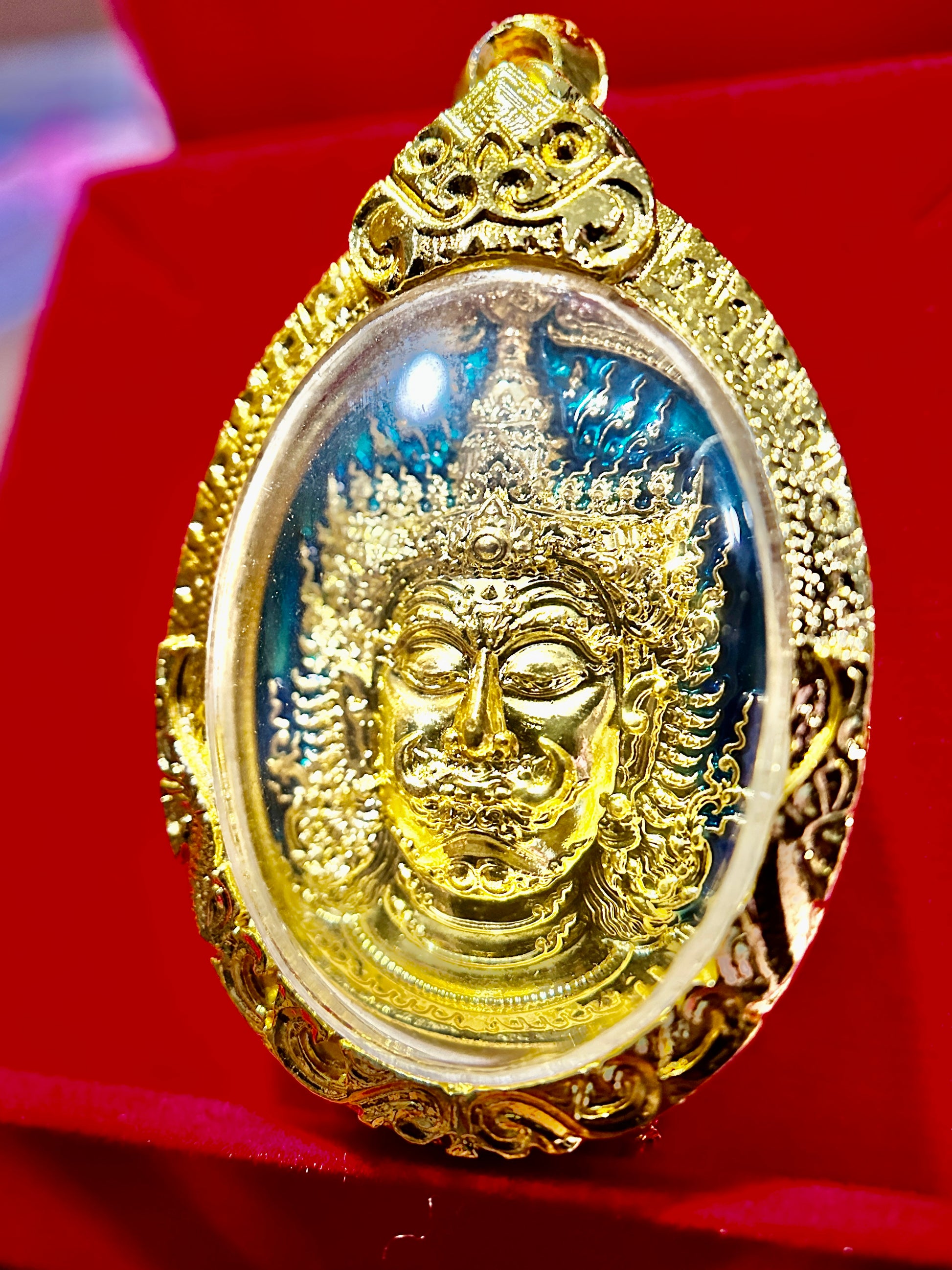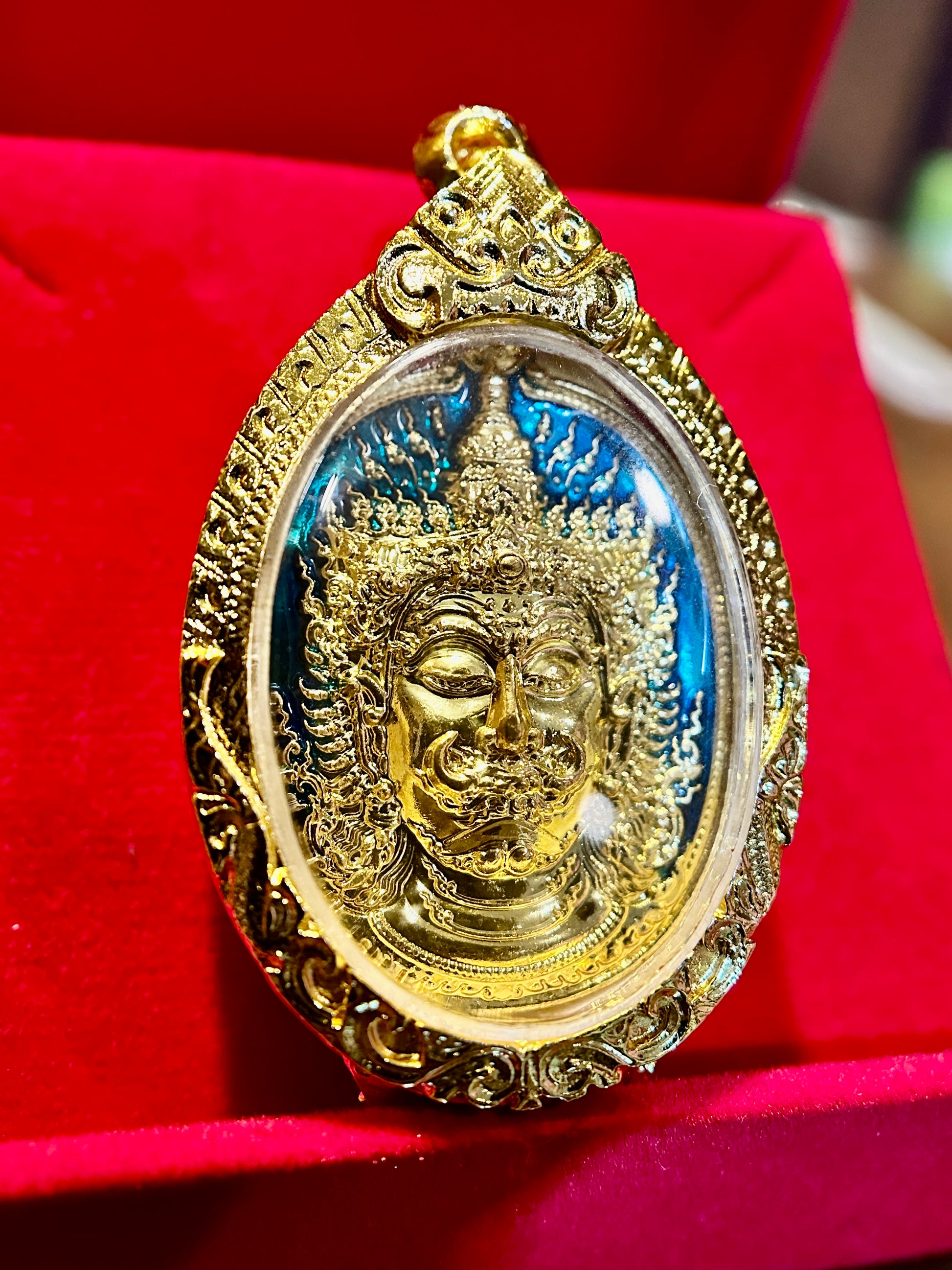 This brilliant variation pairs the commanding presence of Tao Wessuwan with the cosmic power of Phra Rahu, brought to life in rich gold and deep sapphire tones. The striking color contrast amplifies the amulet’s protective and transformative energy, making it both a spiritual shield and a work of art.