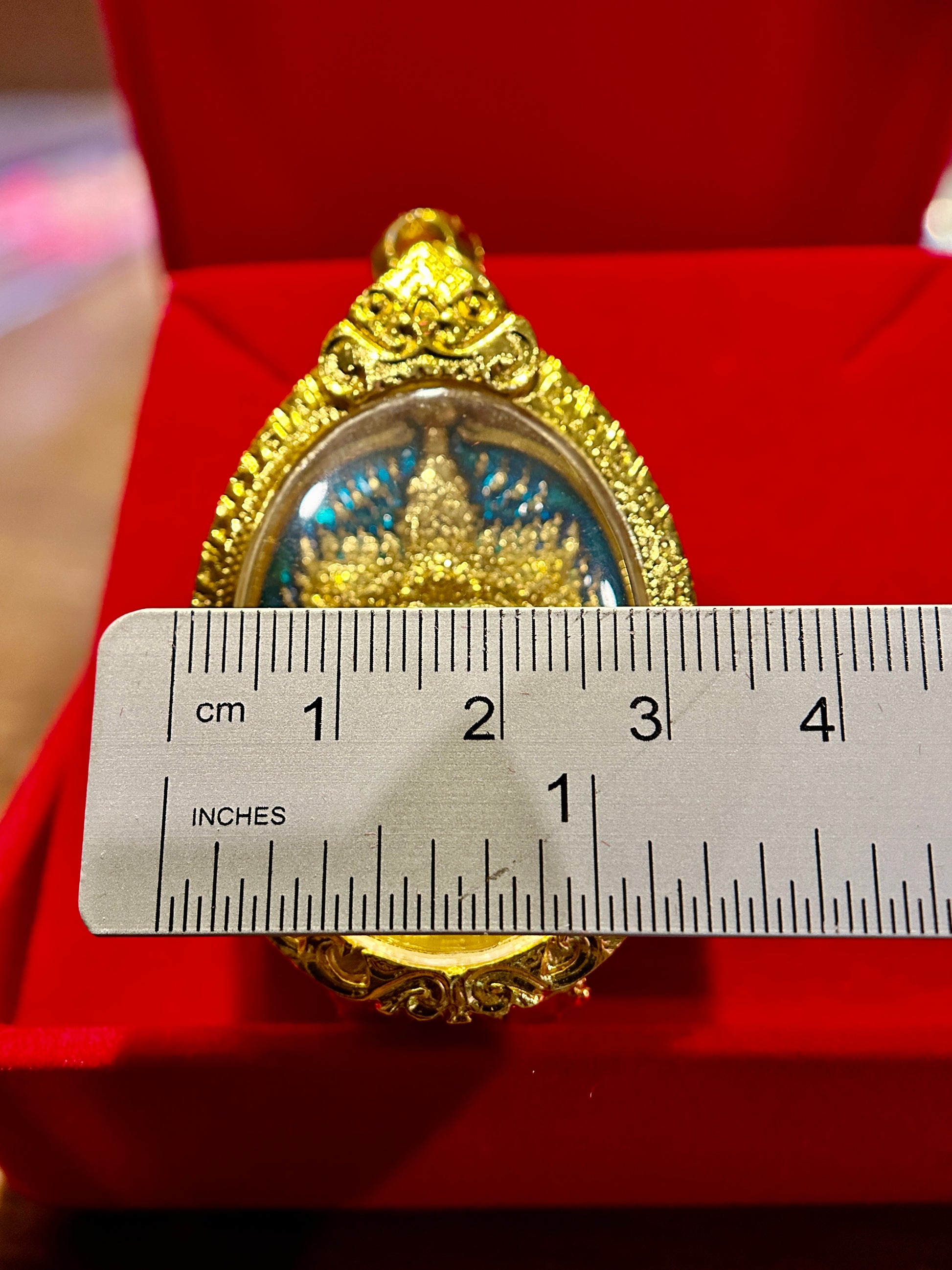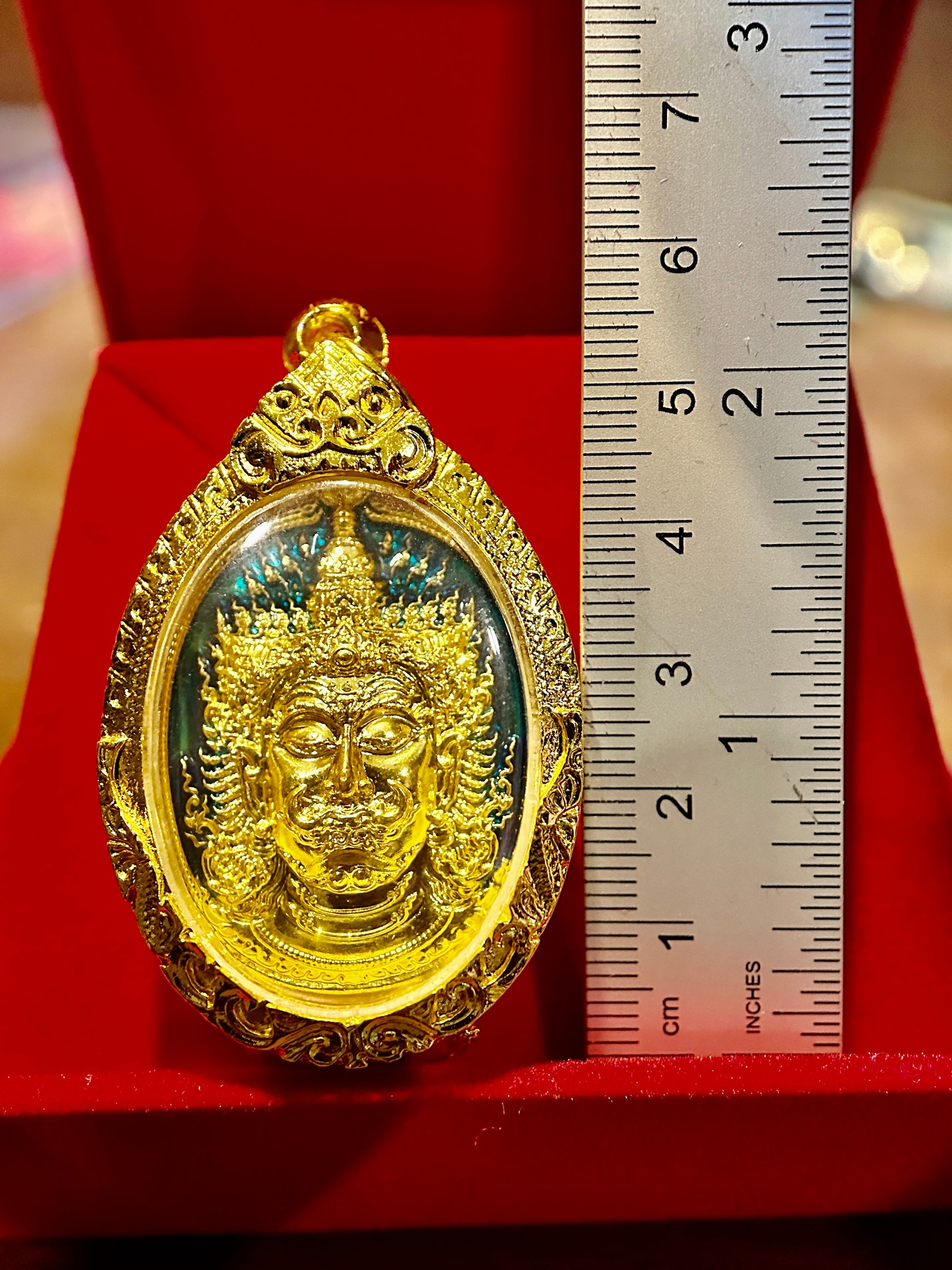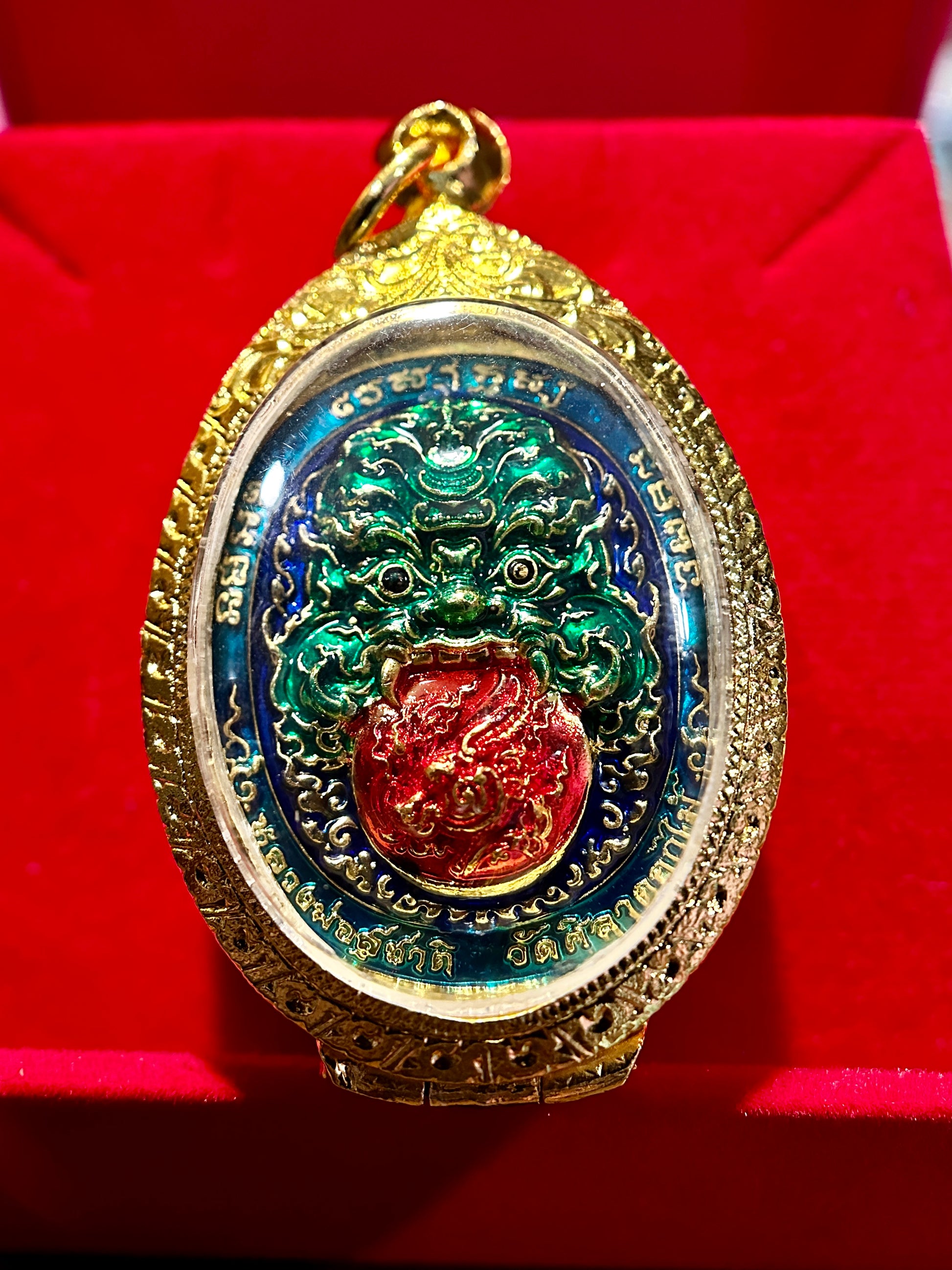 This brilliant variation pairs the commanding presence of Tao Wessuwan with the cosmic power of Phra Rahu, brought to life in rich gold and deep sapphire tones. The striking color contrast amplifies the amulet’s protective and transformative energy, making it both a spiritual shield and a work of art.