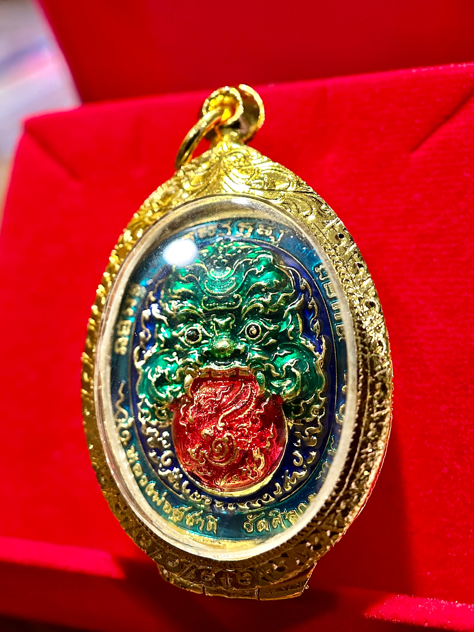 The reverse showcases Phra Rahu in shimmering green and gold, clutching his signature crimson orb — a celestial symbol of eclipses and transformation. Surrounded by intricate blue-and-gold detailing, Rahu is invoked to remove misfortune and turn challenges into blessings.