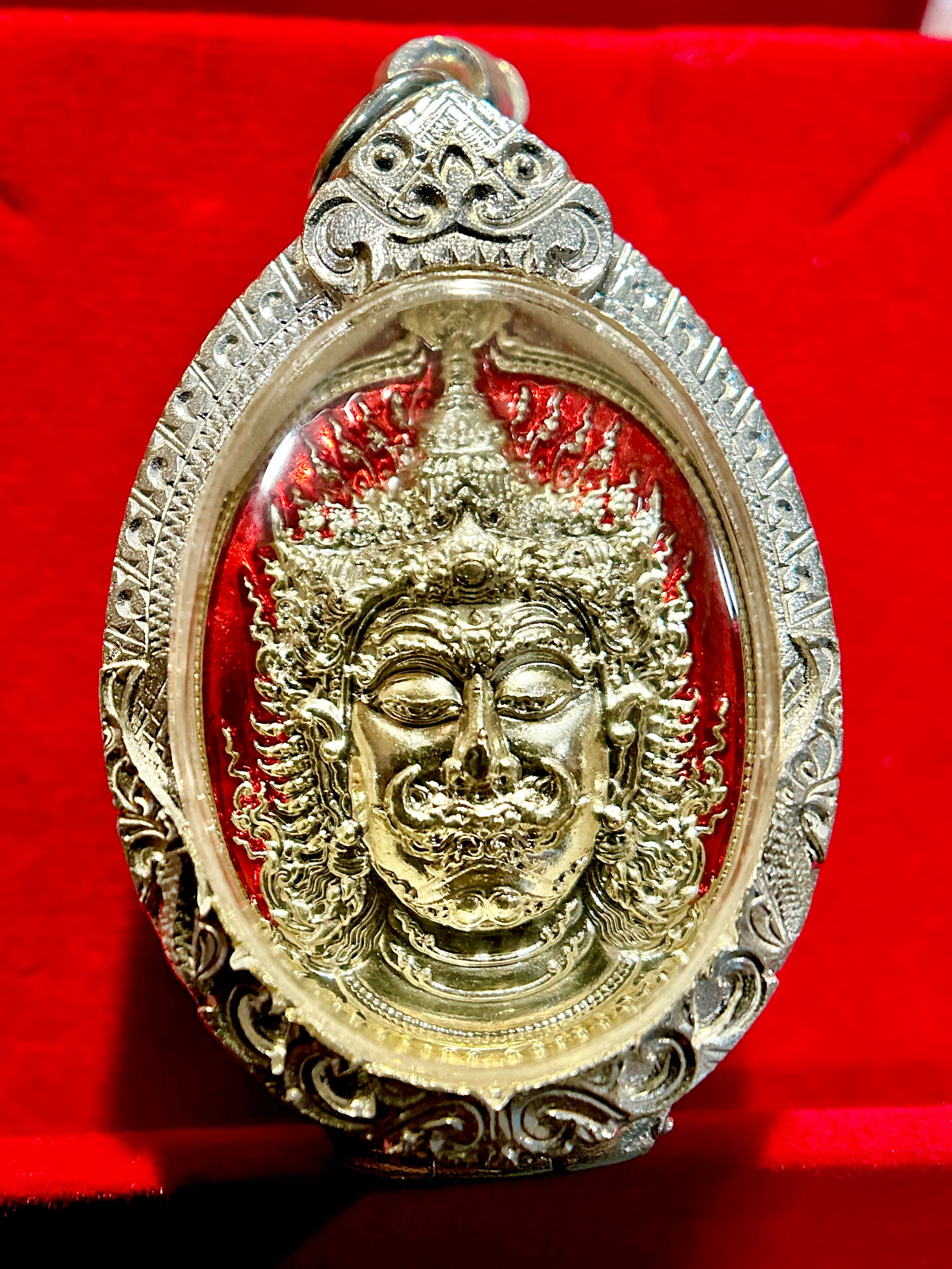 Surrounding the silver face is a vivid crimson enamel backdrop, creating a dramatic contrast known as the Crimson Flame style — symbolizing courage, inner power, and breakthrough energy. Tao Wessuwan, the guardian deity and King of Yaksha, is revered for: