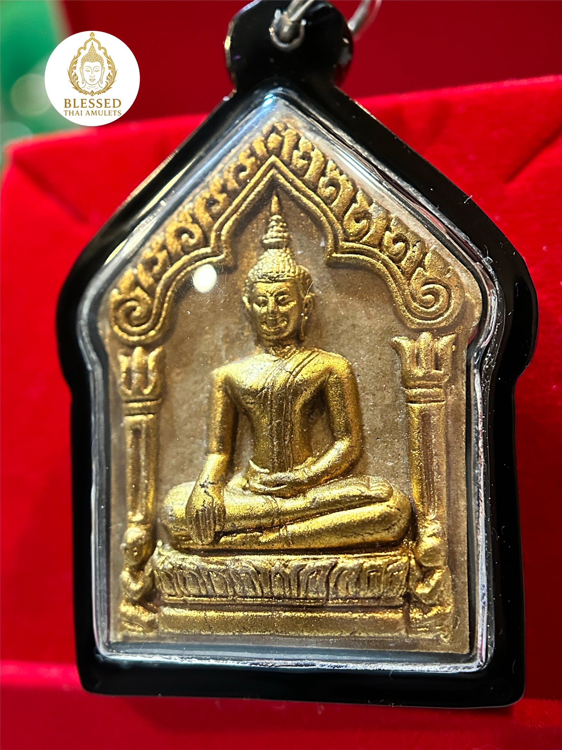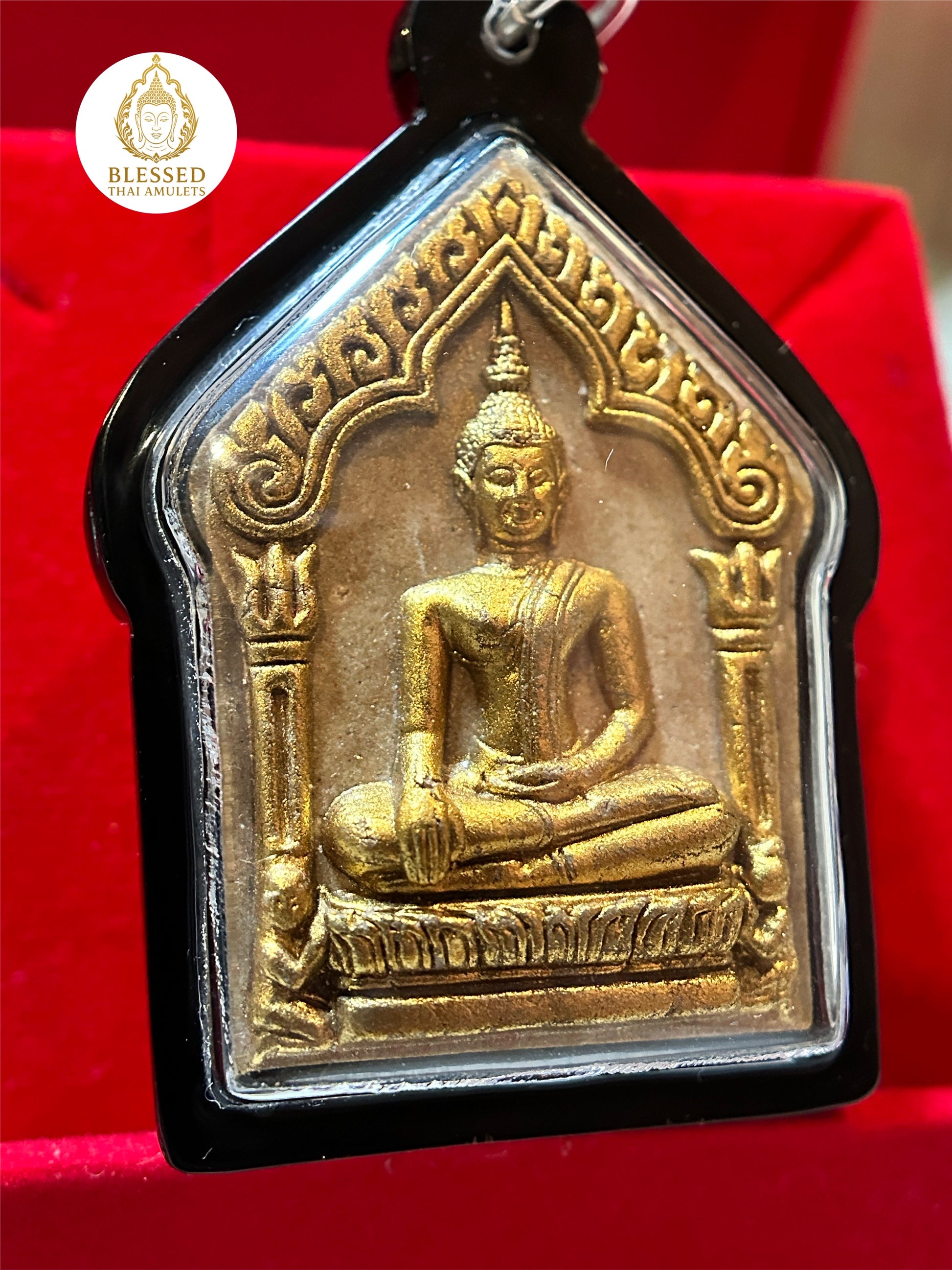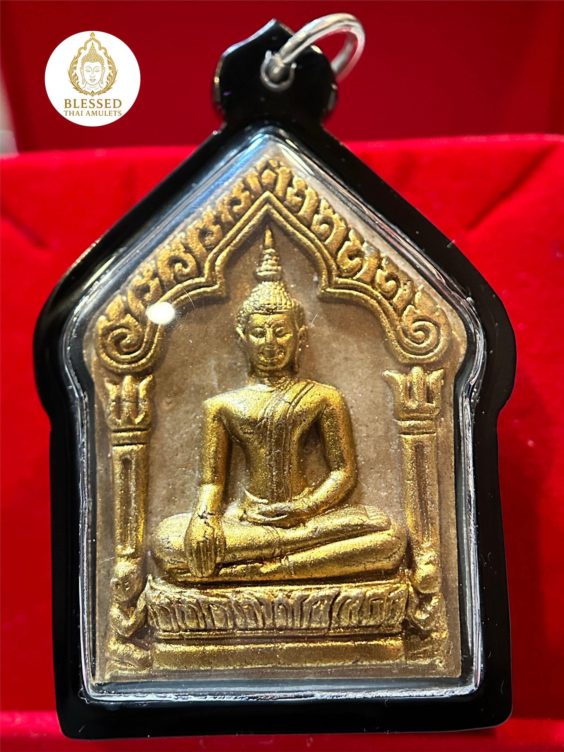 This sacred Thai amulet features a golden Buddha seated in the earth-touching posture (Bhumisparsha Mudra), symbolizing unwavering calm, victory over temptation, and spiritual grounding. Framed within a beautifully arched temple motif, the Buddha image is cast in fine relief with a serene expression and radiant gold tone.