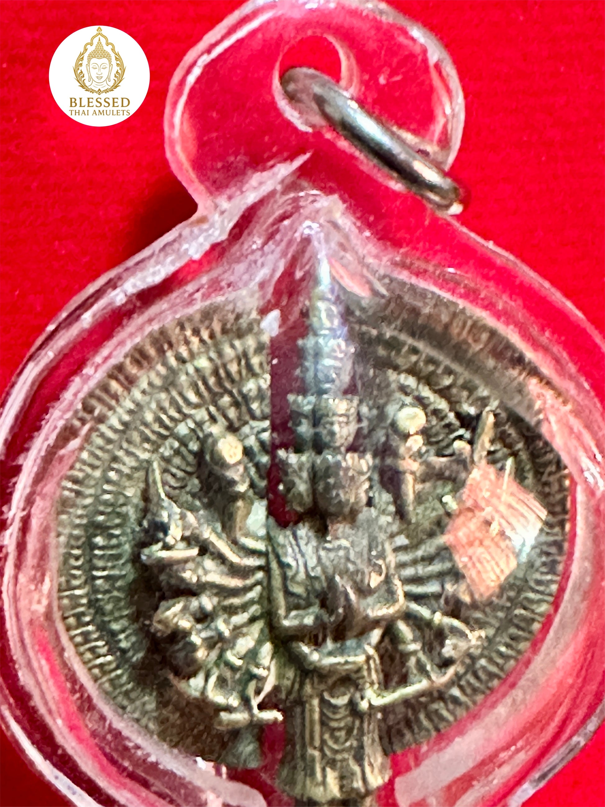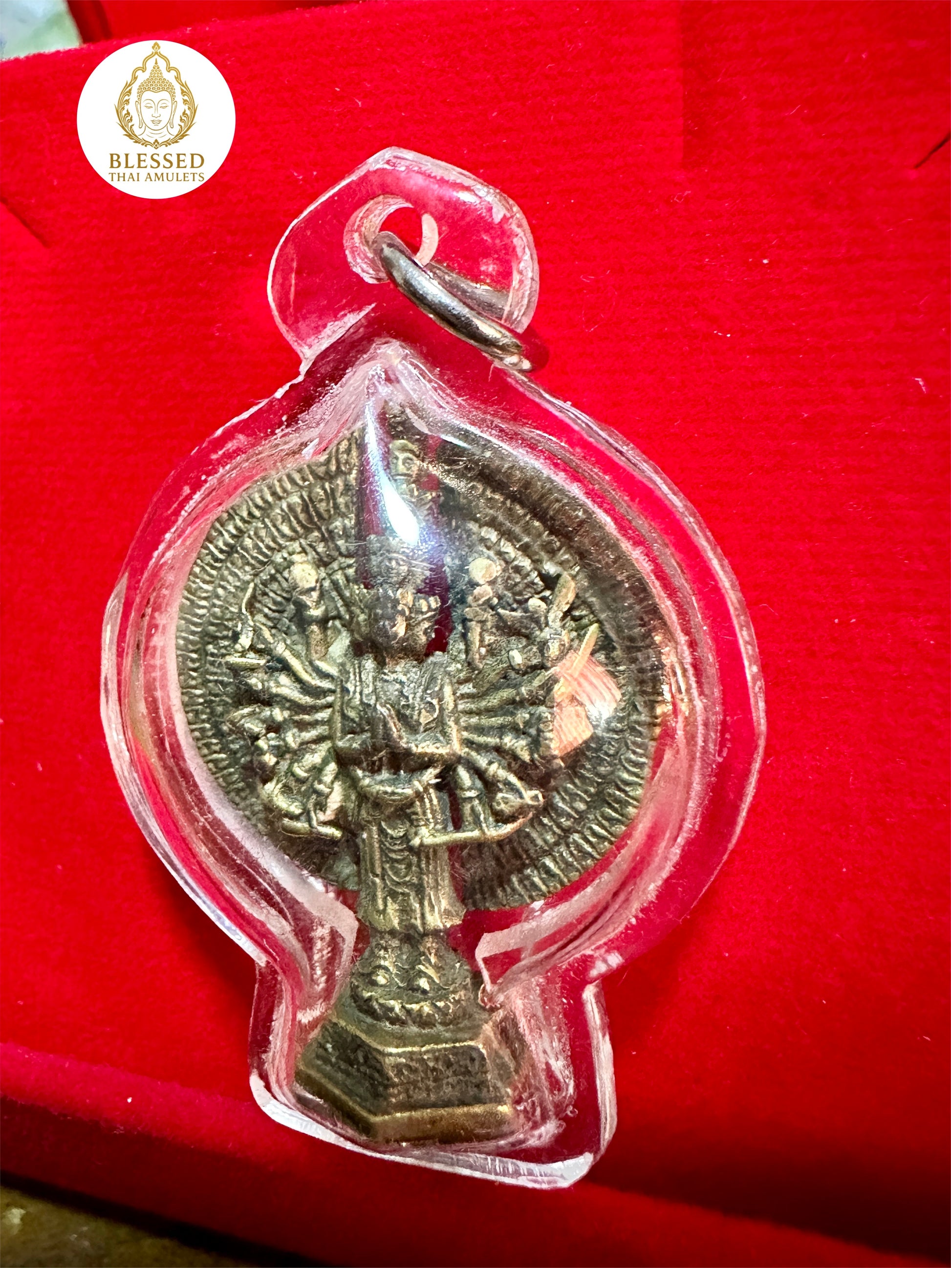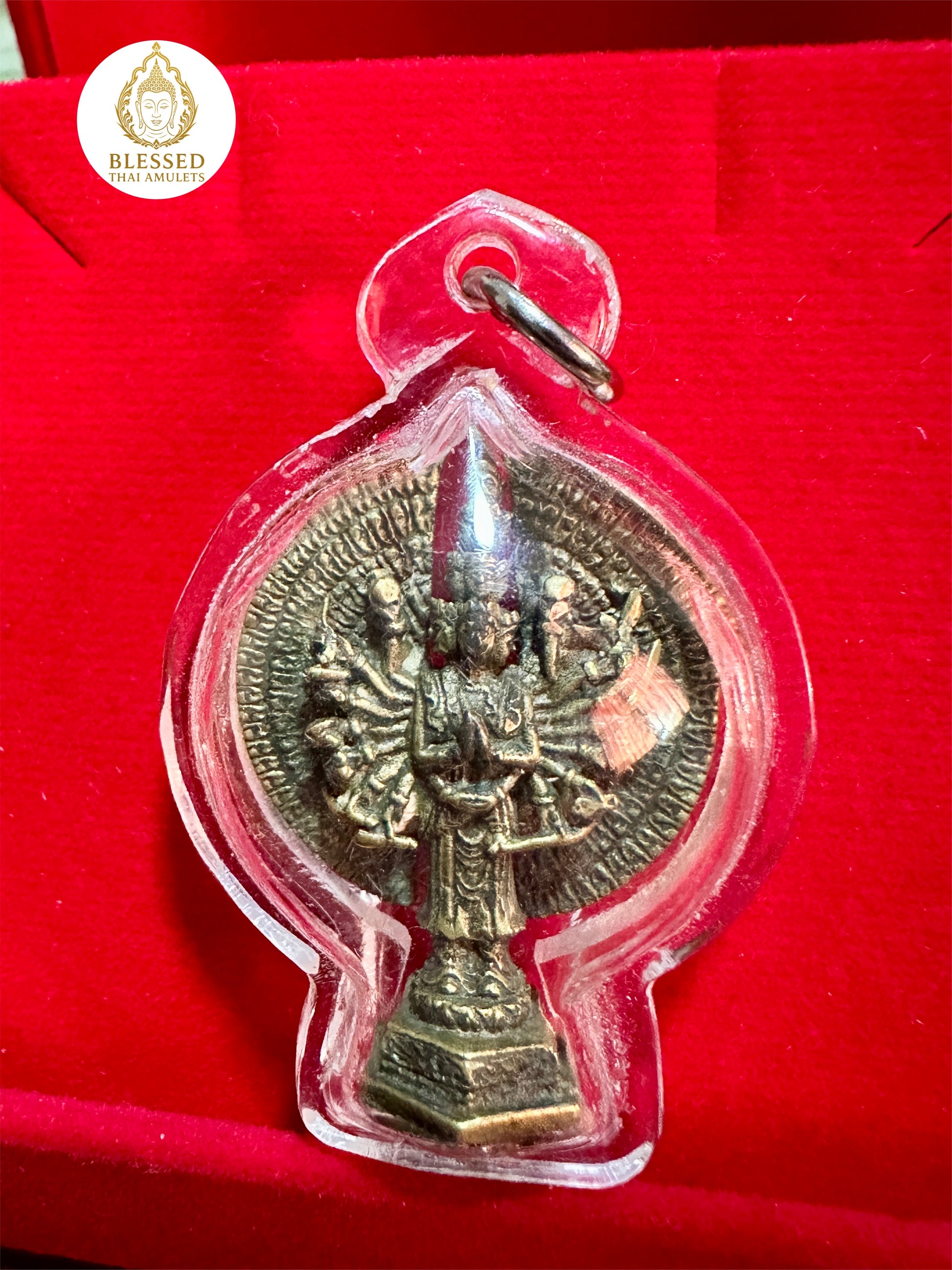 This rare and intricately detailed amulet features Guan Yin (Kuan Im), the revered Bodhisattva of Compassion, depicted in her “Thousand Arms” form—each arm symbolizing her boundless ability to reach out and assist all beings. Standing with regal grace, Guan Yin holds sacred objects in her many hands, embodying wisdom, mercy, and divine intervention. Her radiant crown and serene expression reflect deep spiritual presence and unwavering compassion.