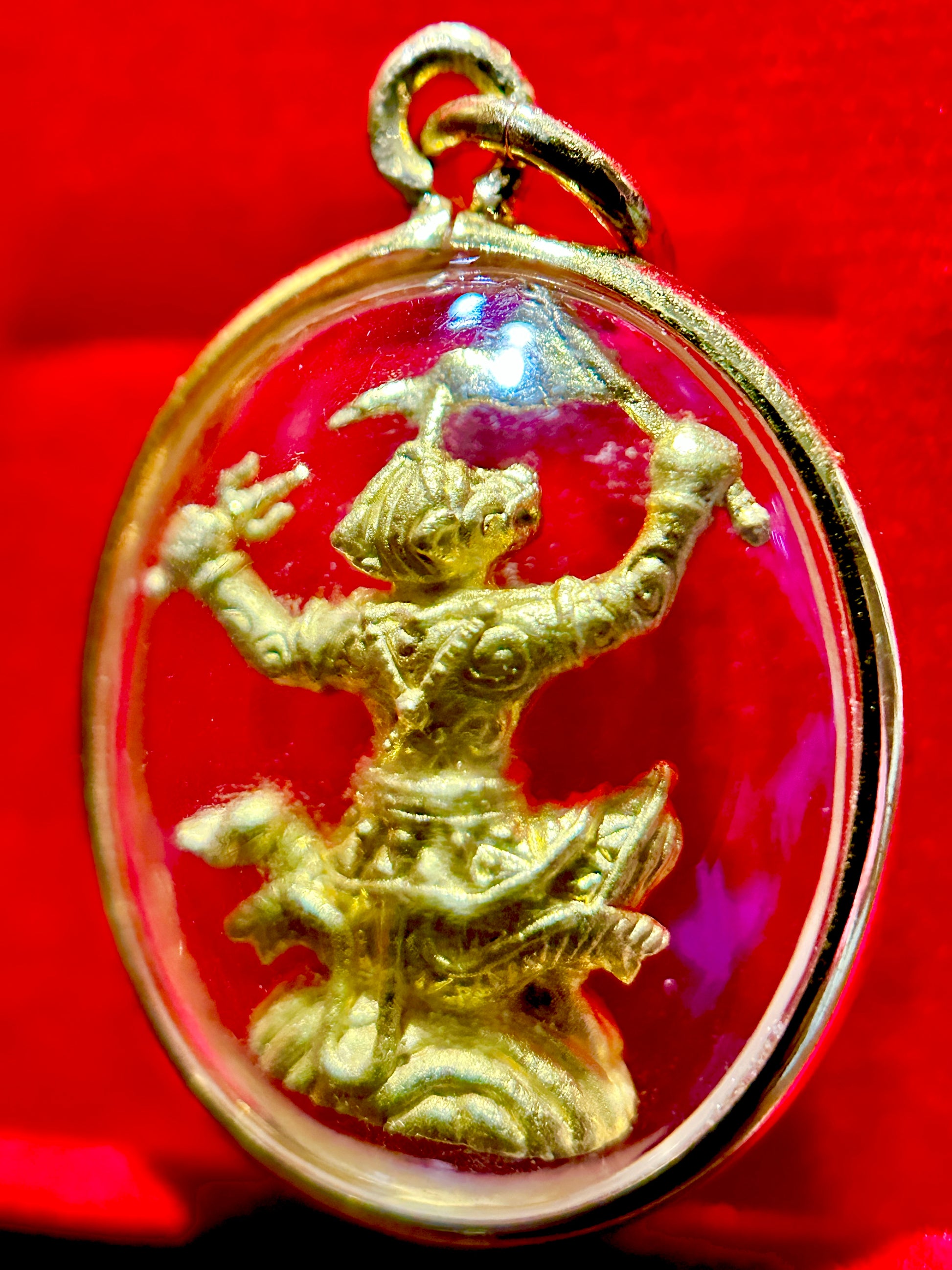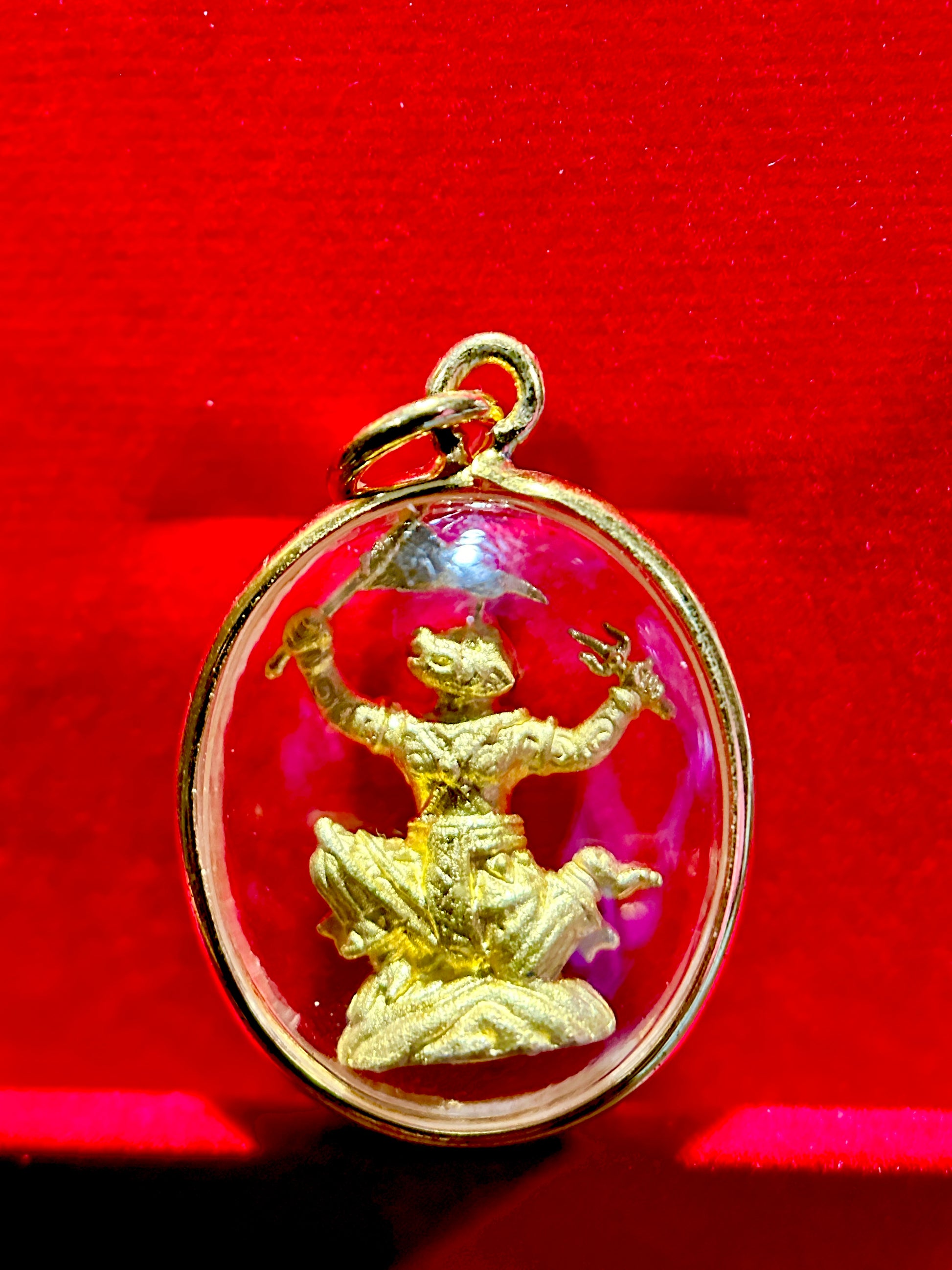 This striking golden amulet features Hanuman, the heroic monkey god, captured mid-leap with weapons raised—symbolizing fearless action, undying loyalty, and victory over adversity. Hanuman is known for his unshakable devotion, supernatural strength, and protective power, making this amulet ideal for fighters, leaders, and spiritual warriors. The three-dimensional design shows Hanuman in dynamic motion, leaping from a rock base with expressive detail on both front and back.
