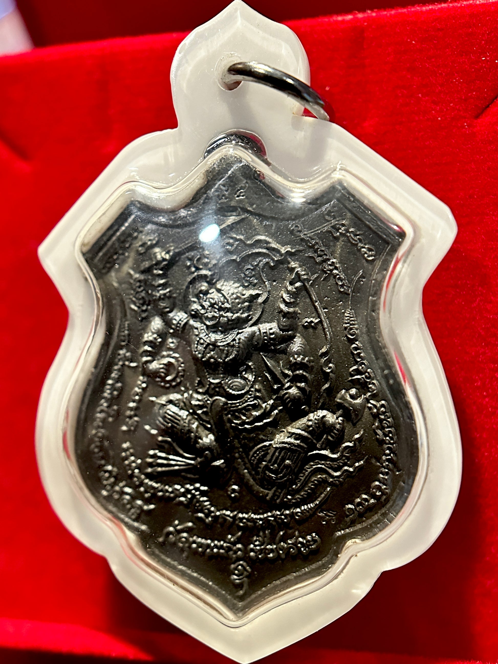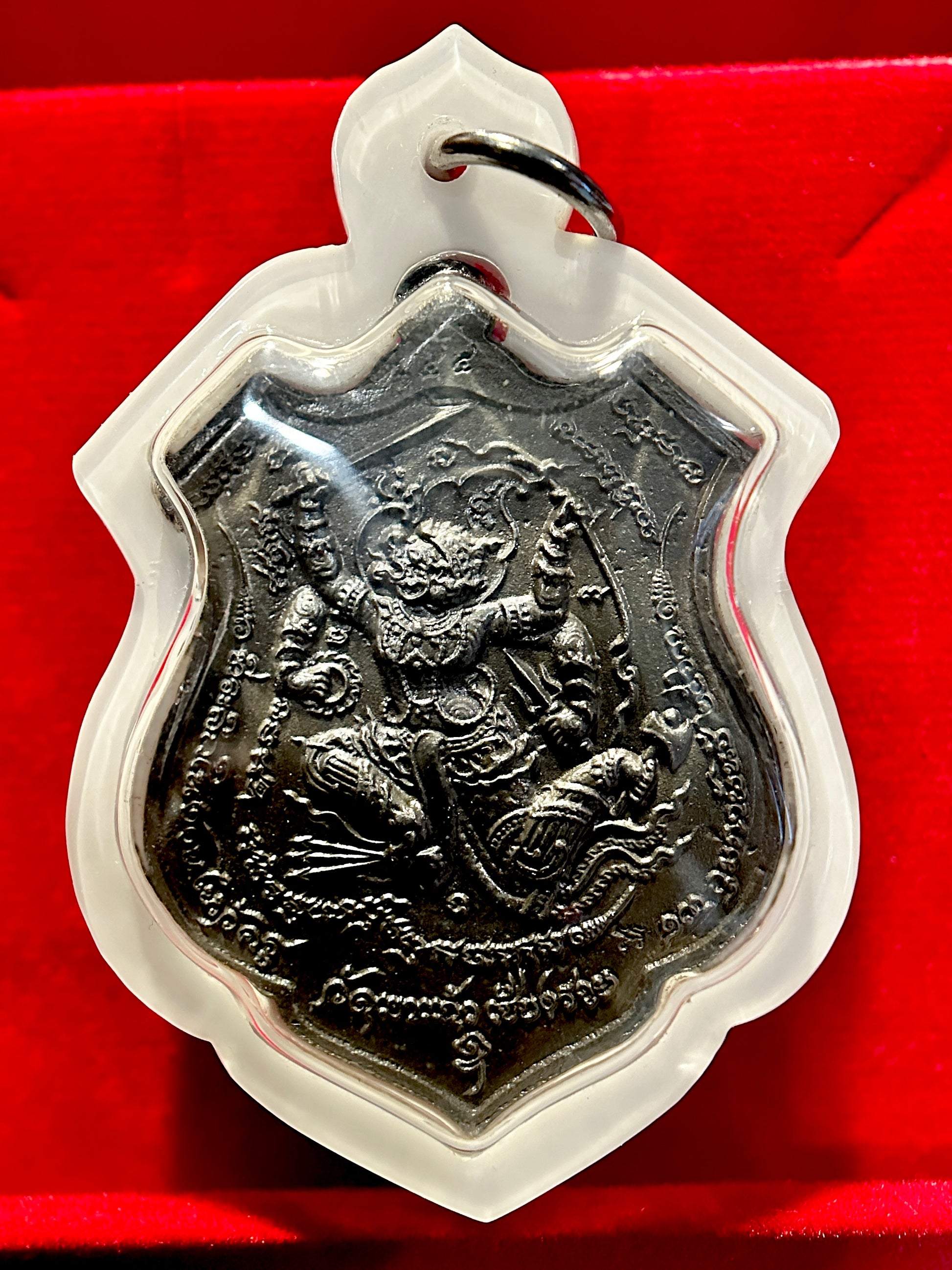 🔹 Front: Hanuman is depicted in a fierce battle-ready pose, brandishing his mace and sword while riding the mythical fish Pla Tapian. As the symbol of bravery, loyalty, and invincibility, Hanuman is revered for granting victory in both physical and spiritual battles—making this side ideal for fighters, warriors, and those needing resilience and focus.