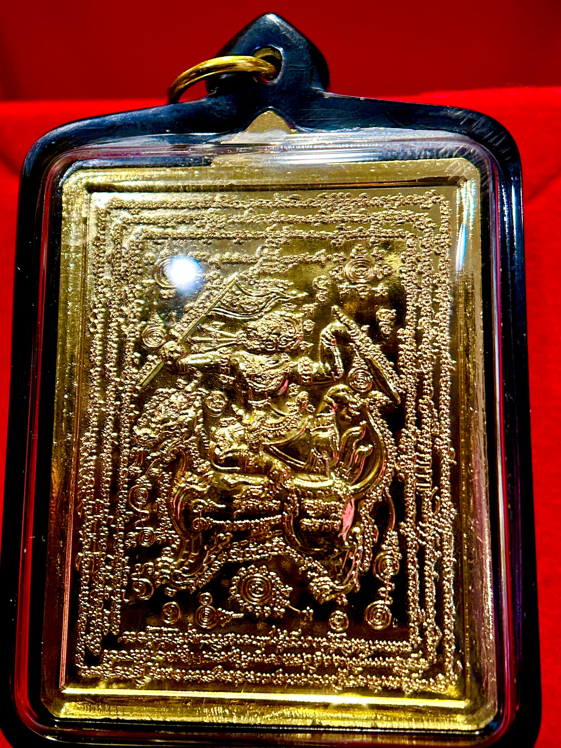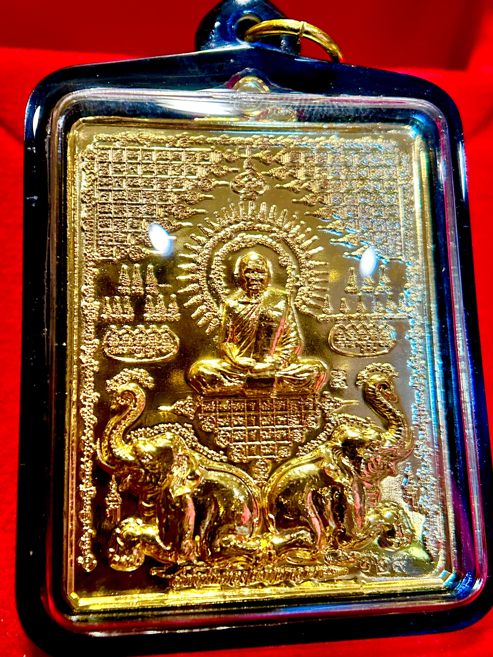 This striking dual-sided amulet unites three powerful symbols of Thai spiritual tradition—an enlightened monk, sacred elephants, and the warrior deity Hanuman—crafted in a radiant gold-toned finish and encased in a deep black frame for contrast and protection.