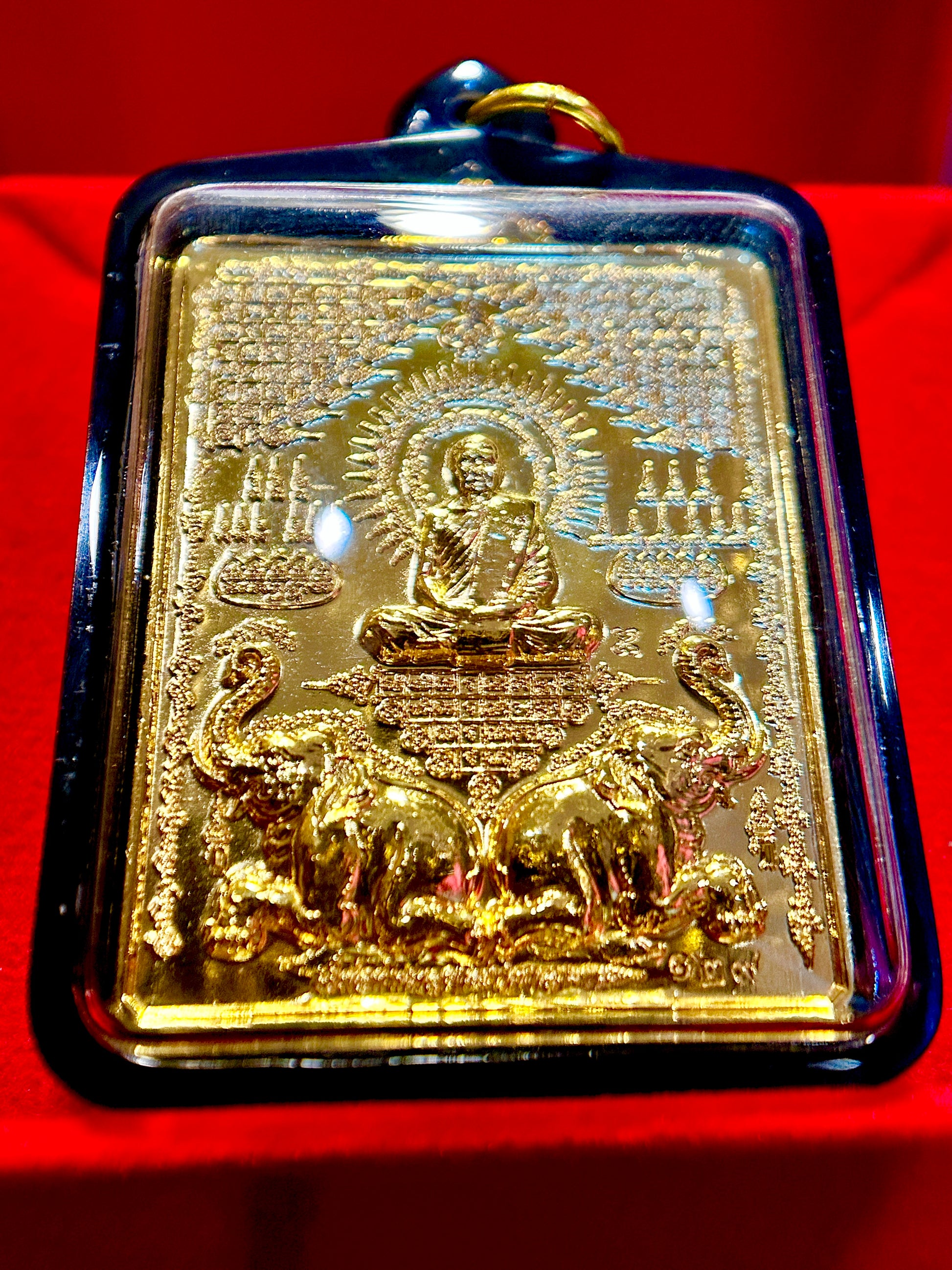 The front features a revered monk seated in meditation, radiating calm authority and spiritual mastery. A circular aura surrounds the monk’s head, emphasizing enlightenment and inner clarity. Beneath him stand two elephants facing outward, symbols of strength, stability, wisdom, and royal power in Thai belief.