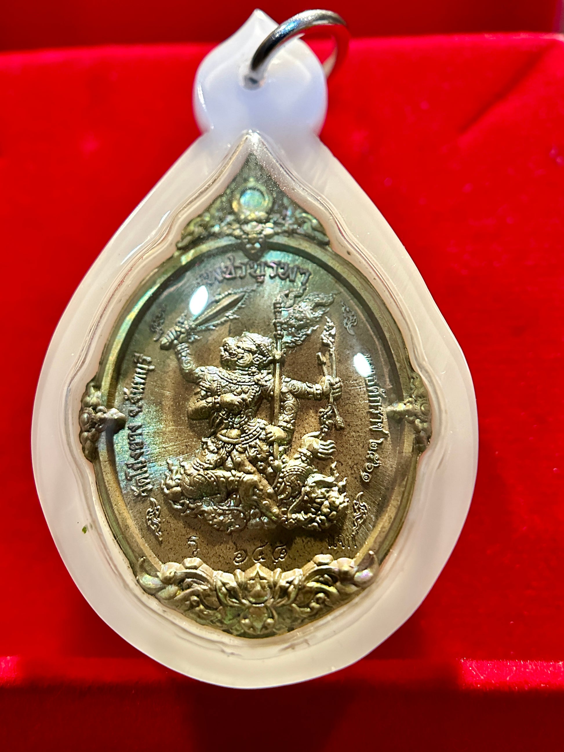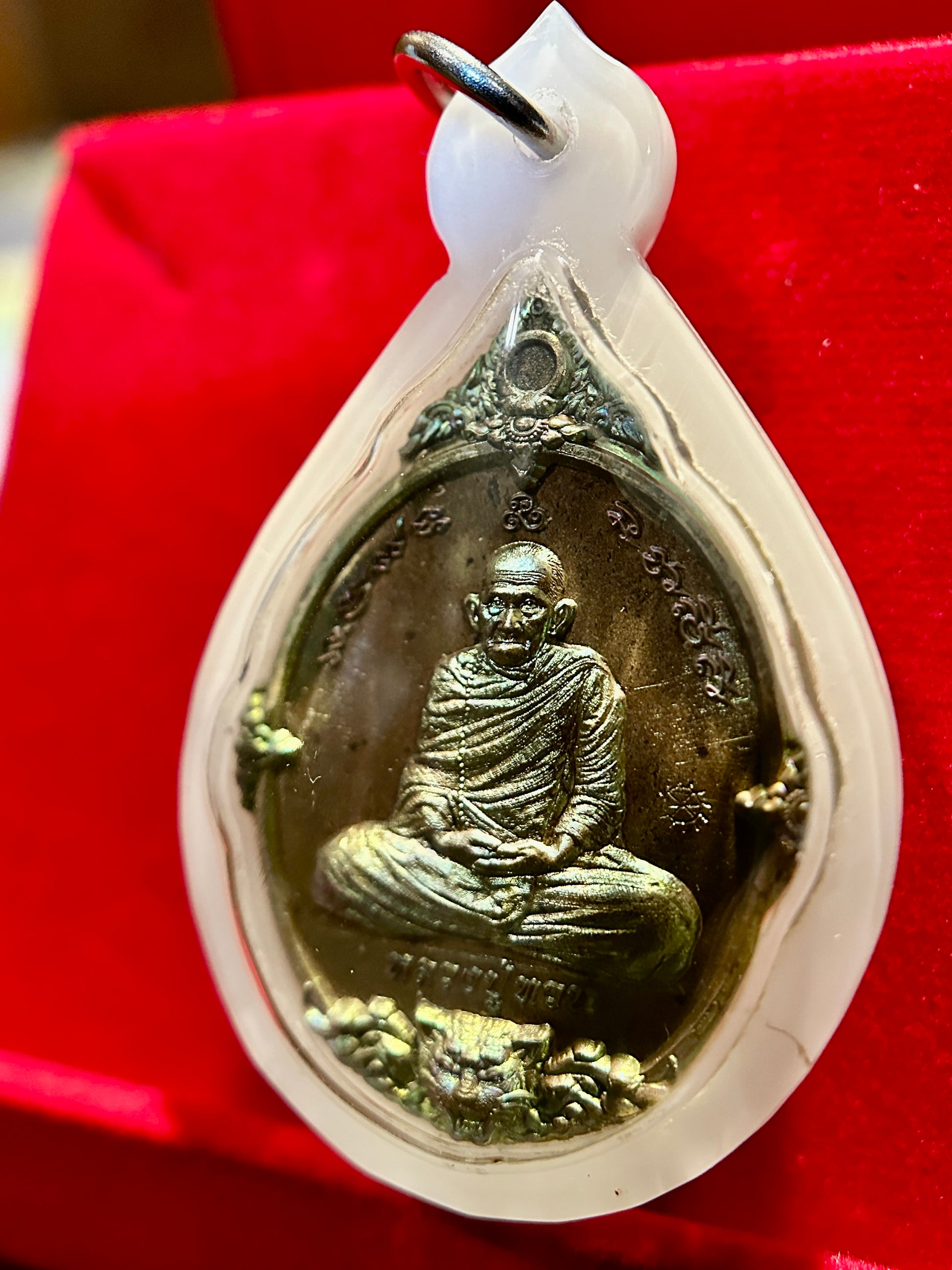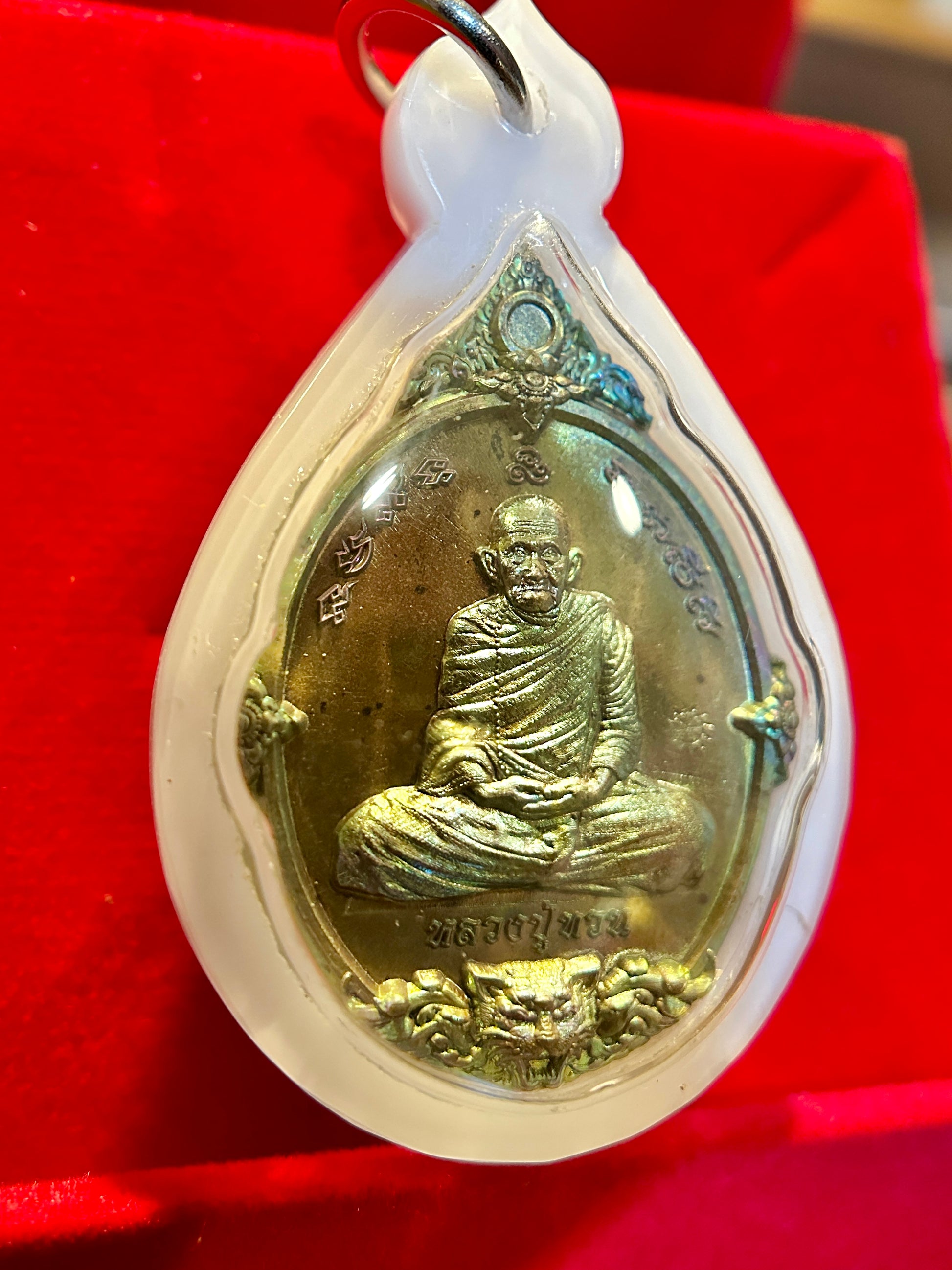 A radiant dual-sided amulet featuring the legendary Luang Pu Thuat on the front, seated in serene meditation. His image is framed by sacred yantras and flanked by two powerful tigers, symbolizing inner strength and protection. The amulet’s unique iridescent finish shifts in color under the light, giving it a striking presence.