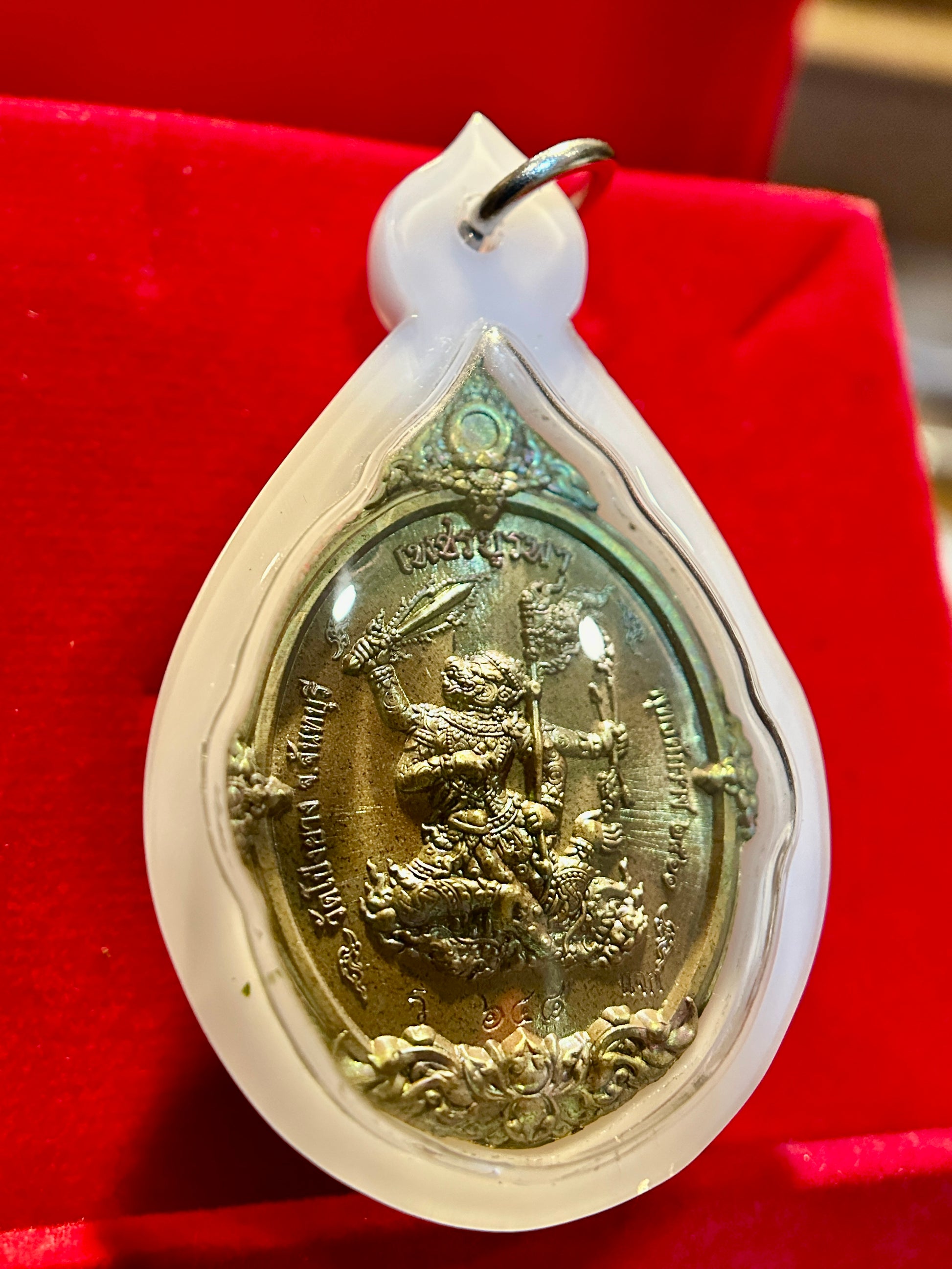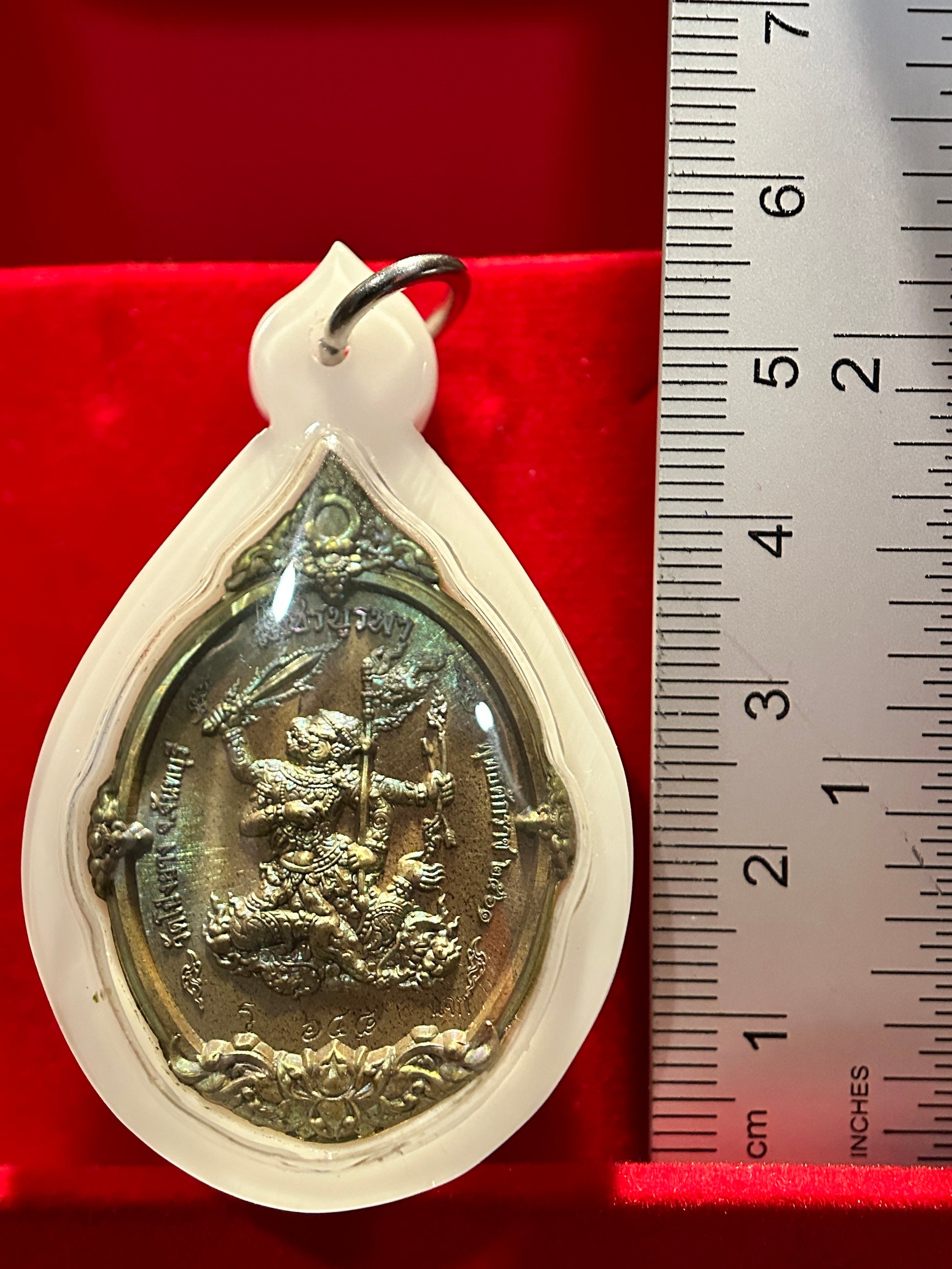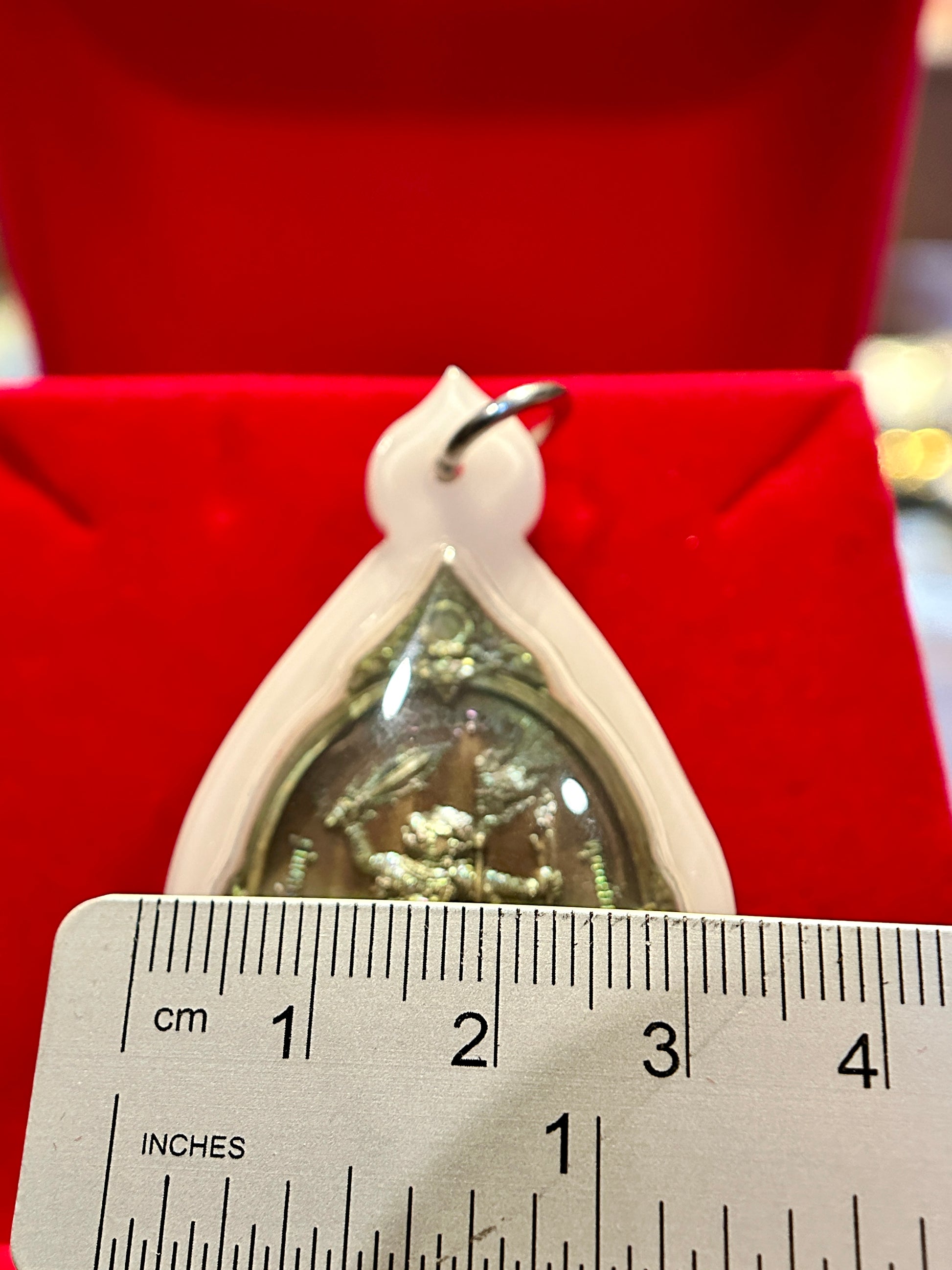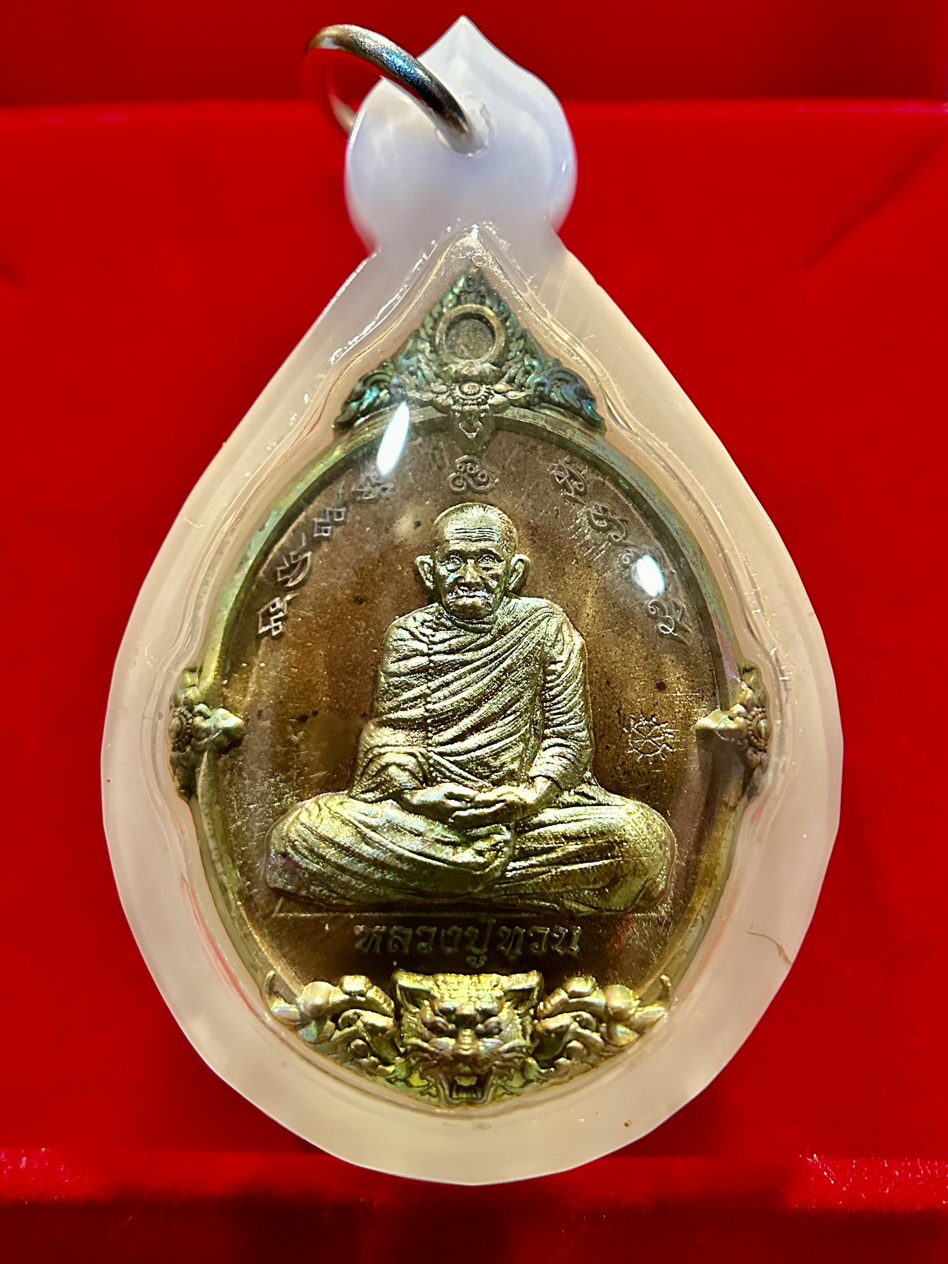 A radiant dual-sided amulet featuring the legendary Luang Pu Thuat on the front, seated in serene meditation. His image is framed by sacred yantras and flanked by two powerful tigers, symbolizing inner strength and protection. The amulet’s unique iridescent finish shifts in color under the light, giving it a striking presence.