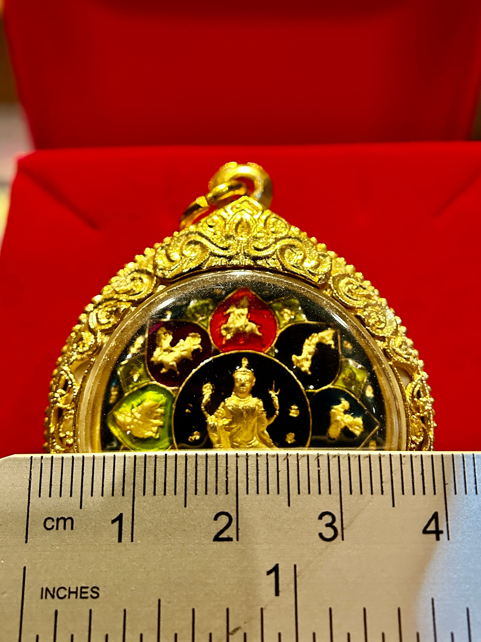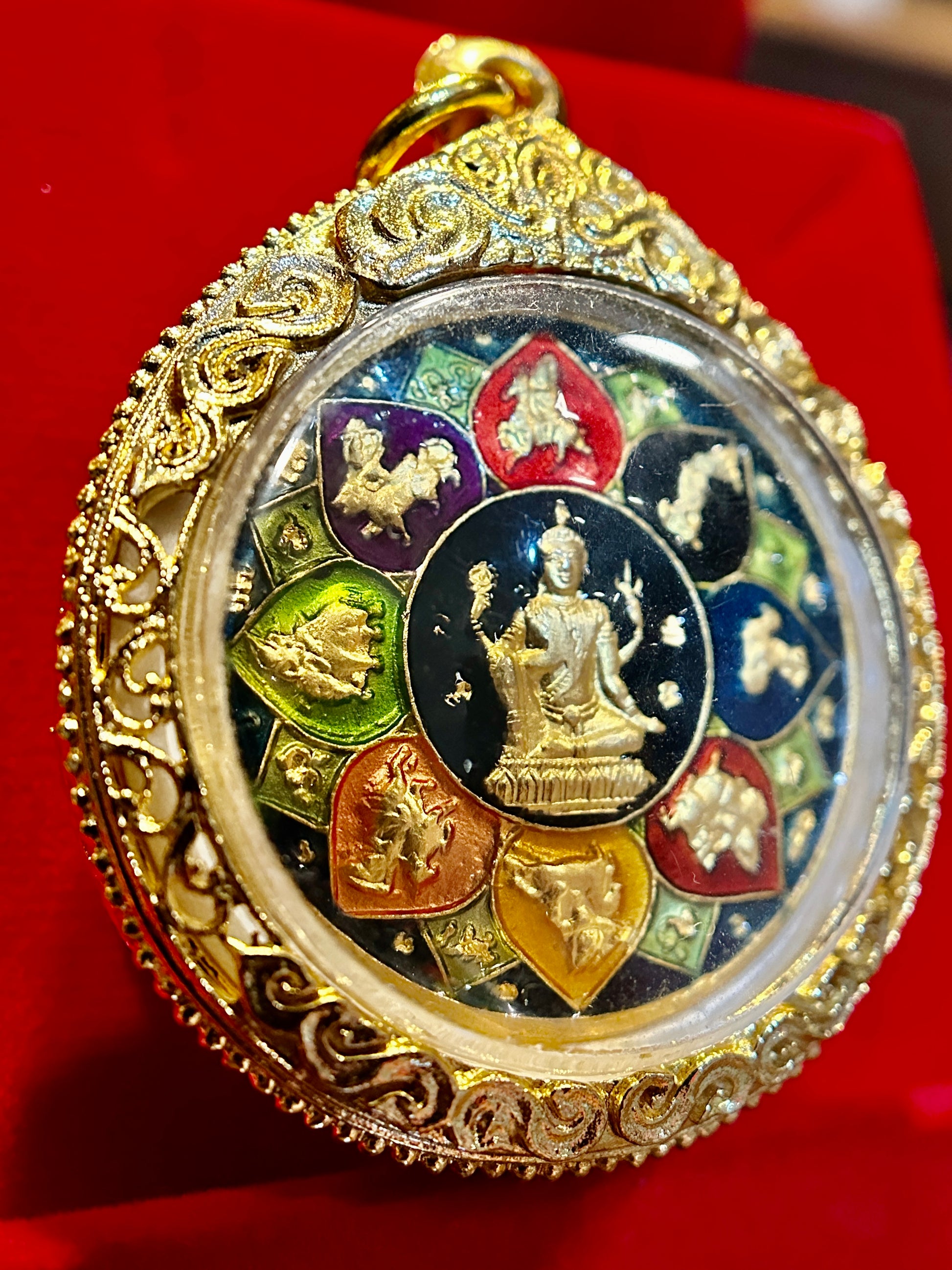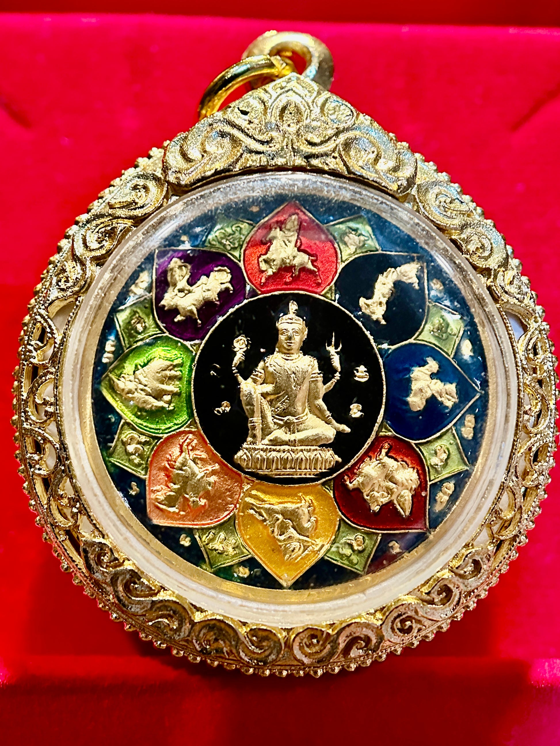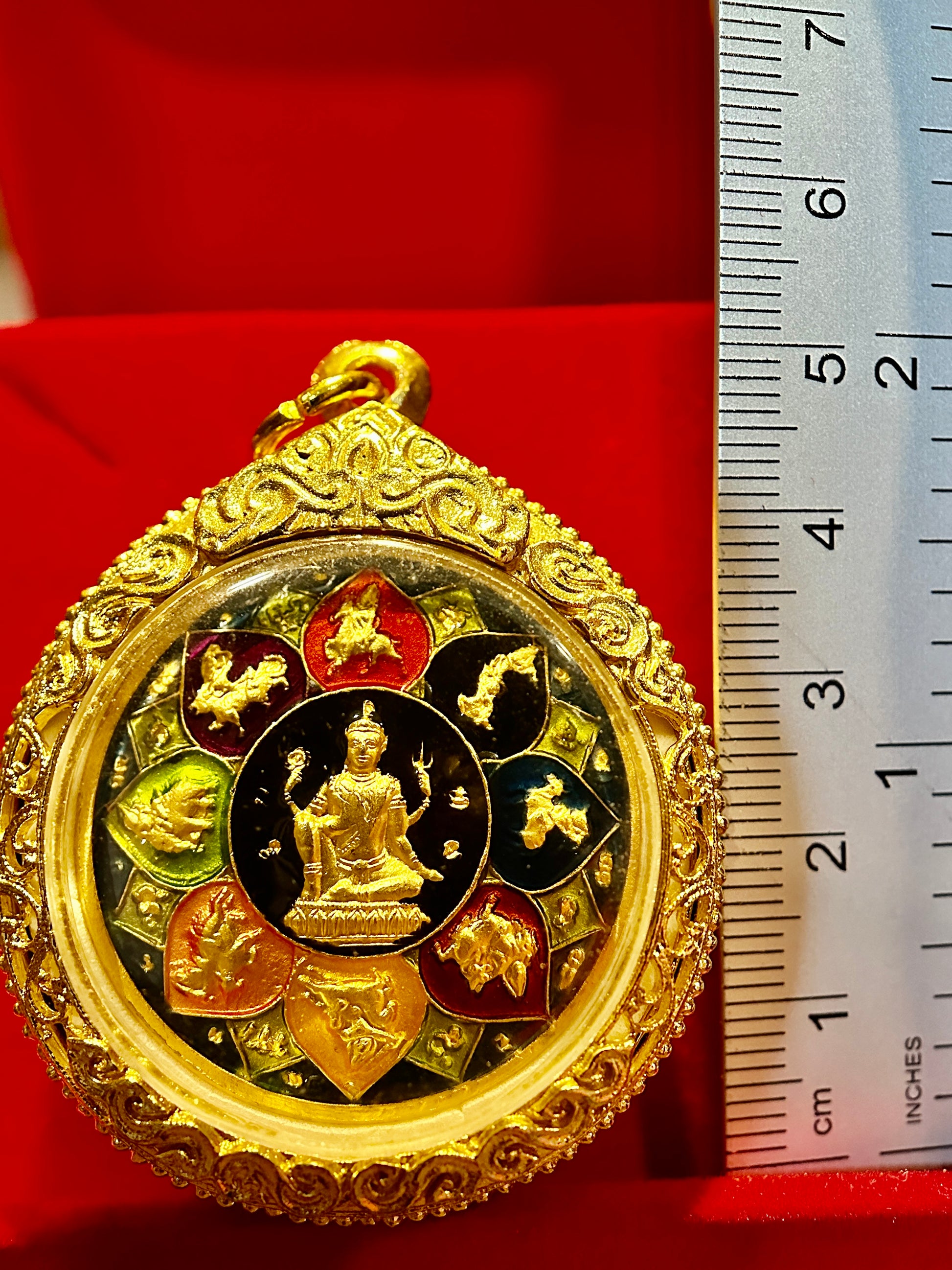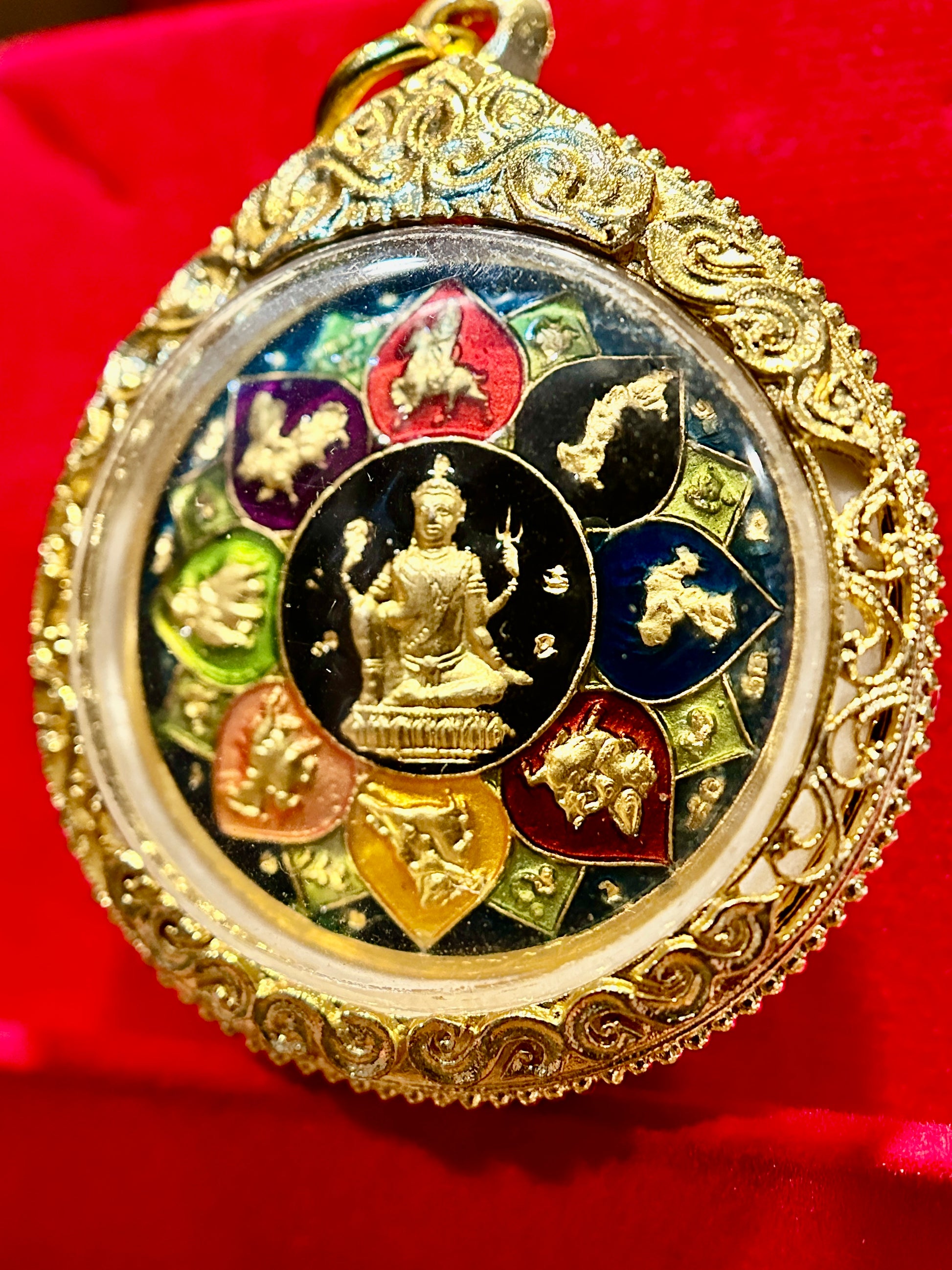 At the heart of this radiant amulet is Jatukham Rammathep, the guardian deity revered for attracting wealth, success, and powerful spiritual protection. He is seated in divine form, surrounded by a vibrant ring of the 12 zodiac animals, each rendered in its own colorful shield — representing balance, destiny, and the cyclical nature of life.