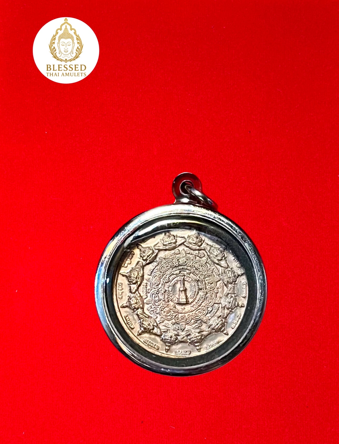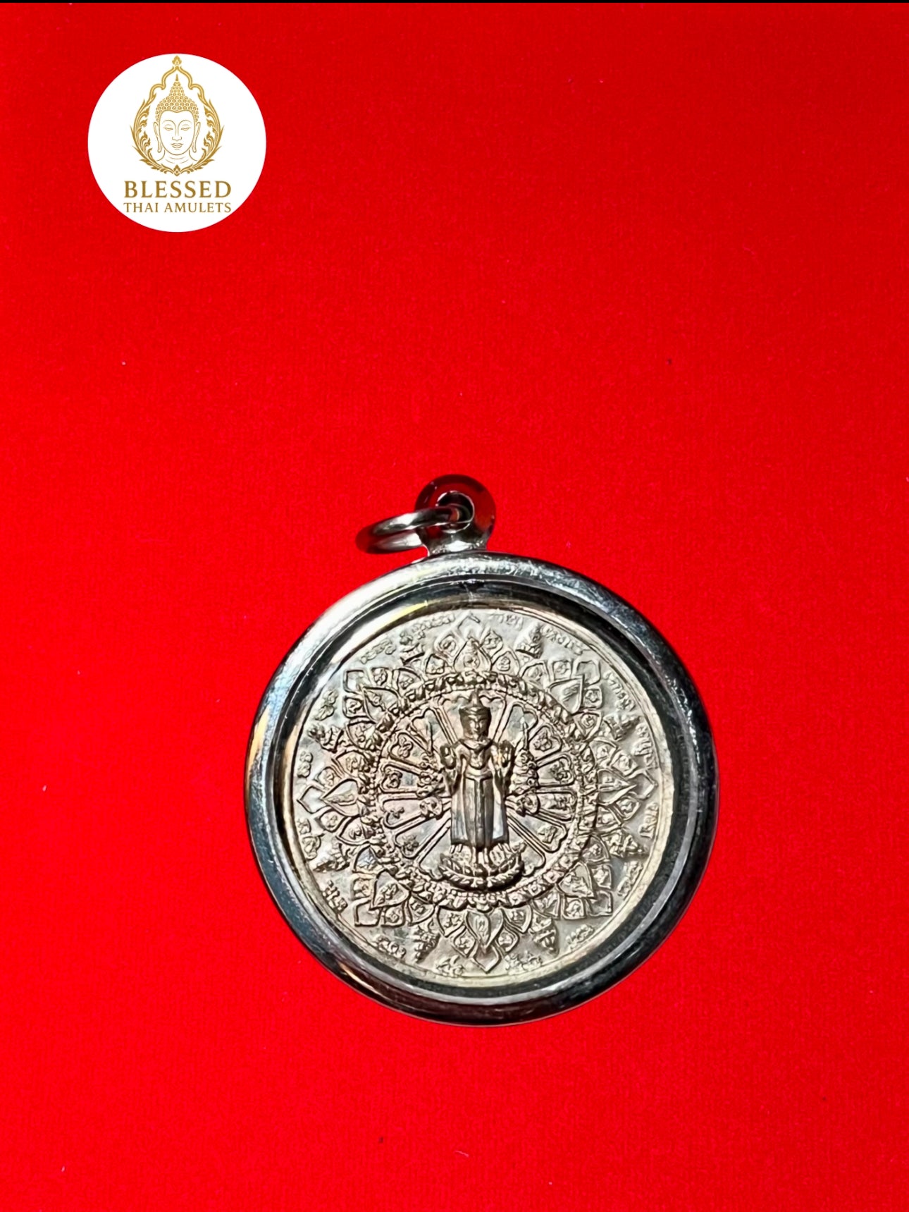 This sacred amulet features Jatukham Rammathep, a powerful deity revered across Thailand for bestowing wealth, protection, and success. The front side depicts Jatukham standing tall at the center of a radiating lotus mandala, surrounded by sacred inscriptions — symbolizing balance, spiritual power, and divine favor.