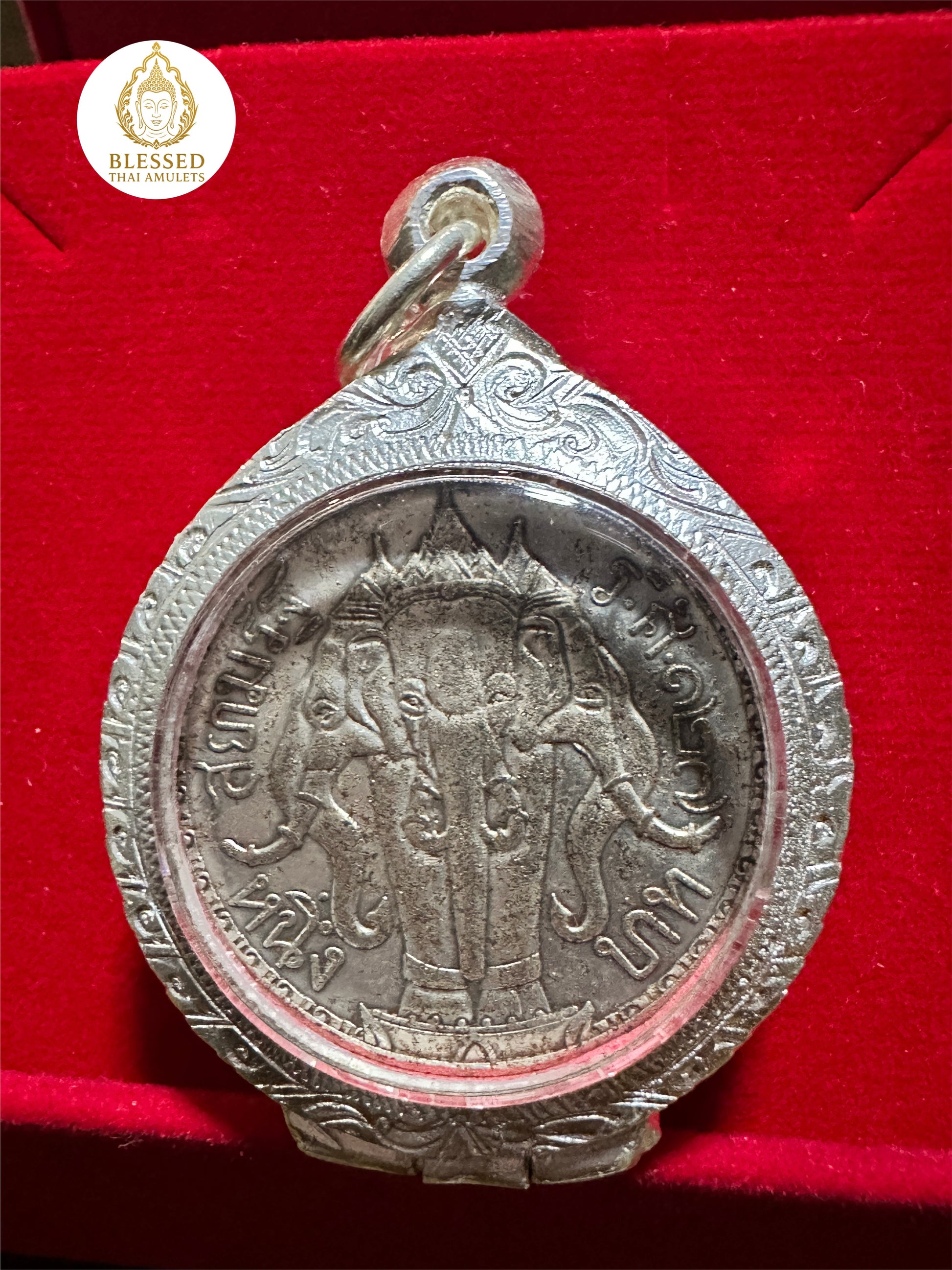 The reverse features the majestic Erawan, the three-headed elephant mount of the god Indra, symbolizing divine authority, sacred protection, and strength in all realms.