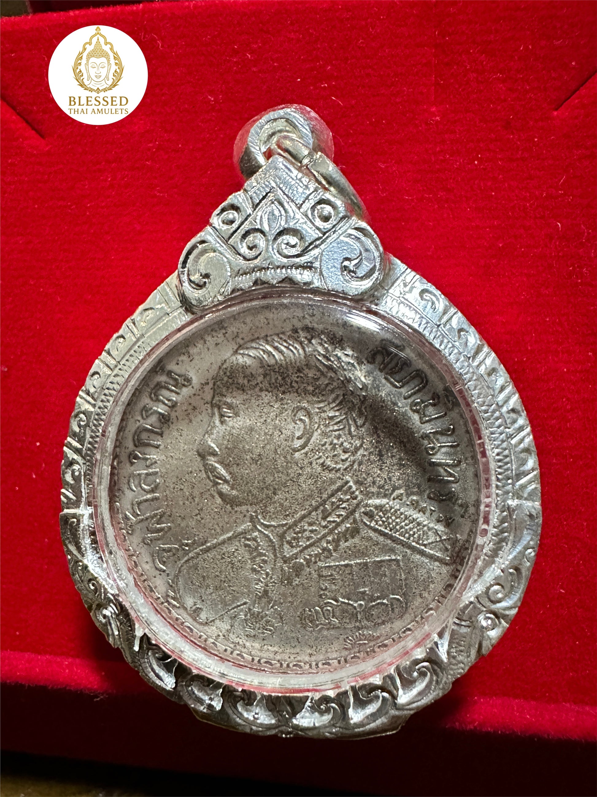 This powerful amulet is crafted from or modeled after a historic Thai silver coin bearing the portrait of King Rama V the Great (พระบาทสมเด็จพระจุลจอมเกล้าเจ้าอยู่หัว), one of Thailand’s most beloved monarchs. Revered for his wisdom, reforms, and leadership, King Chulalongkorn is honored across Thailand as a symbol of good fortune, protection, and enduring royal merit.