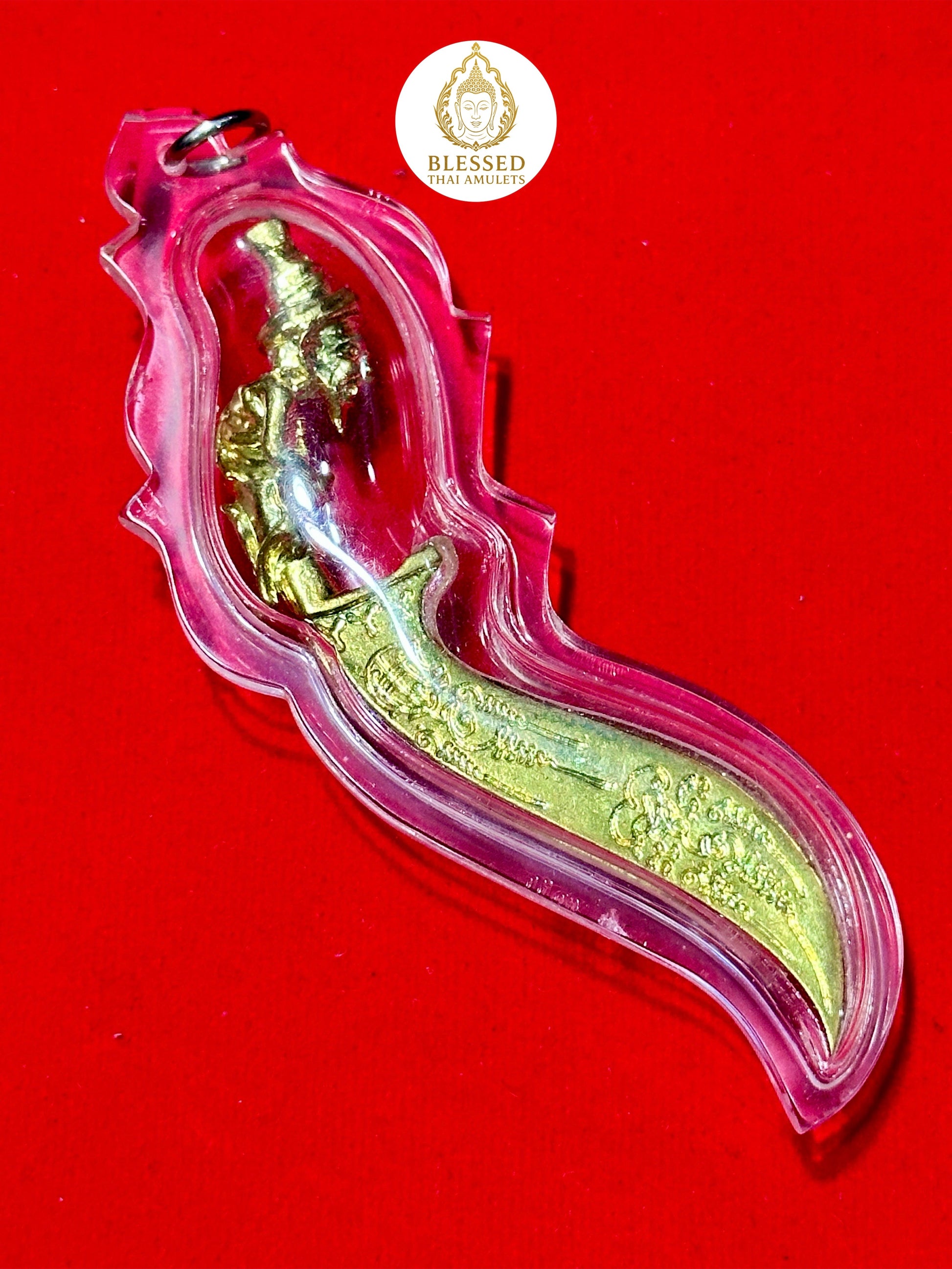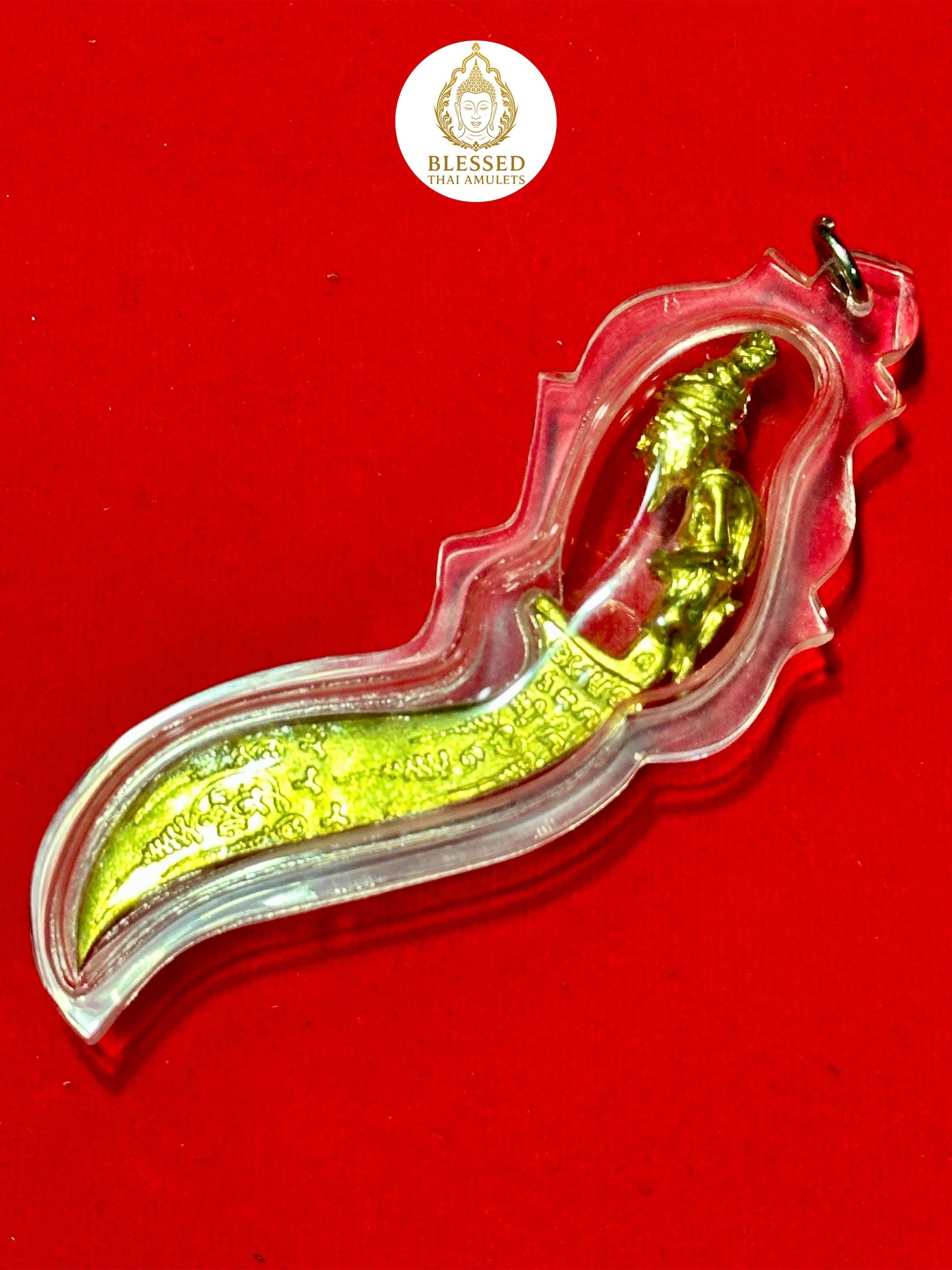 A striking golden blade amulet featuring the mystical hermit sage Lersi, seated in a meditative posture at the hilt of a sacred curved dagger. Lersi is revered for his spiritual power, deep wisdom, and mastery over occult arts. The knife blade itself is inscribed with ancient yantras and protective script, believed to ward off harm, dispel dark energy, and channel spiritual insight to its wearer.