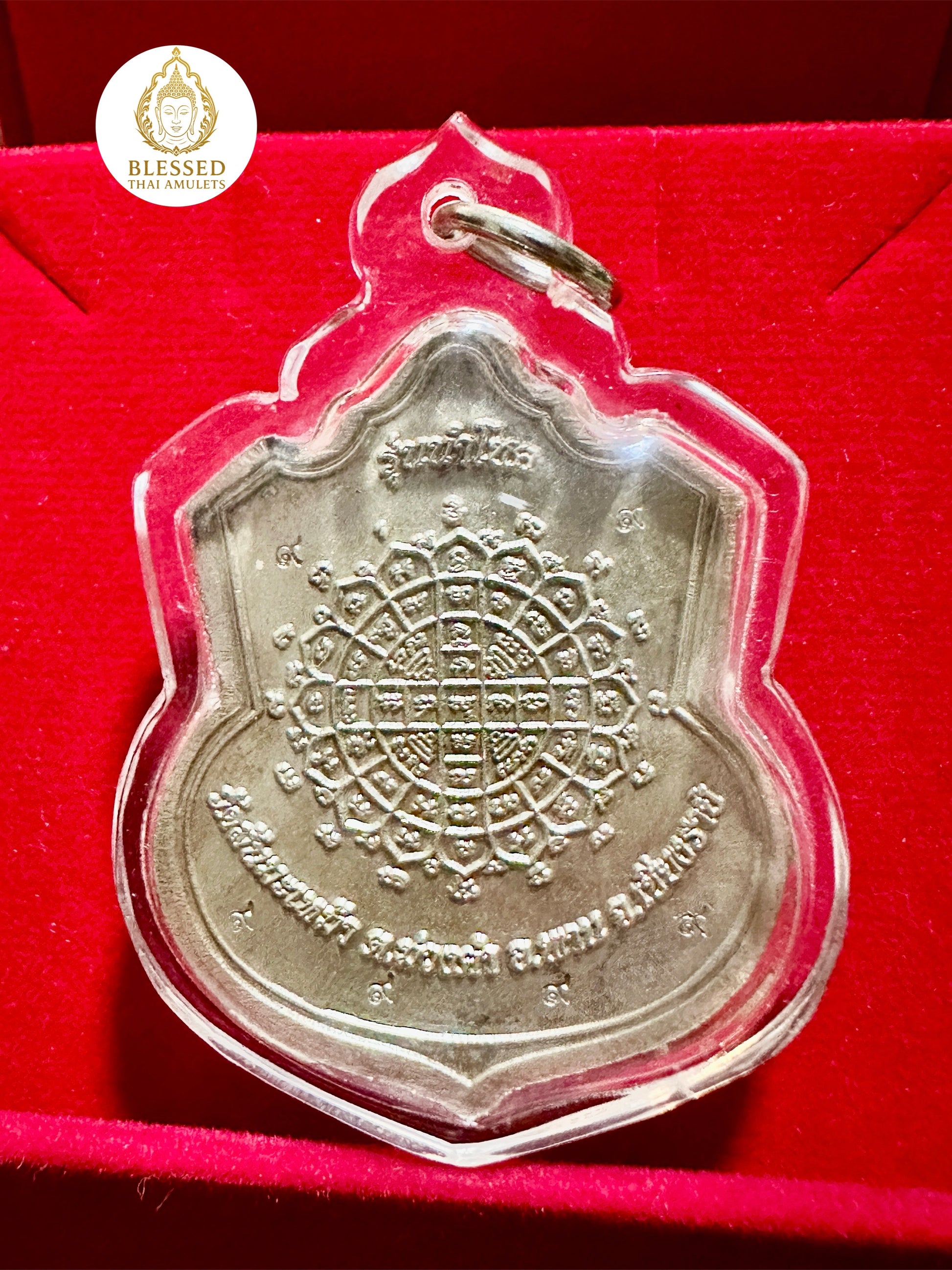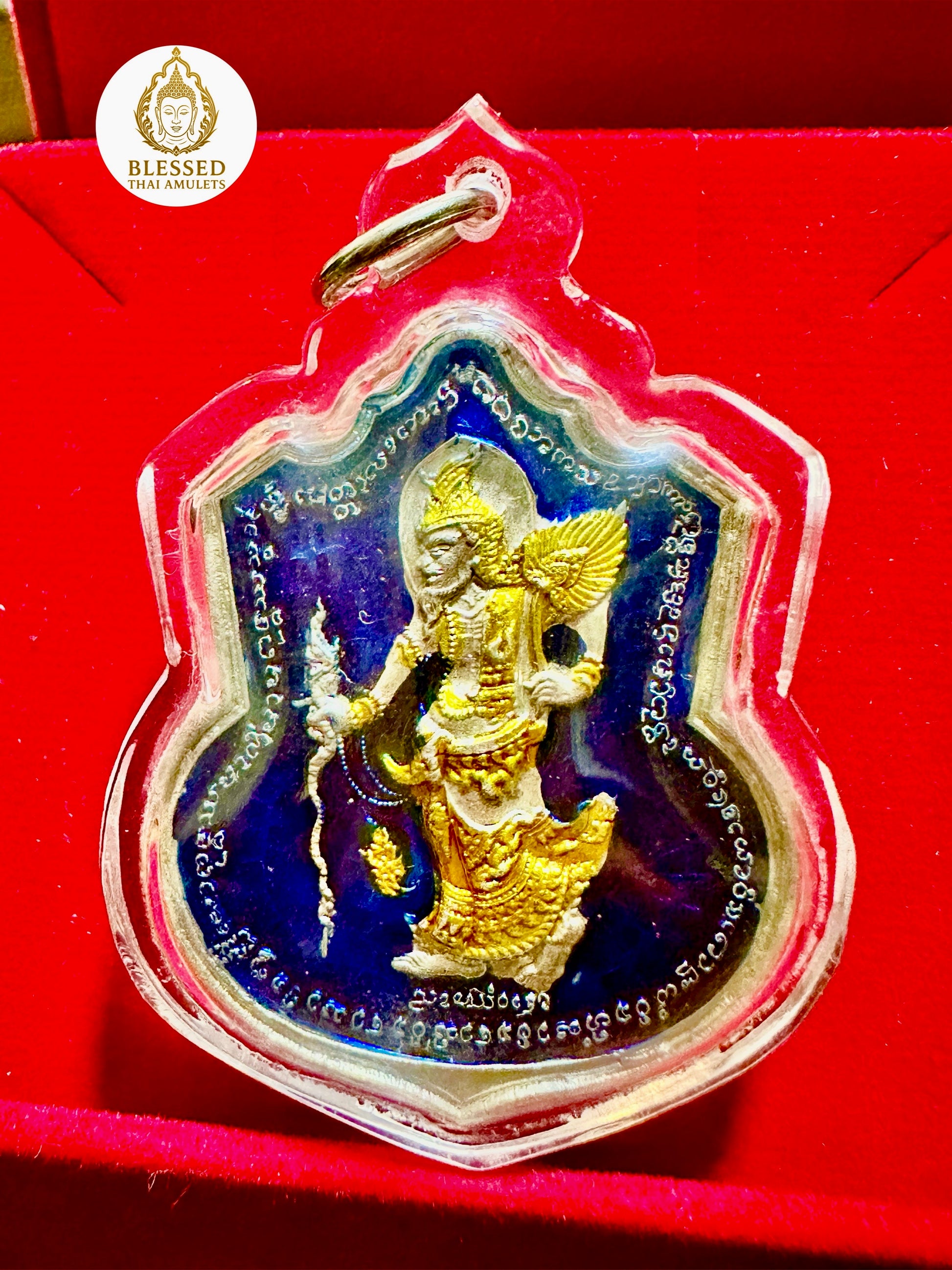 Surrounding the figure is an ornate ring of ancient Khmer script blessings, enhancing the spiritual aura of the piece. On the reverse is a sacred yantra grid, designed to channel divine energy, guard against harm, and attract auspicious fortune.