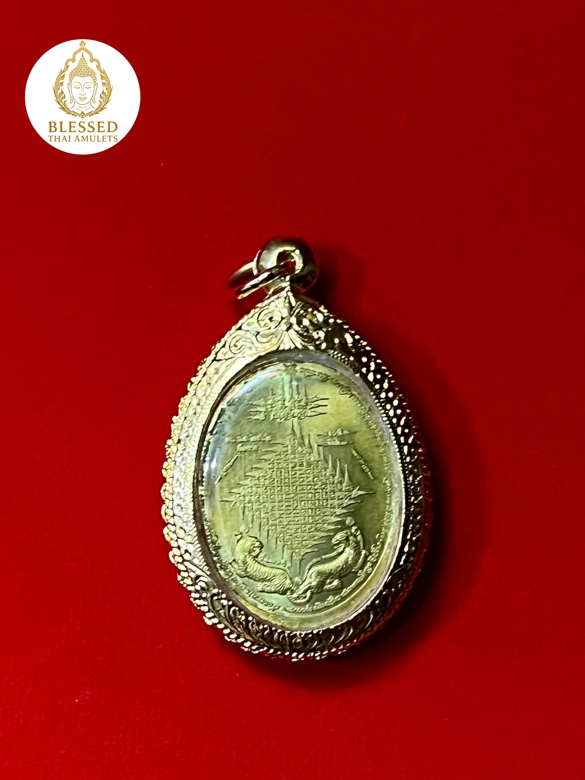 The reverse side features an intricate yantra—a sacred geometric diagram filled with protective energy. At the base, two powerful tigers stand as spiritual guardians, reinforcing the amulet’s commanding energy and aura of invincibility.