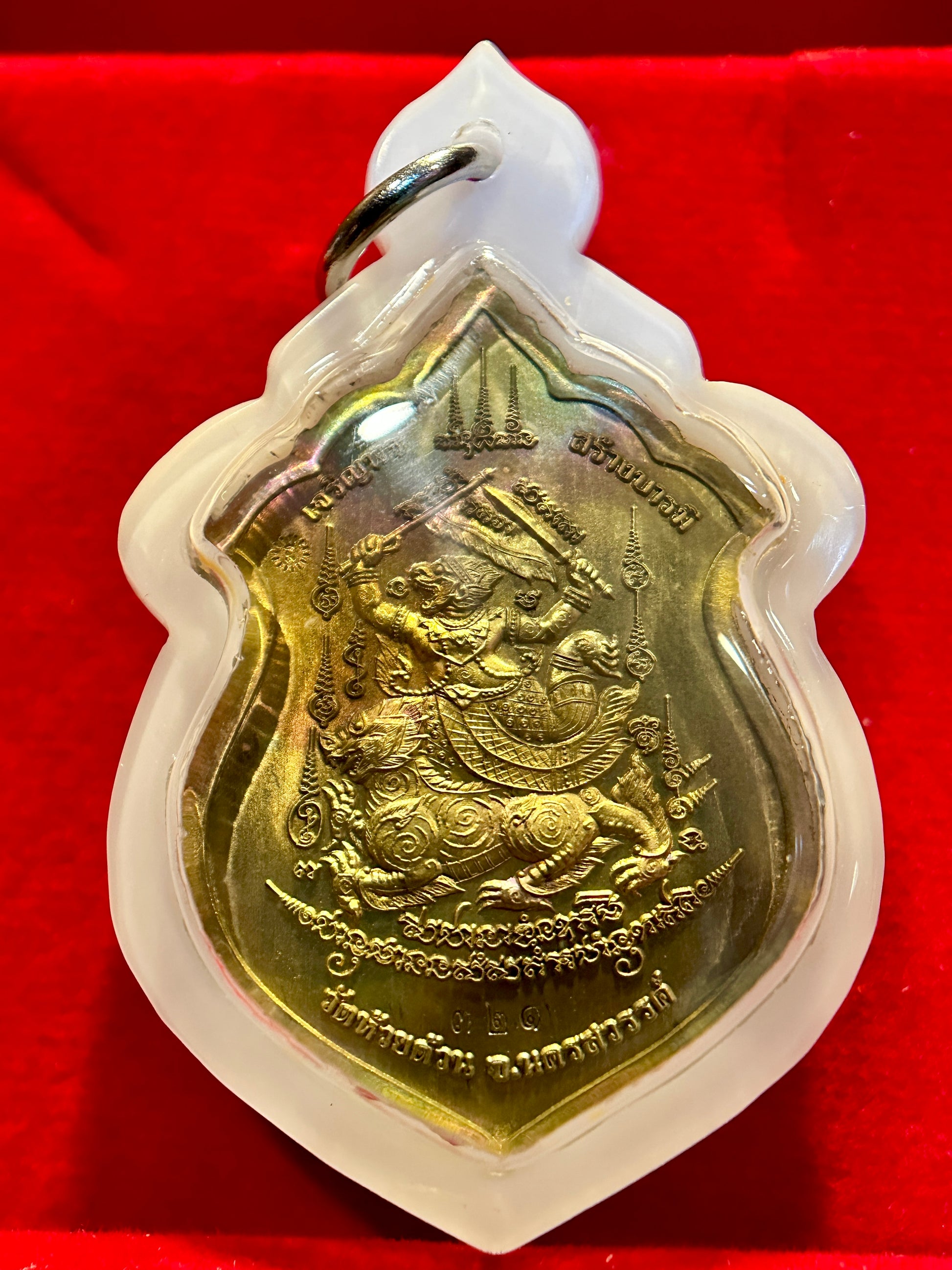 The reverse side reveals a stunning and energetic depiction of Hanuman, the divine monkey warrior, charging into battle while riding a Singha, the mythical lion-like creature that represents strength, protection, and noble leadership. This combination reflects not only Hanuman’s legendary bravery and loyalty but also the elevated power granted when paired with Singha’s regal force.