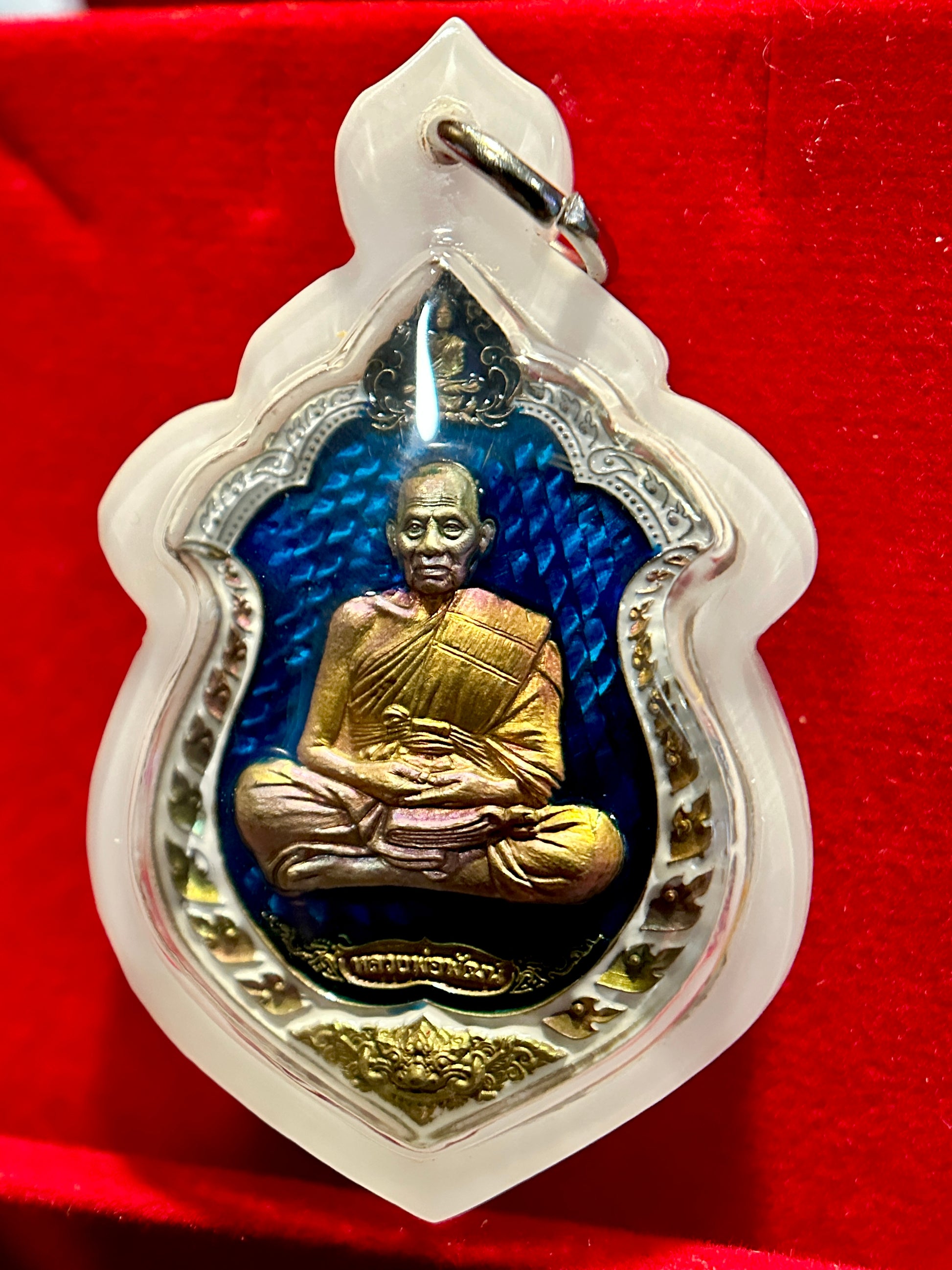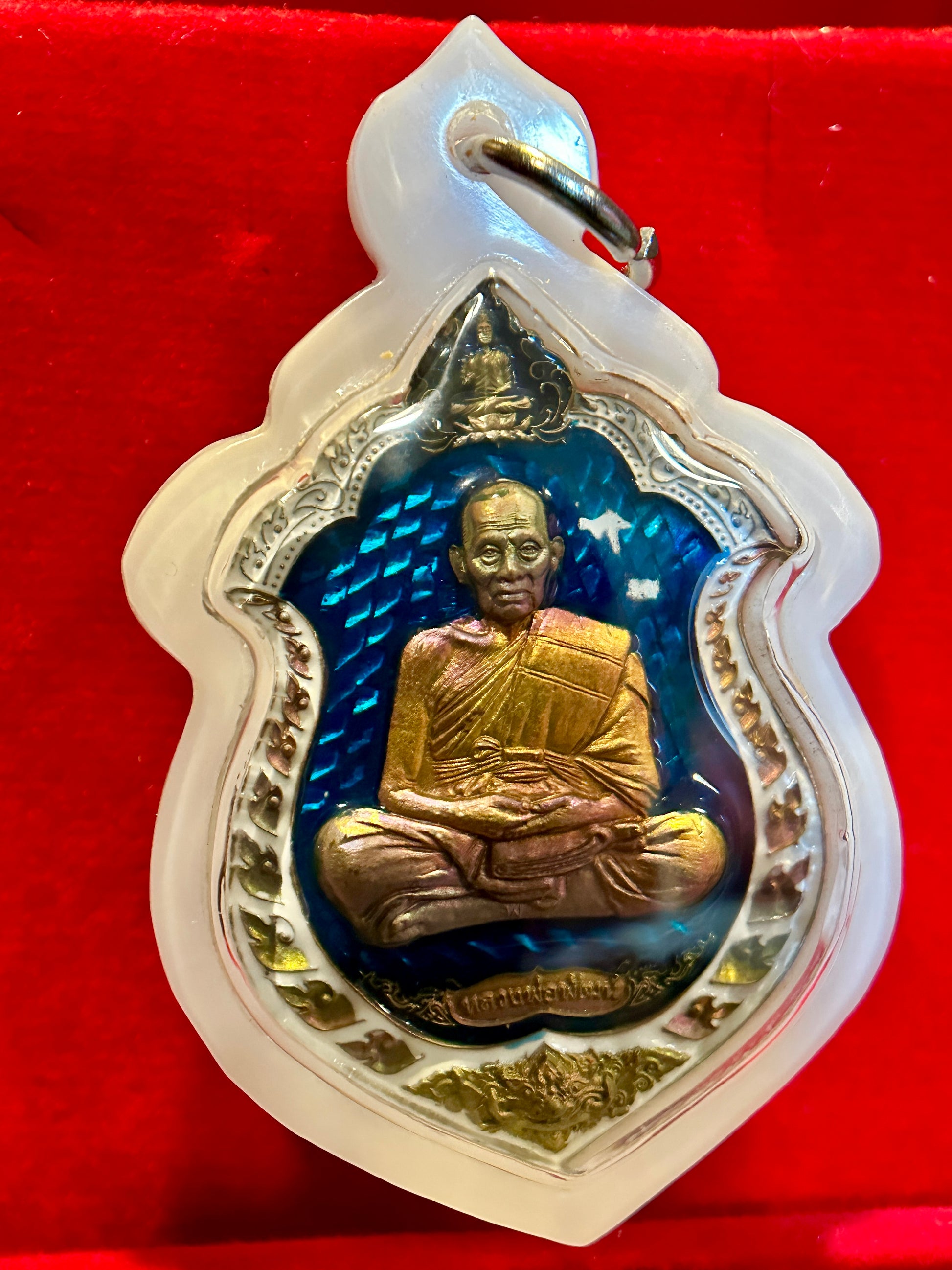 - Front: Luang Phor Moon in peaceful meditative form over a blue enamel backdrop