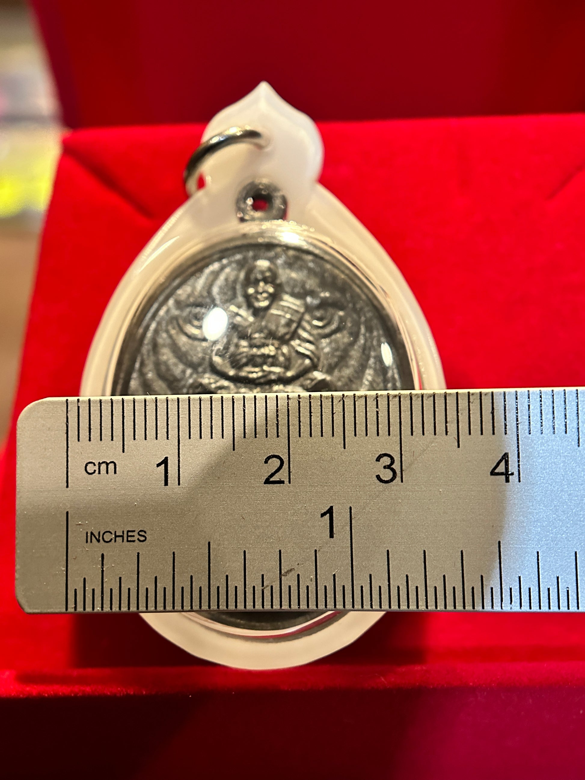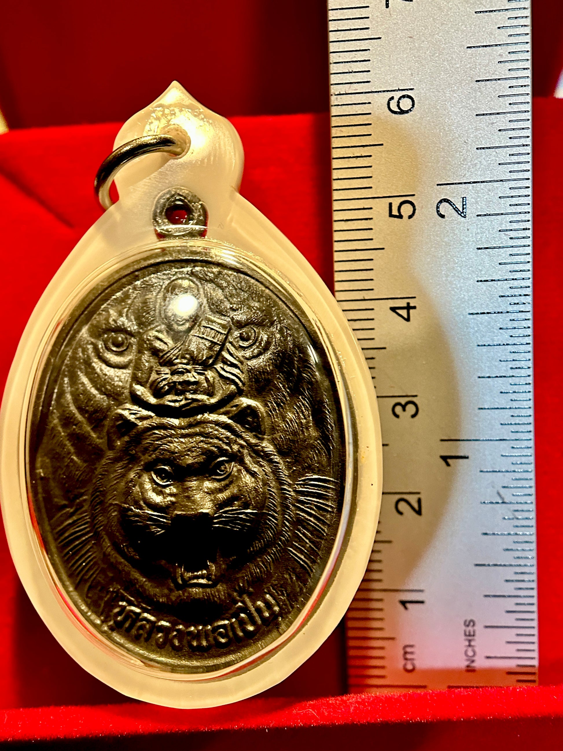 This powerful amulet features the iconic Luang Phor Pern (หลวงพ่อเปิ่น), one of Thailand’s most revered monks for tiger magic (พุทธคุณเสือ) and protection spells. Cast in a dark gunmetal finish, the front showcases Luang Phor Pern seated atop a fierce tiger’s head, with tiger eyes faintly visible in the background, adding mystical depth and intensity to the design.