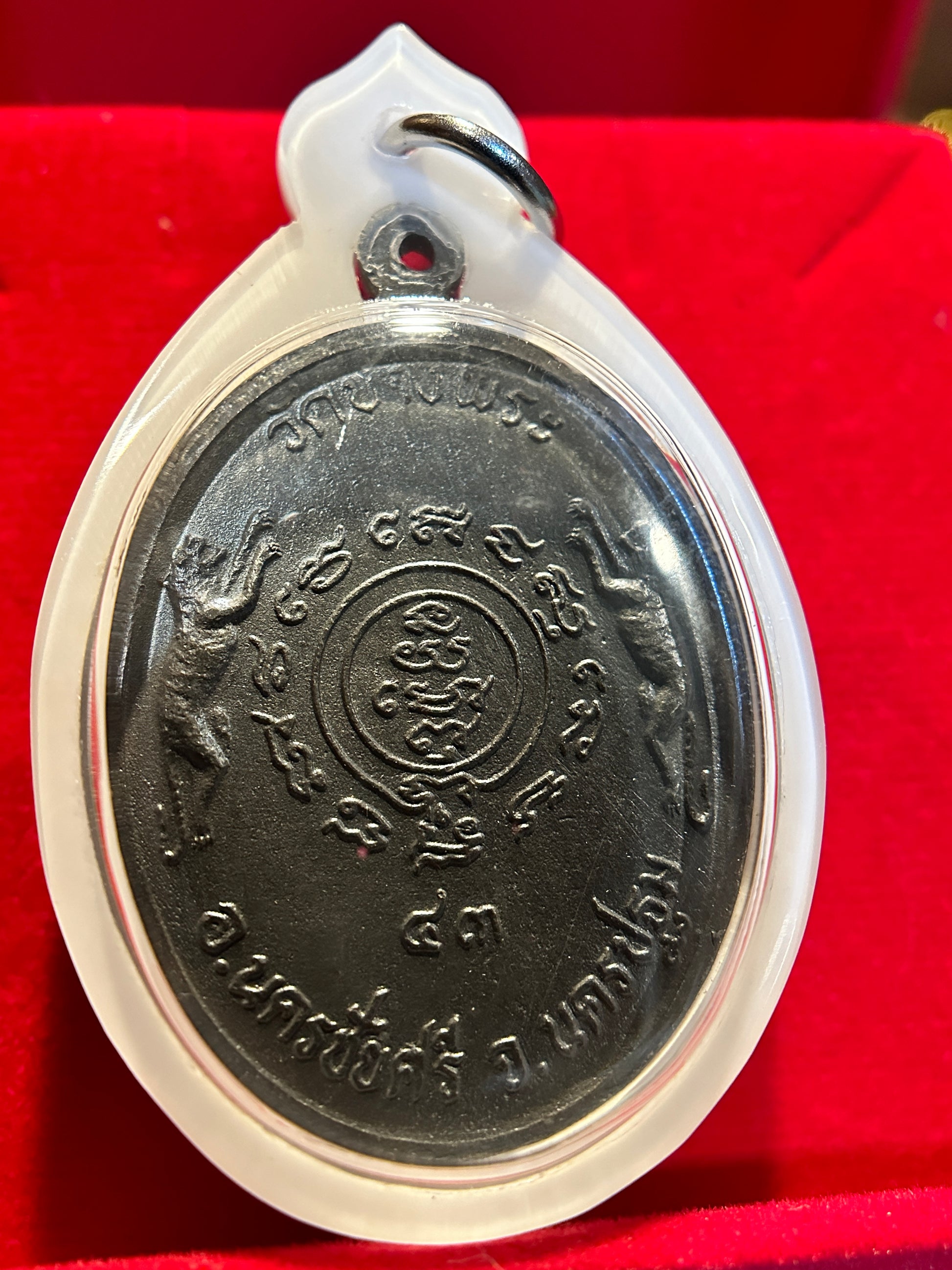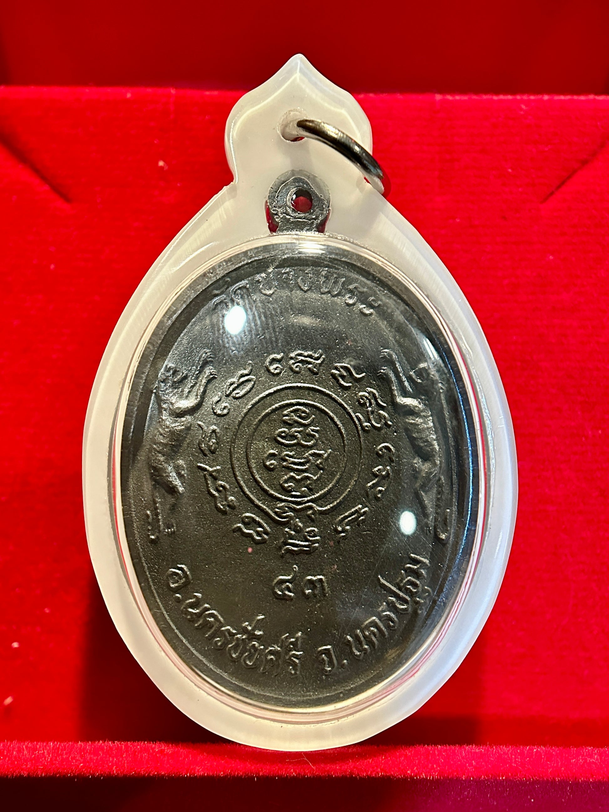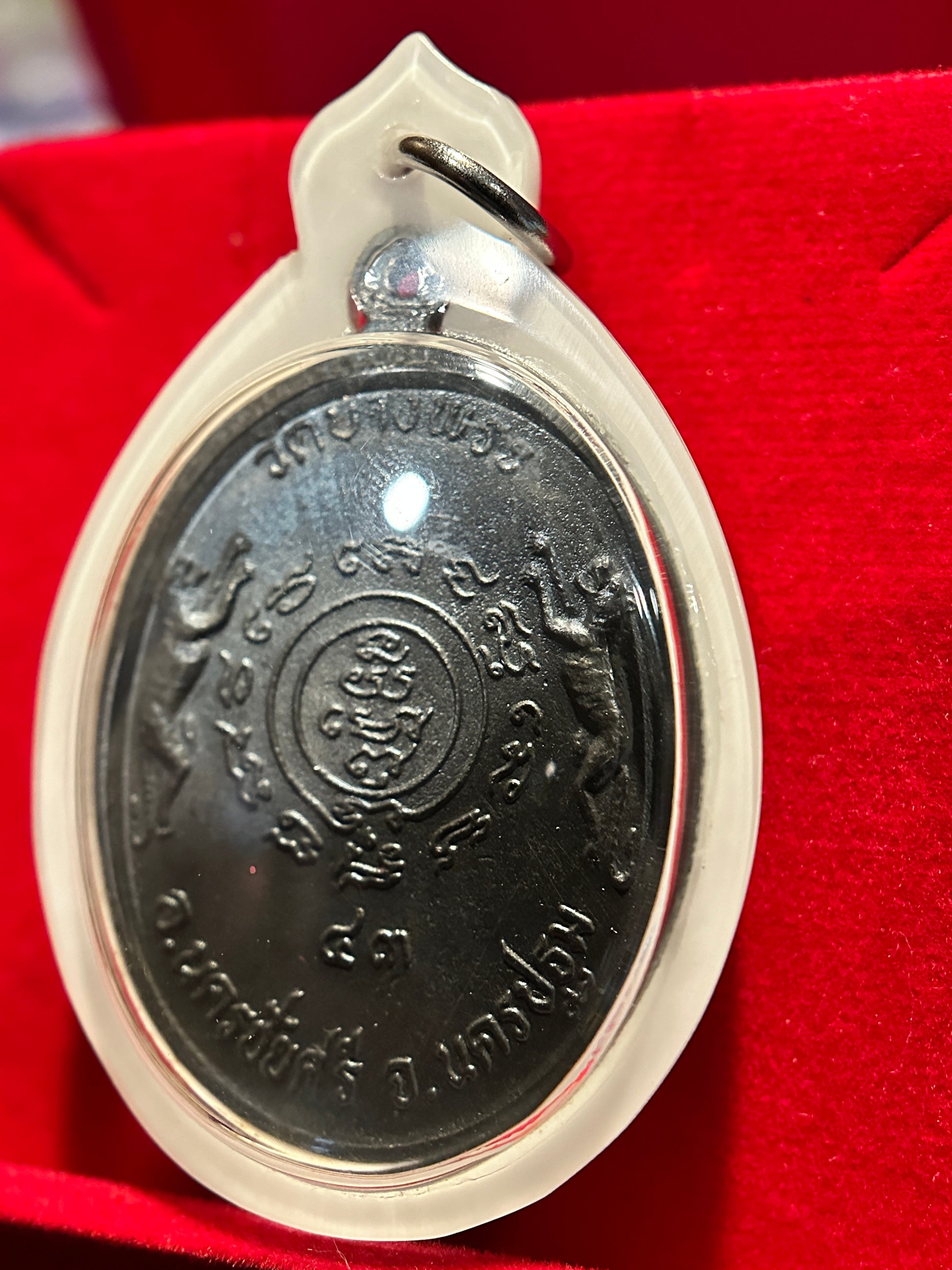 The reverse side features sacred yantra script and twin animal guardians, enhancing the amulet’s spiritual power and invoking protection from danger, bad luck, and black magic. This piece hails from Wat Bang Phra lineage, a temple renowned for its sak yant tattoos and talismans of spiritual strength.