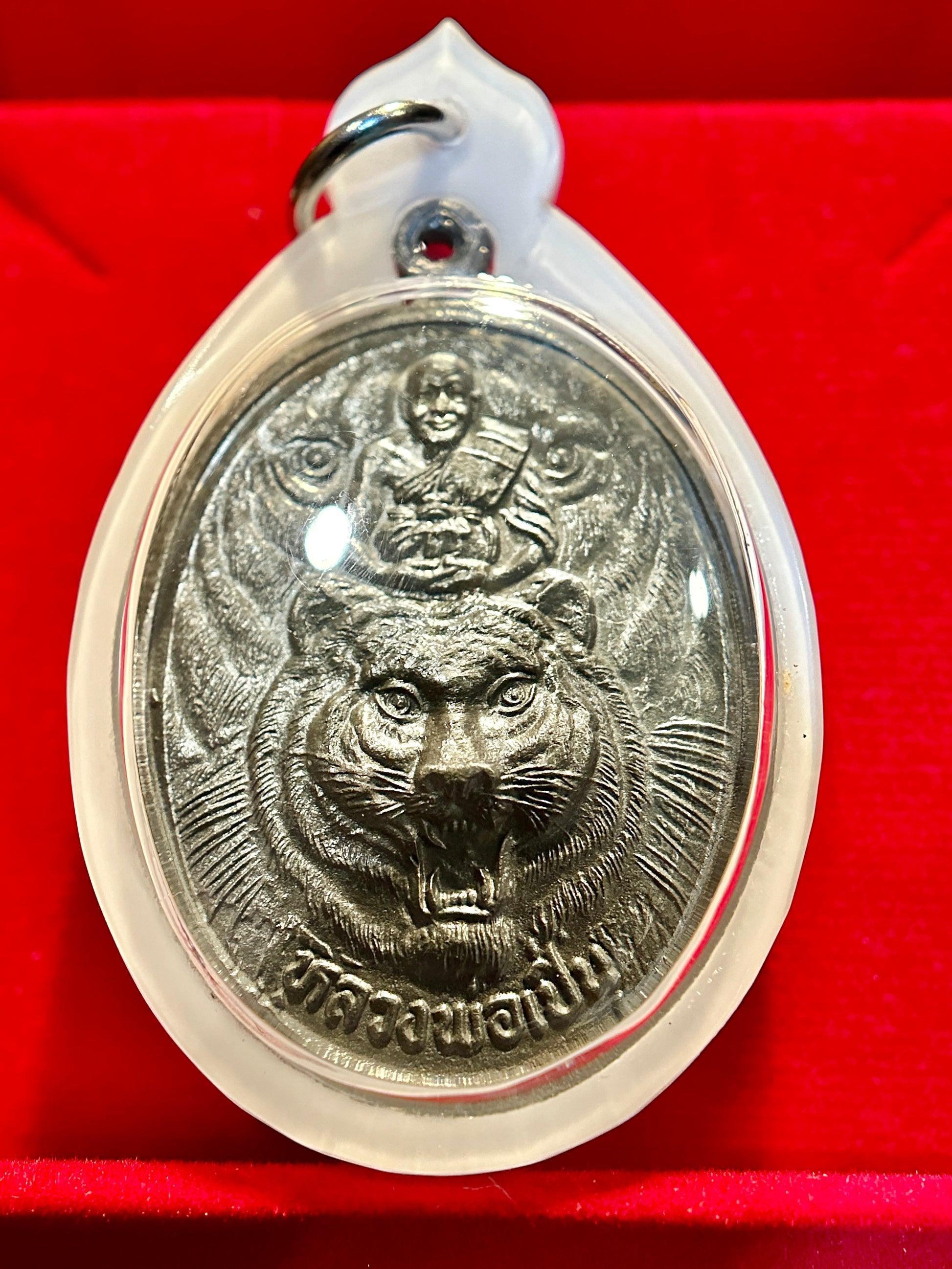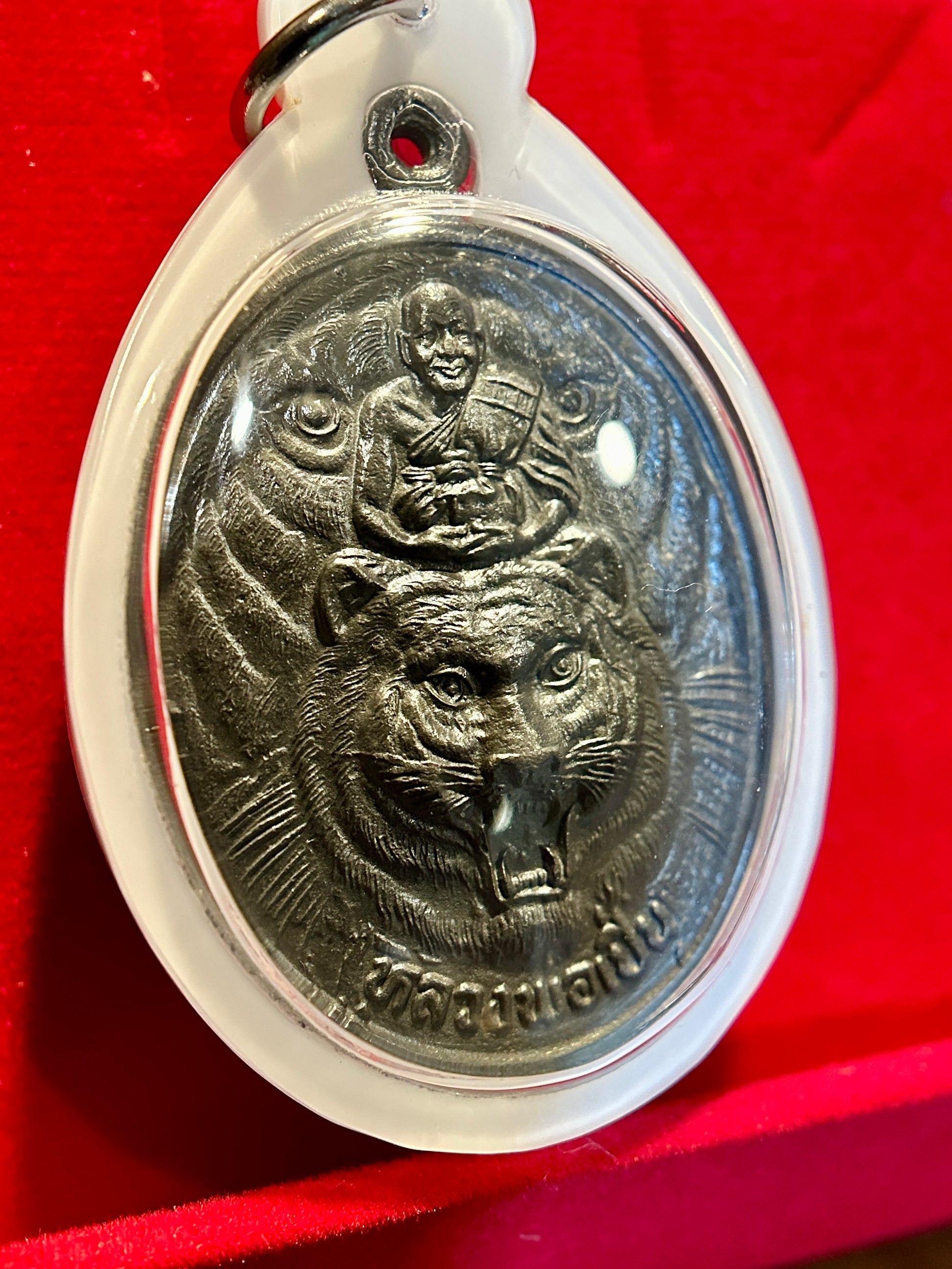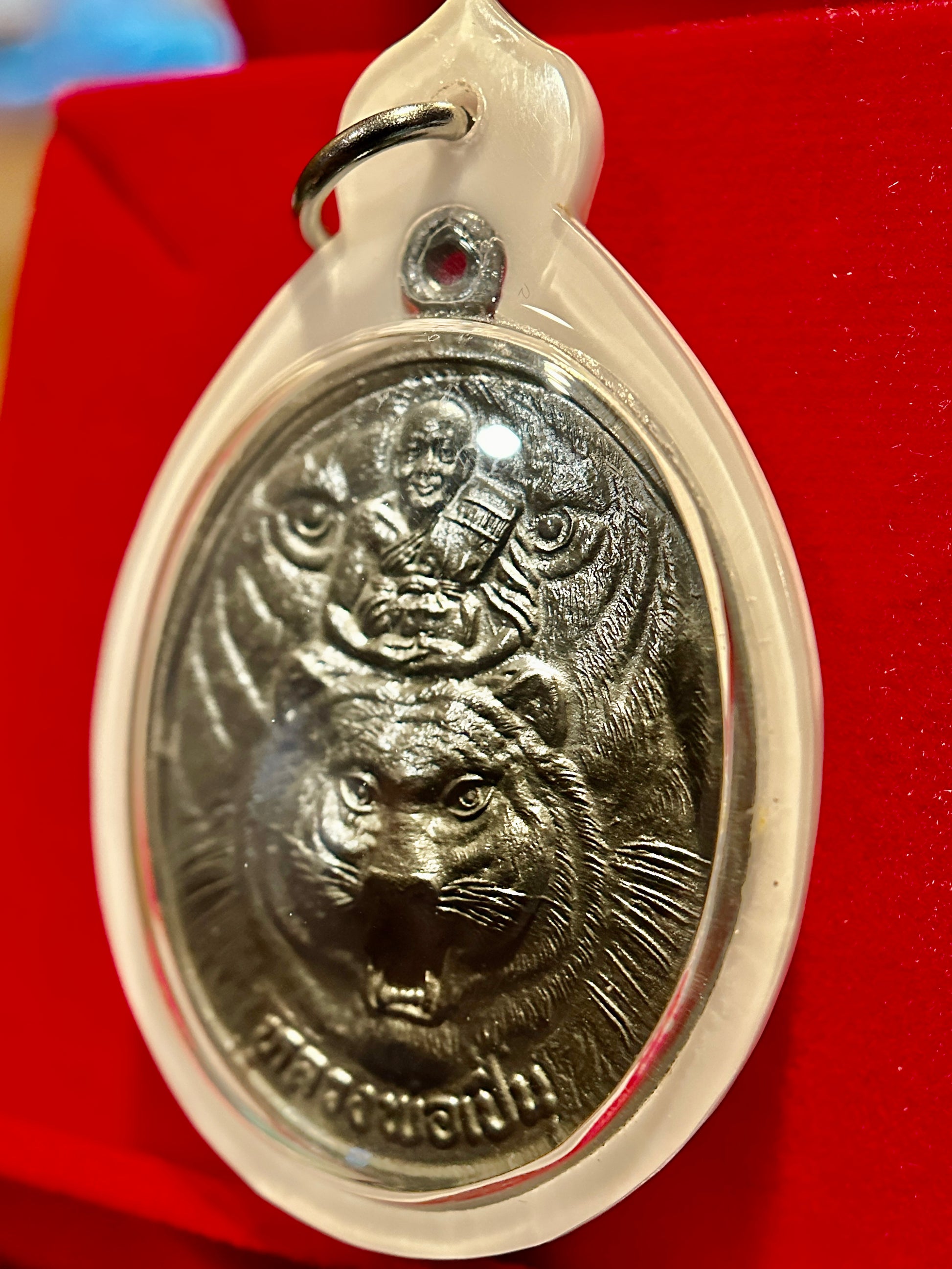 🔸 Front: Luang Phor Pern seated on tiger’s head, with tiger imagery in the background