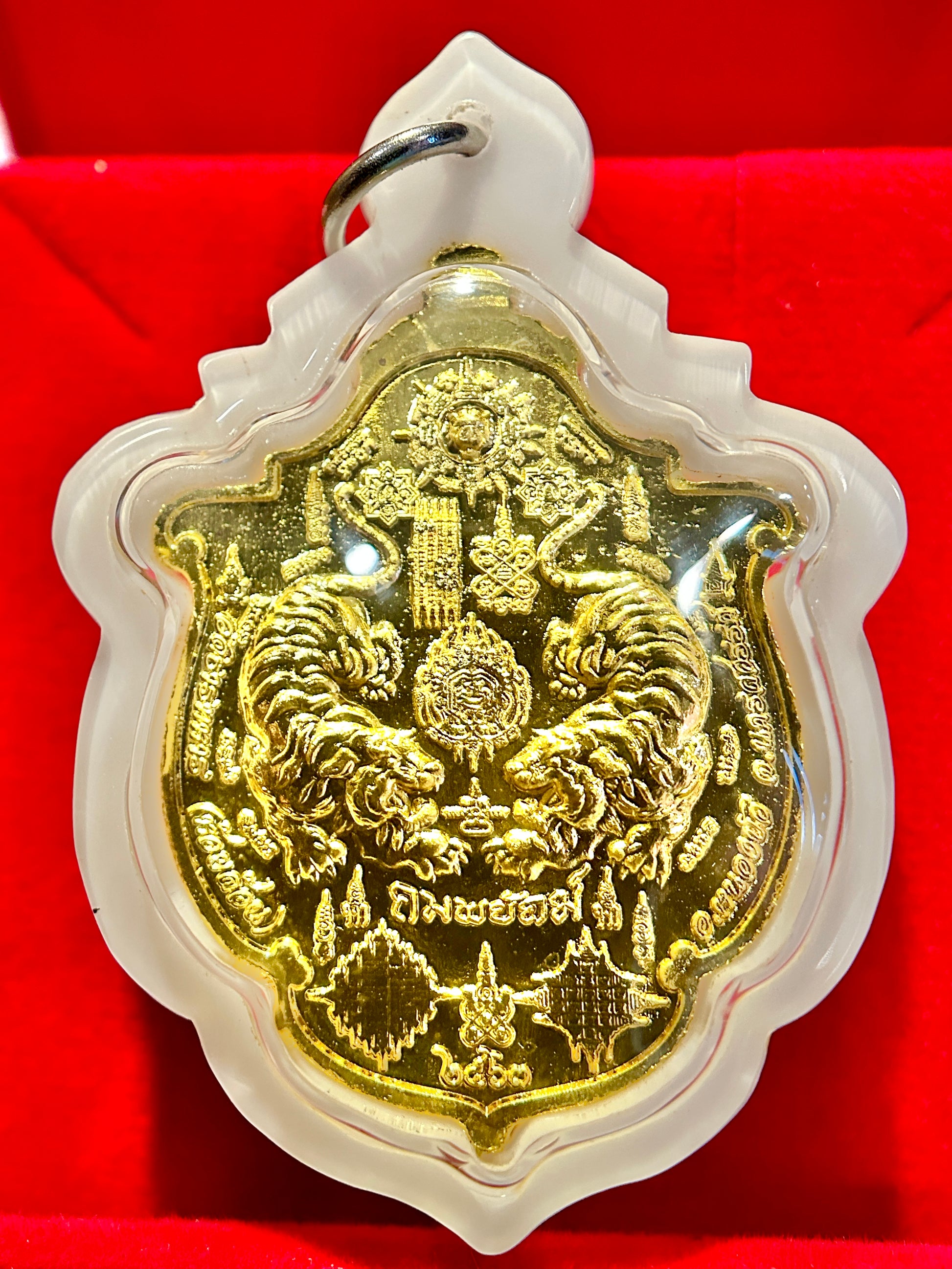 The reverse side is equally striking, showcasing two powerful tigers facing each other amidst yantra symbols and sacred inscriptions. The word “Sinlapachai” is inscribed in Thai, signifying victory and auspicious success. This amulet embodies dominance, invincibility, and sacred charm—ideal for those seeking protection, good luck, and personal power.