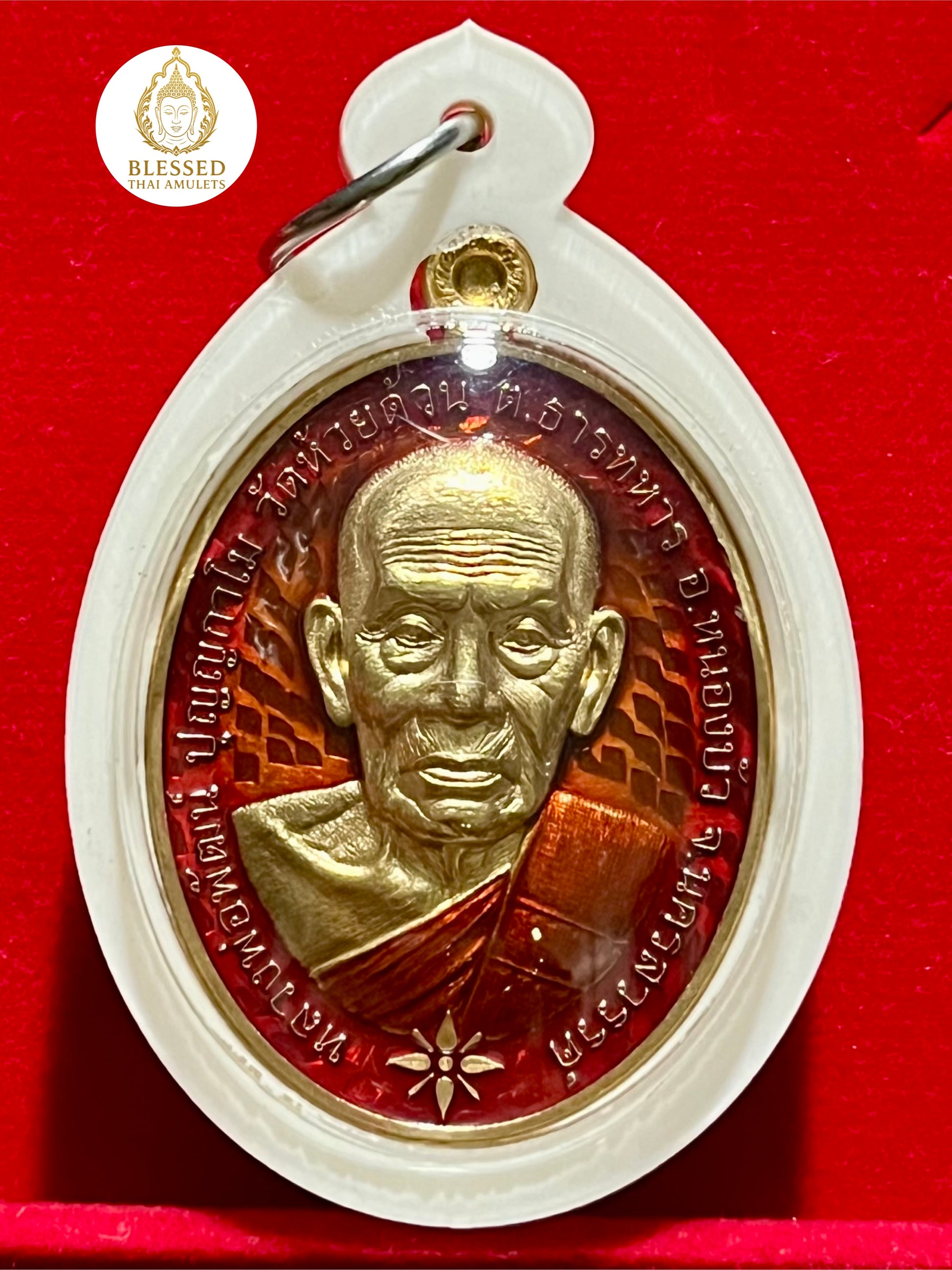 This beautifully detailed Thai amulet honors Luang Phor Phat of Wat Huay Duan, a highly respected monk known for his deep spiritual power and protective blessings. His golden image radiates wisdom and calm against a deep red background, symbolizing clarity and inner strength.