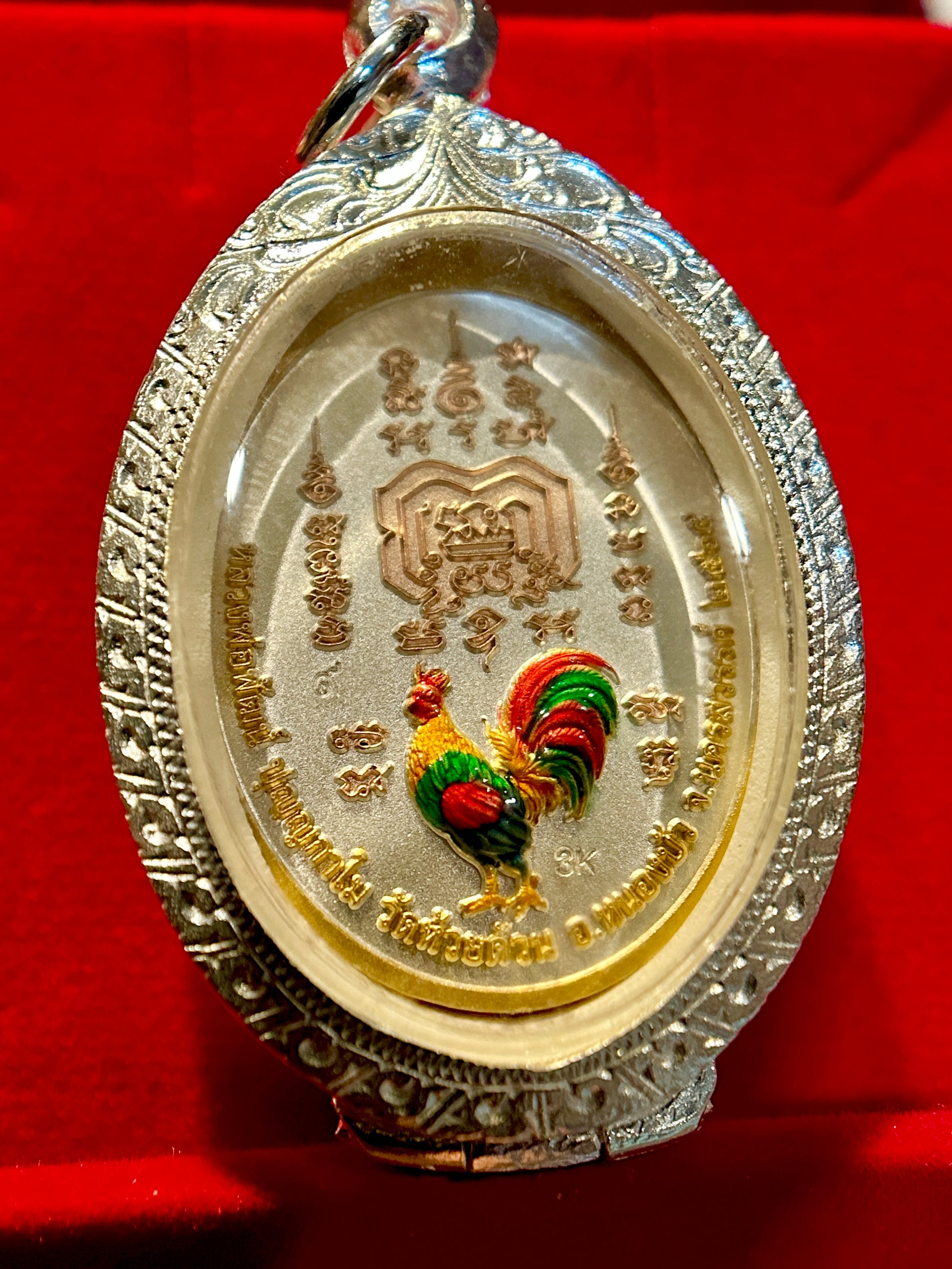 Encased in a premium engraved silver case, this amulet blends traditional temple symbolism with bold color and refined craftsmanship.