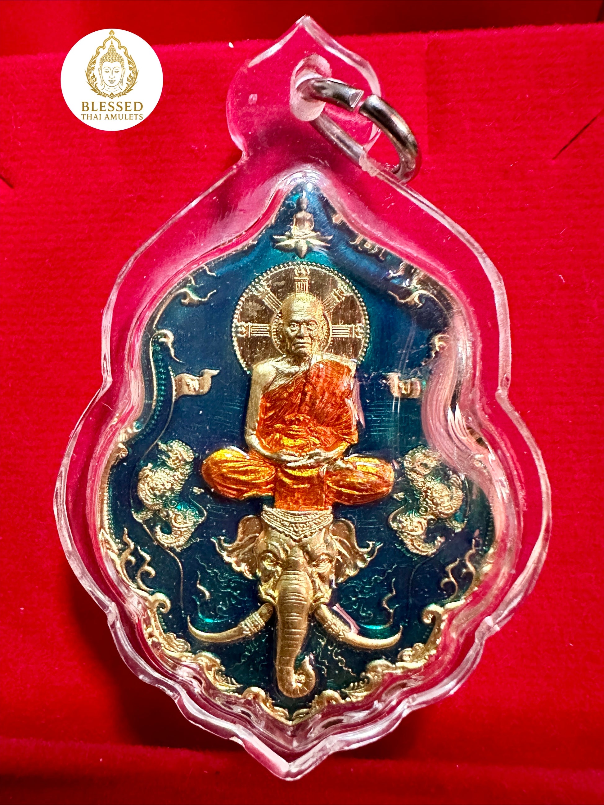 This radiant Thai amulet features Luang Phor Phat (หลวงพ่อพัฒน์ ปุณญกาโม) of Wat Huai Duan seated in deep meditation atop Erawan, the celestial three-headed elephant. The backdrop shimmers in deep blue with twin mythical creatures flanking the monk — symbols of spiritual guardianship and auspicious power. Encircling his head is a radiant sak yant-style halo, amplifying the aura of divine wisdom and ancient blessings.